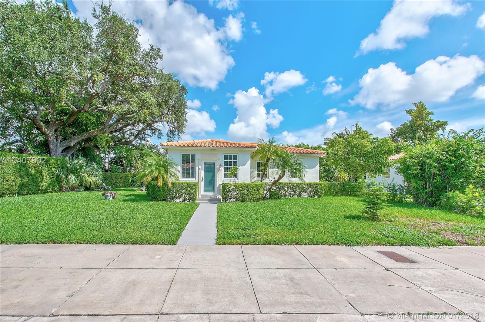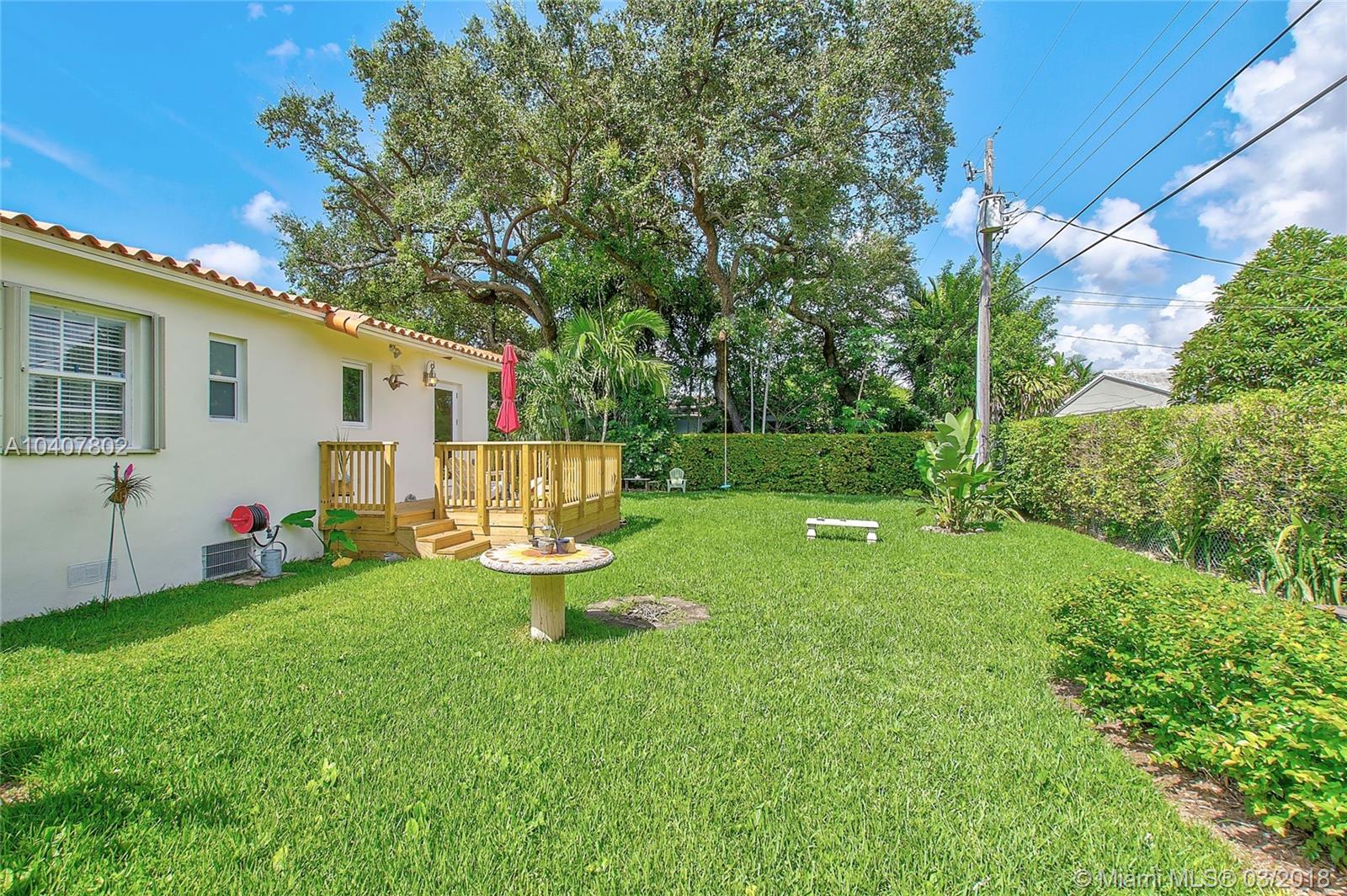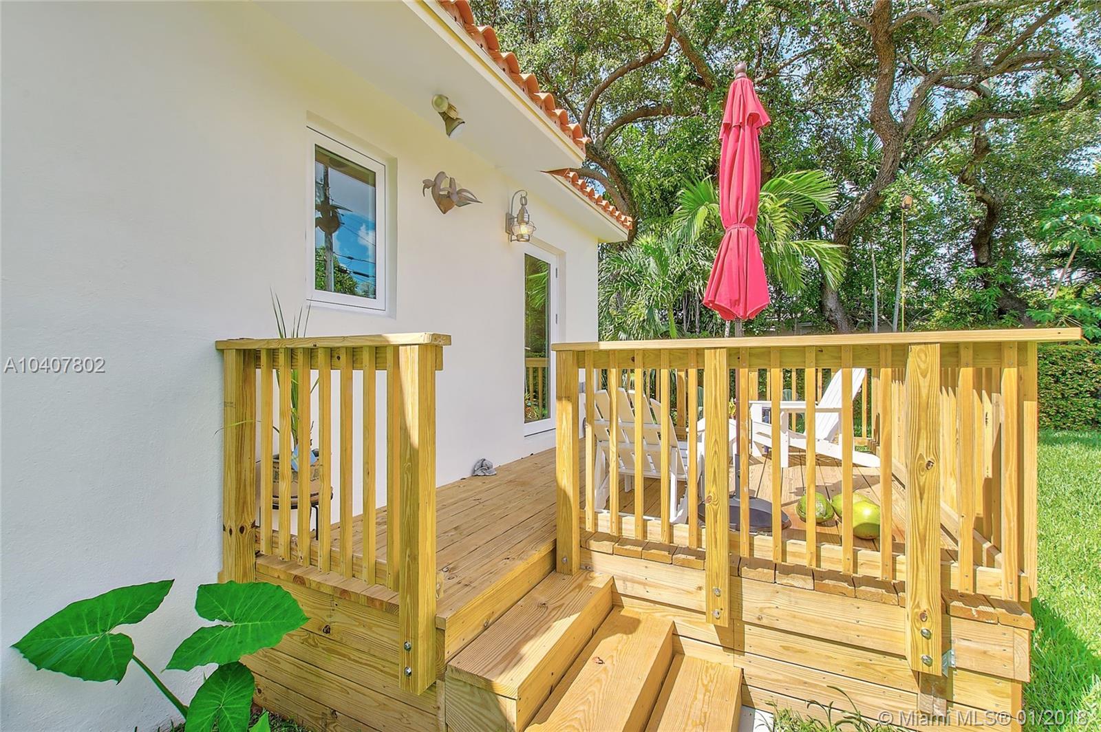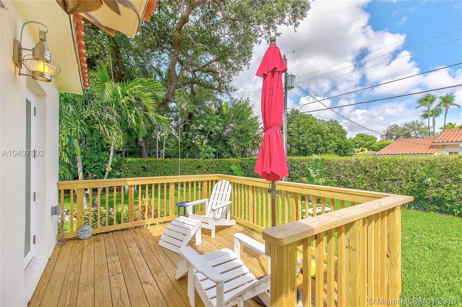 Charm, comfort, updates, and community await the savvy buyer for this three bedroom home set on landscape double lot nestled in a lovely neighborhood. Custom kitchen featuring geostone countertops and chic cabinets and lighting. Sun drenched foyer with maple floor. European style bathroom with porcelain tile shower and marble floor. New electrical 200 amp panel with underground connectivity from FPL. New HVAC unit sized for future home expansion. Oak hardwood floors through out BR, LR/DR. Additional 120 foot deck for entertaining. Impact windows and doors. Short walk to Coral Gables trolley and the Miami trolley stop is at the corner.
