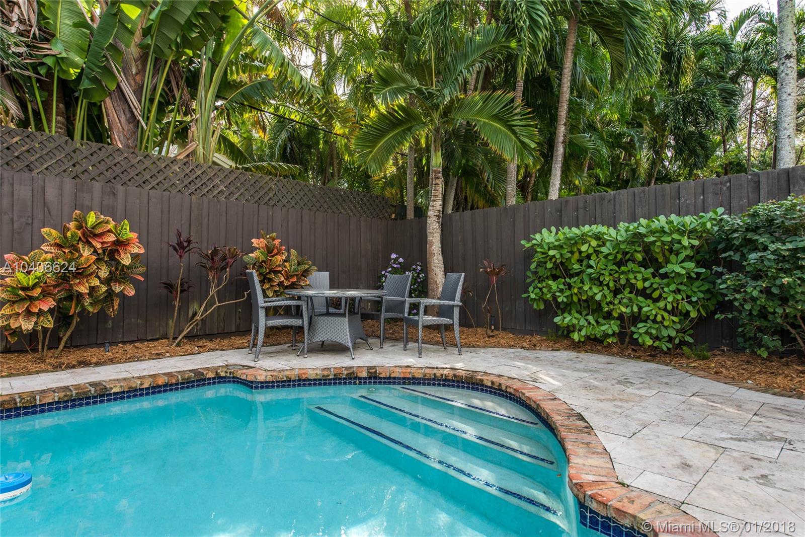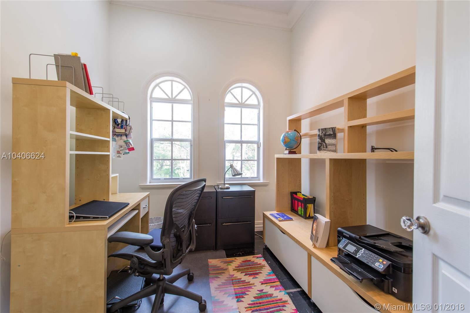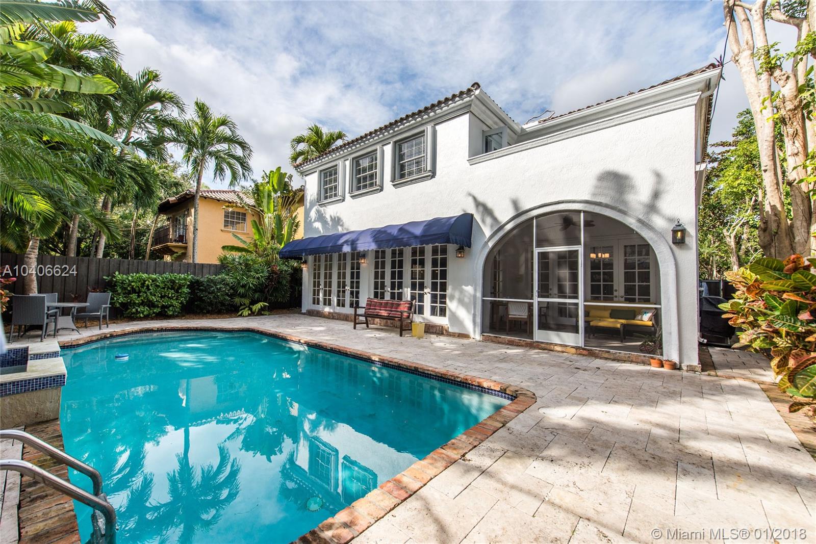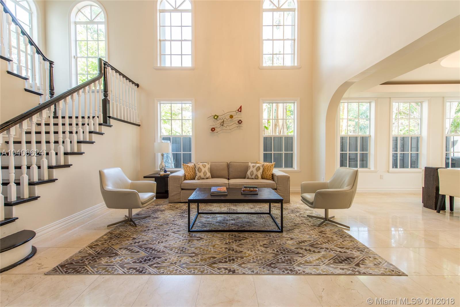 Lovely European-inspired home in lush South Coconut Grove. Dramatic double-height ceilings and clerestory windows create light-filled living spaces w/ a blend of classic and contemporary architectural features. Renovated in 2009. Expansive formal living & dining rooms overlook tranquil pool surrounded by travertine terrace. Elegant custom kitchen w/ wood cabinetry, granite countertops, top-of-the-line stainless appliances, center island & bar seating. Oversized master suite features separate sitting area, 2 walk-in closets, private terrace & luxurious master bath with spa tub. 3 bedrooms 2 baths + den/office upstairs and 1st floor guest suite. Close to the Grove village center’s galleries, boutiques, cafes and bayfront parks & marinas. Minutes to downtown, MIA, Key Biscayne & the Beaches.