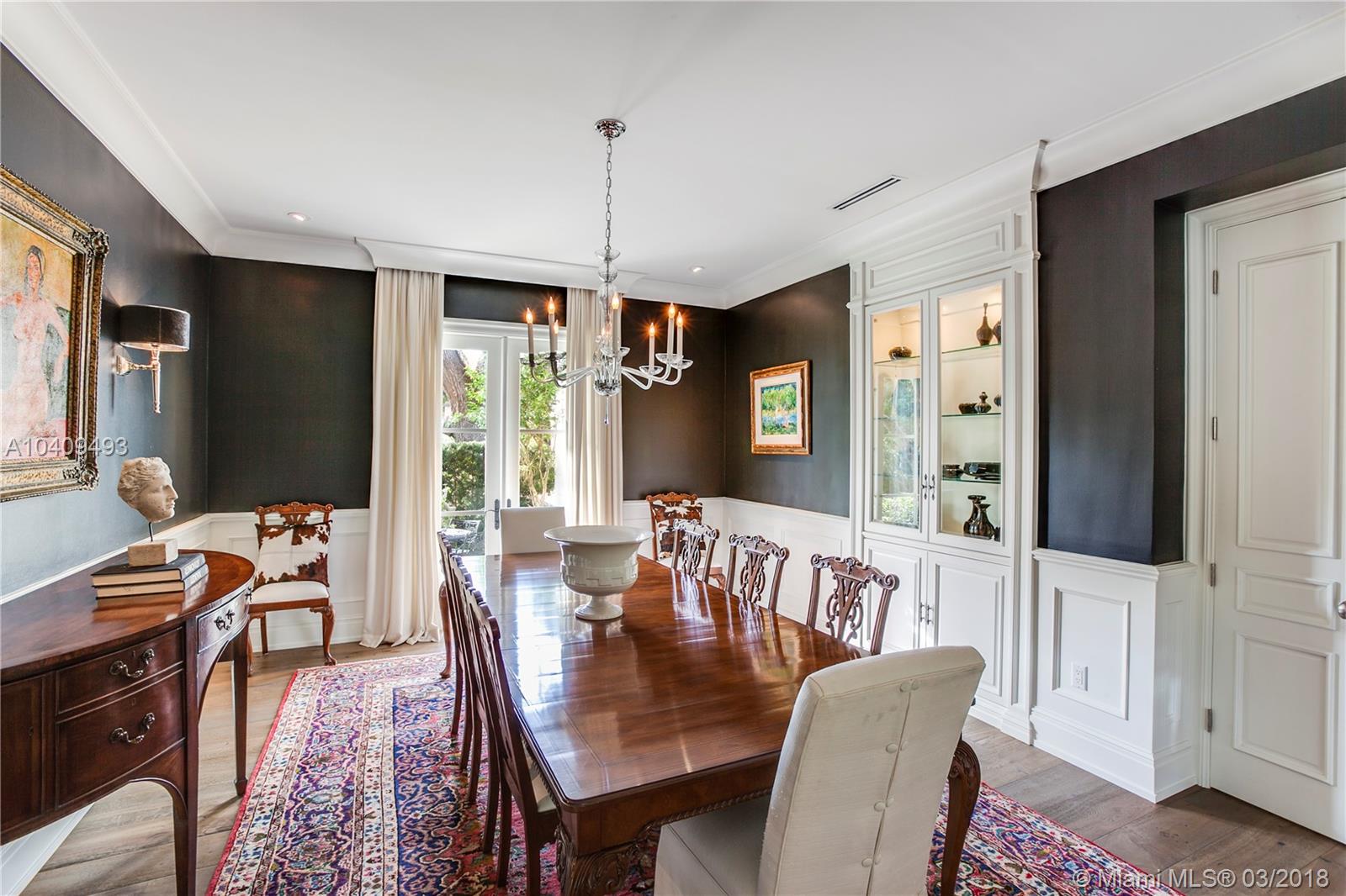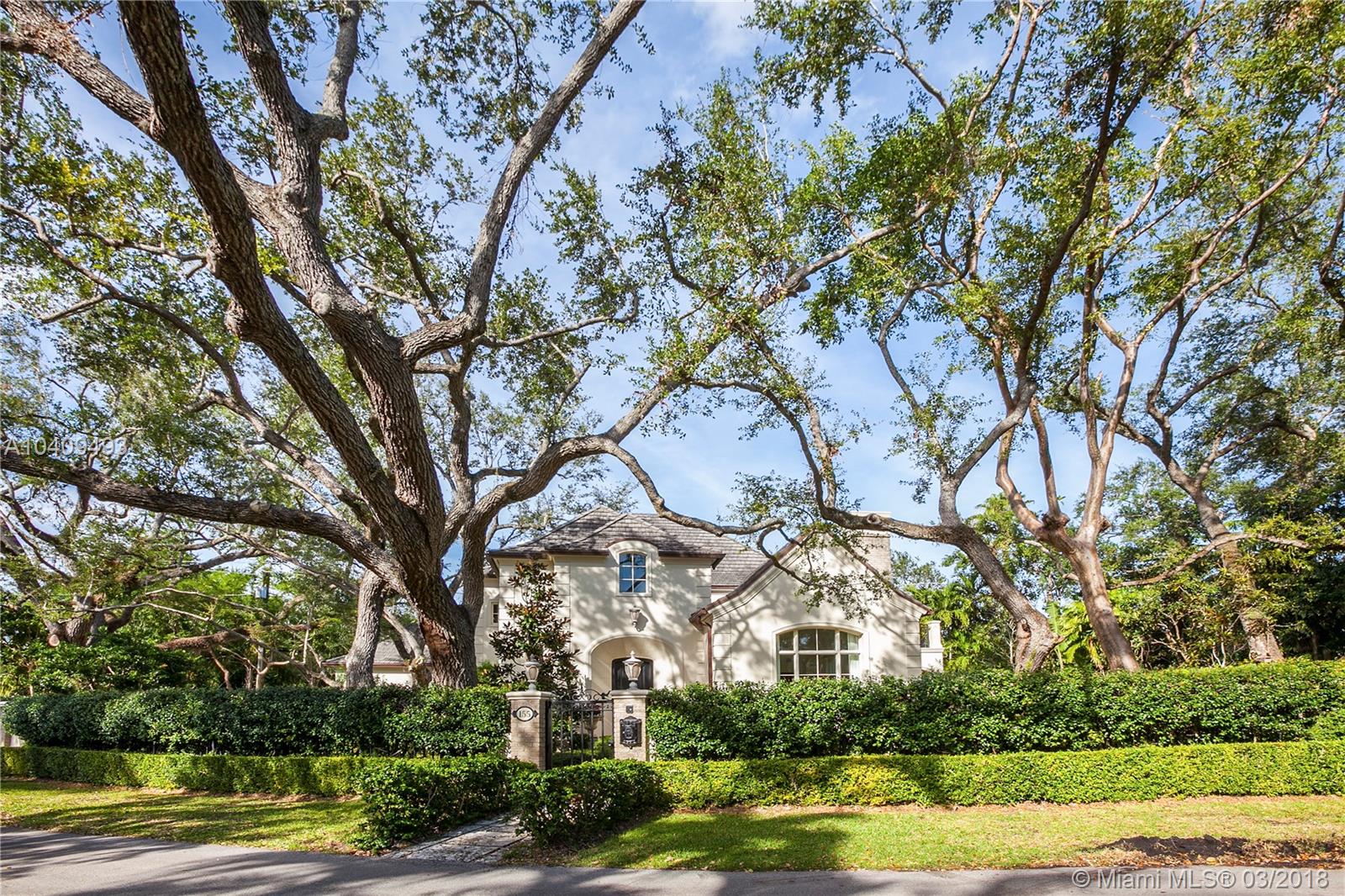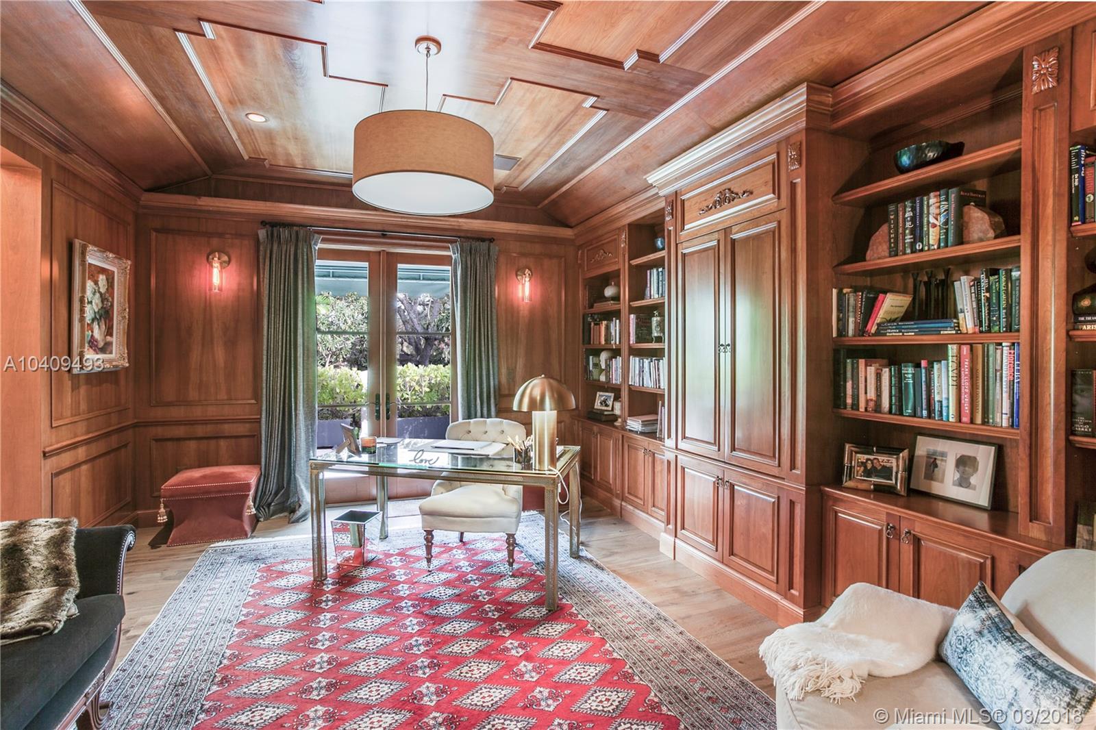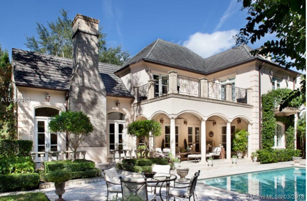 Updated and remodeled in 2016, the two-story 4 bedroom and 4.5 bath French Manor style home boasts a cherry wood paneled library, a 250 bottle wine closet, an elegant wood burning fireplace, vaulted ceilings, impact resistant wood & aluminum clad weather shield windows and doors, hardwood and limestone floors and staircase, central vacuum system, custom built-ins and light fixtures, hand crafted mosaic work, custom curtains, windows treatments and elaborate millwork. The oversized kitchen is enhanced with top of the line Wolf and Sub-zero appliances, a wine chiller, custom cabinetry with ample storage and features detailed wood cove ceilings. Outdoor resort style living space with heated pool, large terraces, lush landscaping w/custom lighting & fountains.