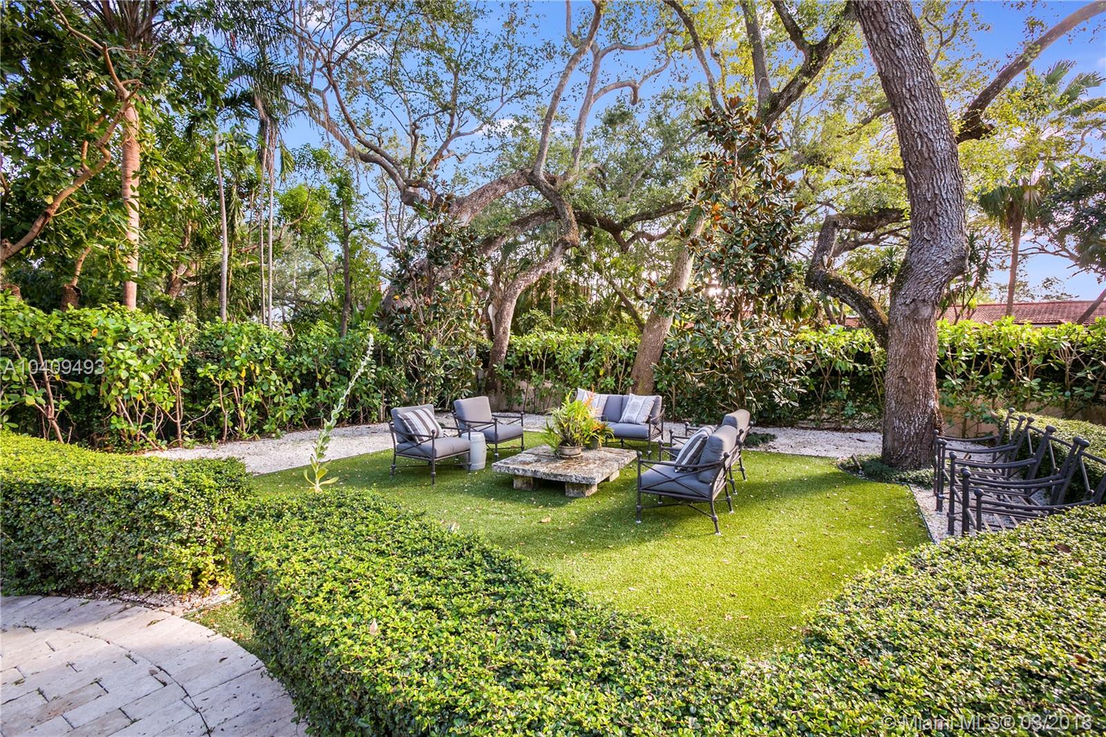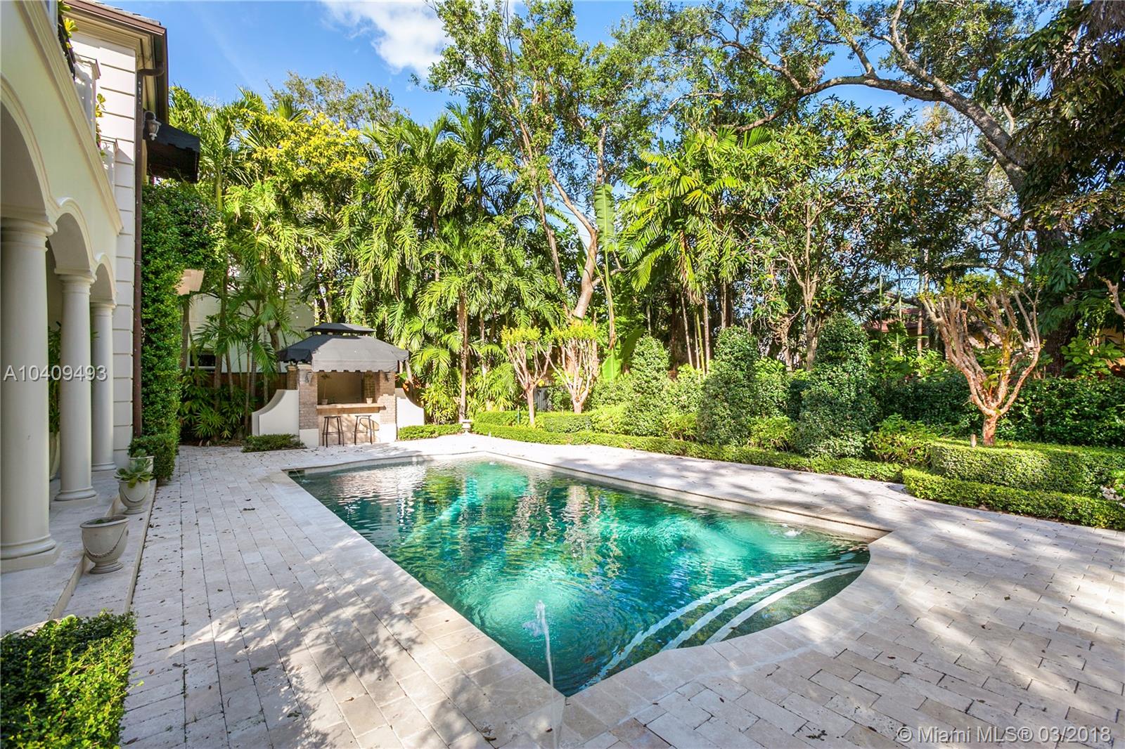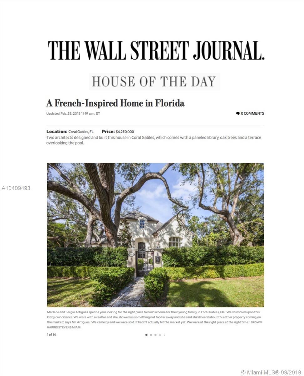 Updated and remodeled in 2016, the two-story 4 bedroom and 4.5 bath French Manor style home boasts a cherry wood paneled library, a 250 bottle wine closet, an elegant wood burning fireplace, vaulted ceilings, impact resistant wood & aluminum clad weather shield windows and doors, hardwood and limestone floors and staircase, central vacuum system, custom built-ins and light fixtures, hand crafted mosaic work, custom curtains, windows treatments and elaborate millwork. The oversized kitchen is enhanced with top of the line Wolf and Sub-zero appliances, a wine chiller, custom cabinetry with ample storage and features detailed wood cove ceilings. Outdoor resort style living space with heated pool, large terraces, lush landscaping w/custom lighting & fountains.