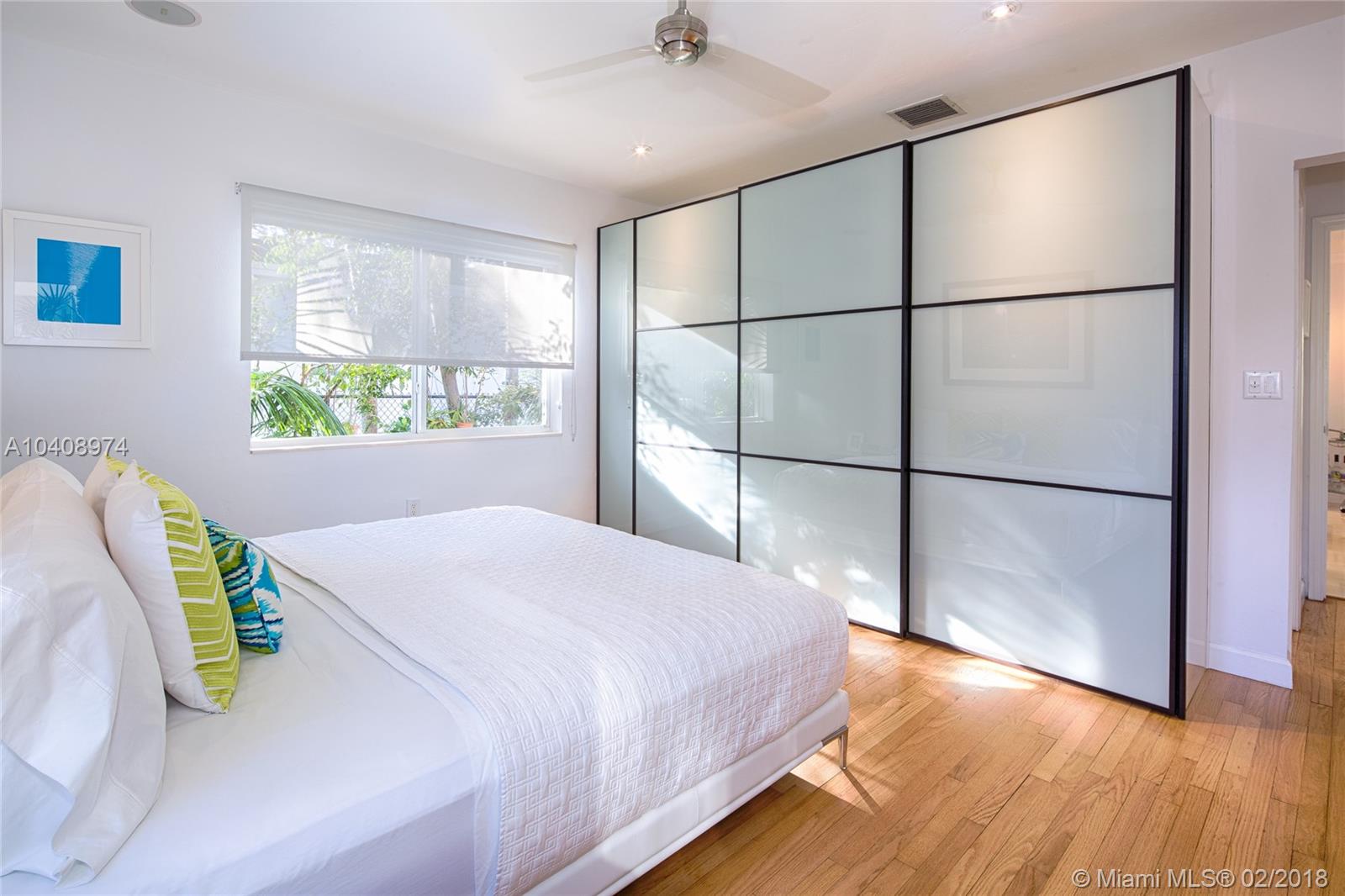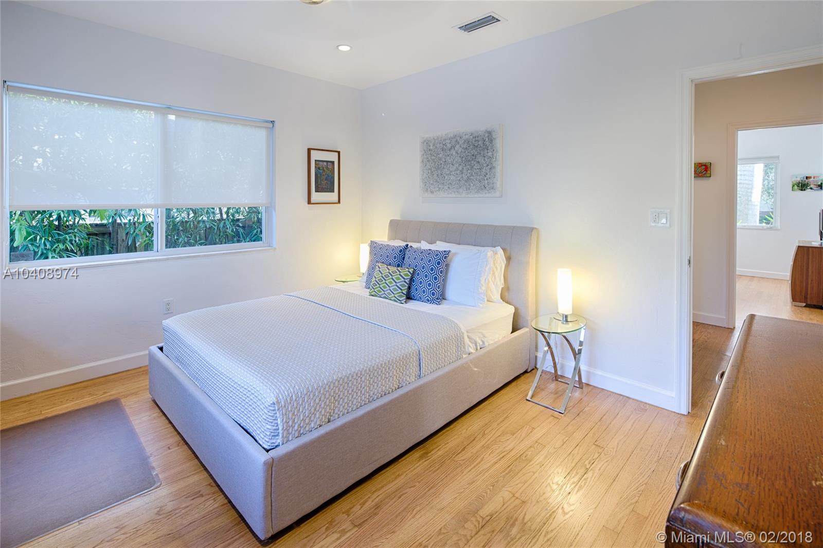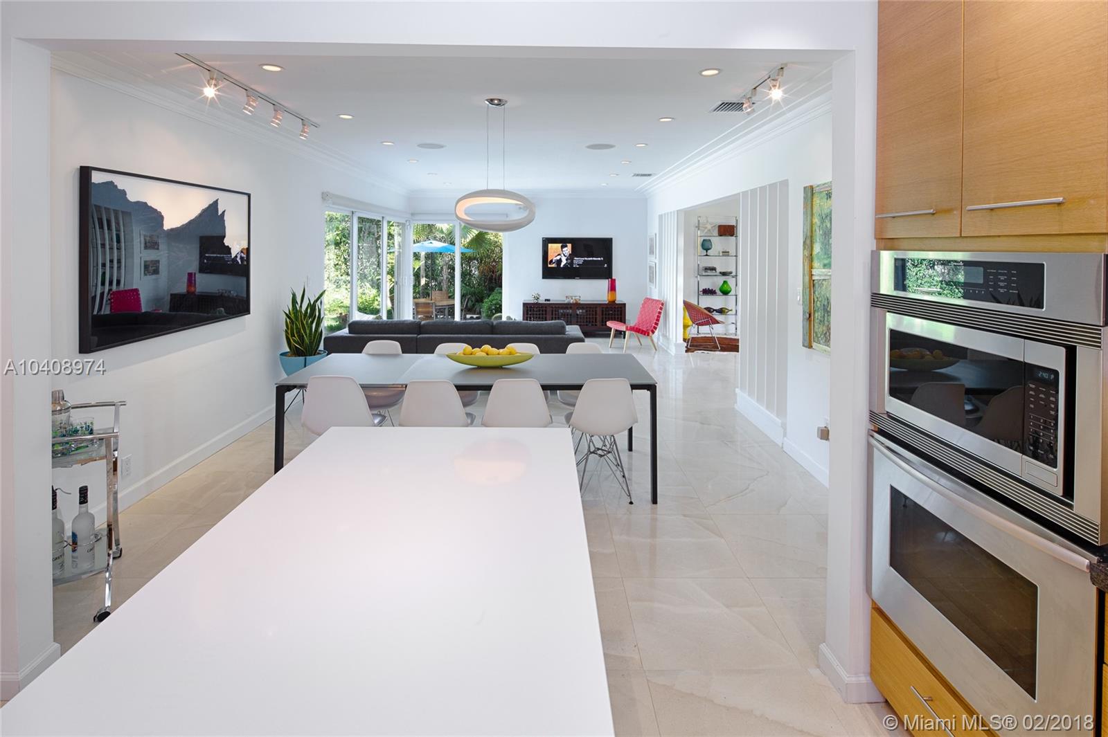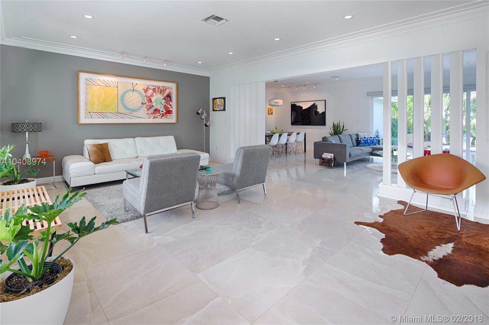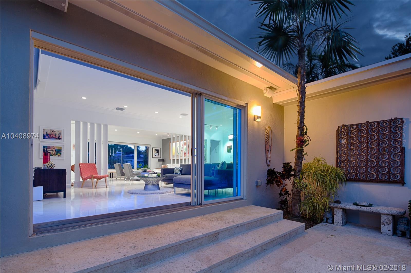 This Exquisitely updated Midcentury inspired home is just a block from Biscayne Bay, carefully modernized to achieve a new level of luxury living in Miami Shores. This 3 bedroom/2 bath home exudes tropical elegance with a botanical garden inspired landscape and Café Imperial limestone floors. Stunning views through large sliding doors transform the space into a true in/outdoor living experience. A boutique Hotel inspired saltwater/heated pool flanked by Philippine shell stone, and Ipe decking. Custom contemporary kitchen has generous white quartz island with top of the line Thermador stainless steel appliances. New roof with warranty, newer Trane AC with warranty, impact glass windows, hardwood flooring, Eco-R30 insulation, 2 car garage with rear entry access, FEMA certified property.