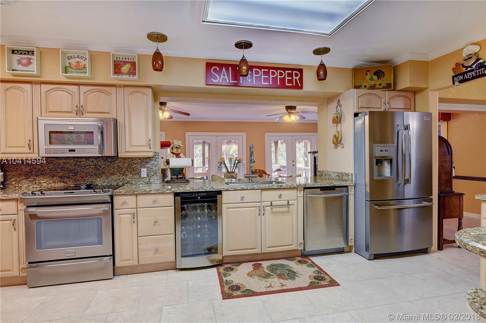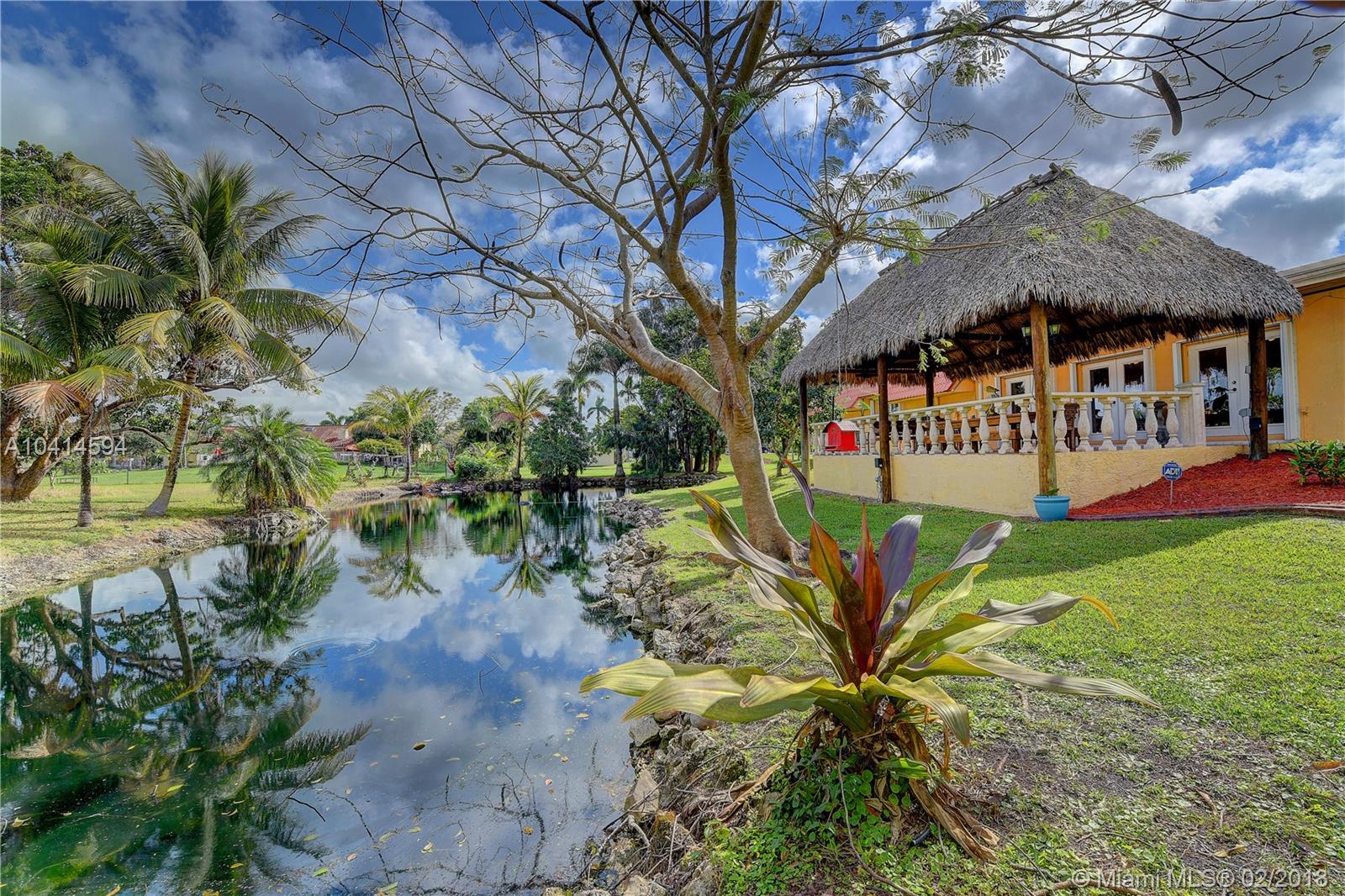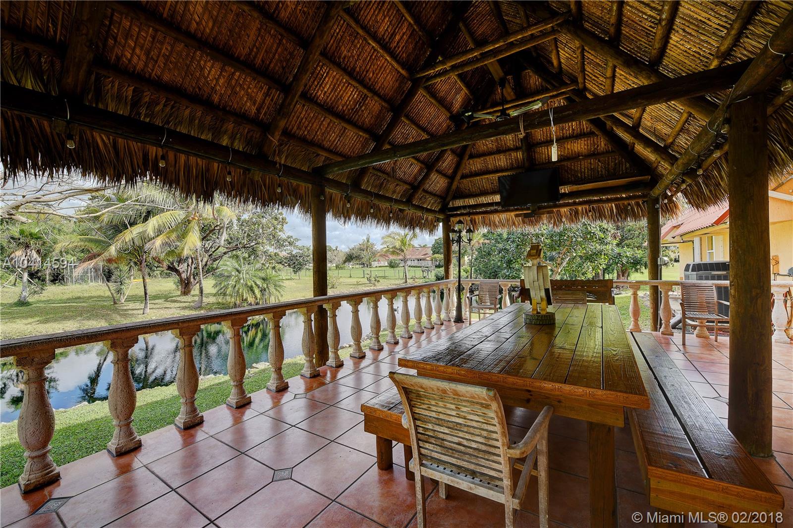 Beautiful Davie Ranch home. 1.03 acre lot with a private pond. Gorgeously updated bathrooms, formal dinning rm, large updated kitchen with granite counters & professional series SS appliances. Beautiful porcelain style flooring. HUGE family rm for the largest of gatherings with triple full view french doors leading out to an AMAZING & HUGE tiki hut featuring a big screen TV with breathtaking views of the private pond. Custom electric double gated entry to driveway. 2 CG plus attached storage room. Home boast an amazing & enclosed key west style lounging patio with a built-in custom grill. Additional detached CBS storage room with double french doors. Home is nestled on a gorgeous lot with beyond ample room for boats, RV's, etc. Call show assist for showings. Agents, read broker remarks.
