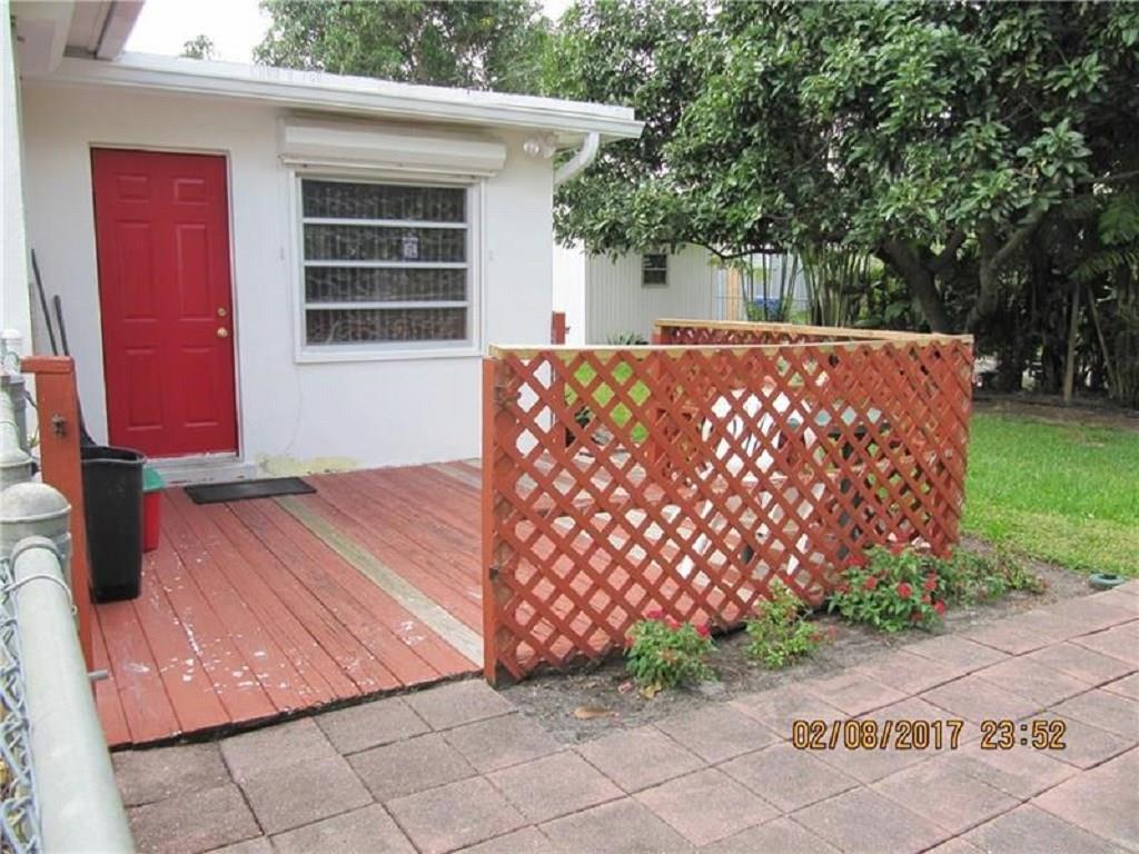 Desirable area, well kept 2/1 on palm lined street, carport, newer concrete driveway, tile roof, new central A/C, nicely landscaped. Very neat interior, tile floors & brick fireplace, laundry room with washer & dryer. Florida room leads to wood deck & back yard with storage shed. Service alley for trash & brush pickup. Rolladen & accordion shutters for all windows, alarm system. Walk to Tri-Rail & I I-95, Publix & Memorial Hospital, dog park in area.