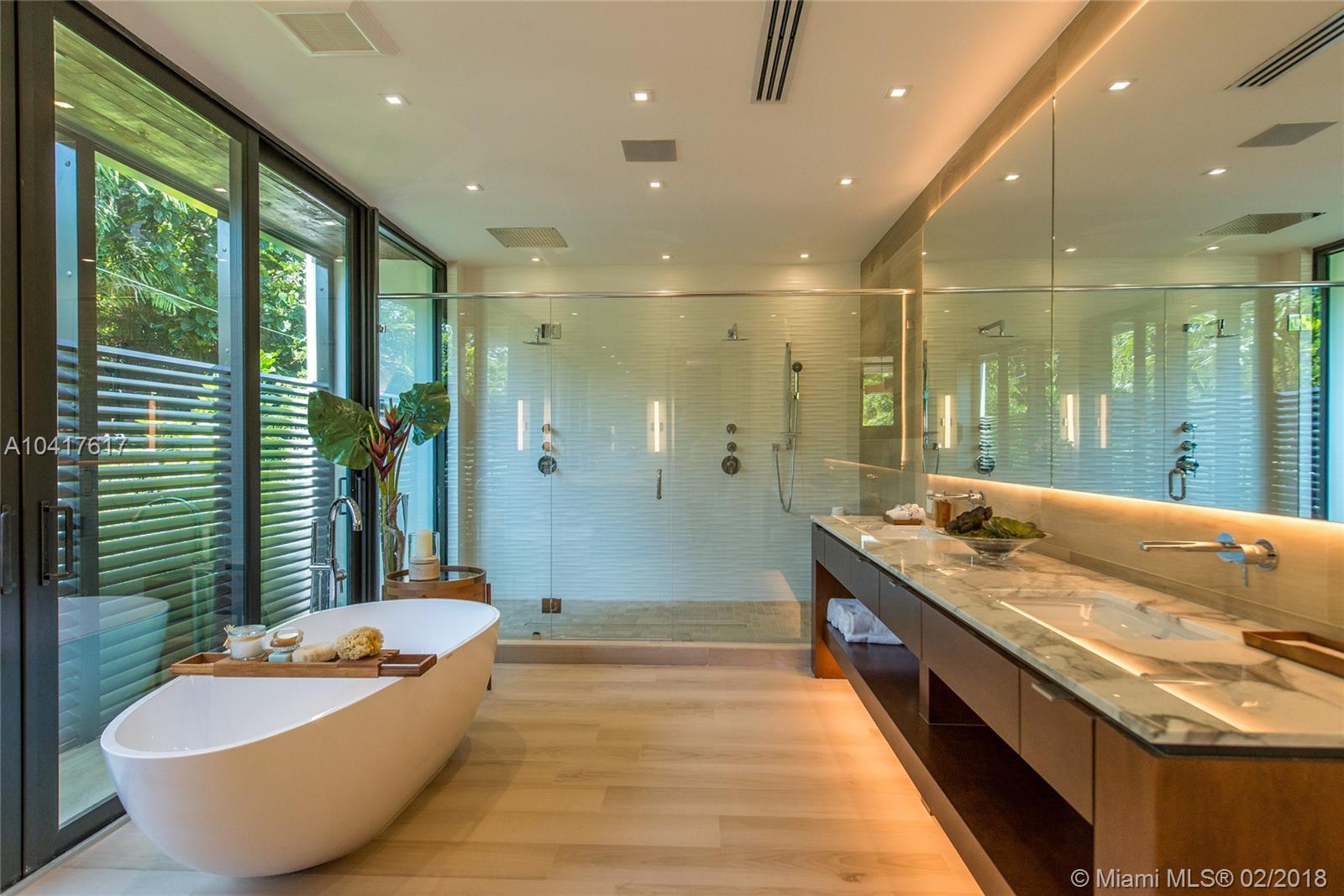 Spectacular Tropical Modern masterpiece designed by acclaimed architect Charles Treister, set within a lush botanical garden behind a custom coral rock wall and gate. The quality of finishes, fixtures and attention to detail is unsurpassed by any new construction home in the Grove. 23 ft ceilings and walls of glass create a seamless blending of interior and fabulous exterior spaces. Custom Italian kitchen. Green and Smart Home technologies. Developed by Andrew Rasken and Charles Treister.
