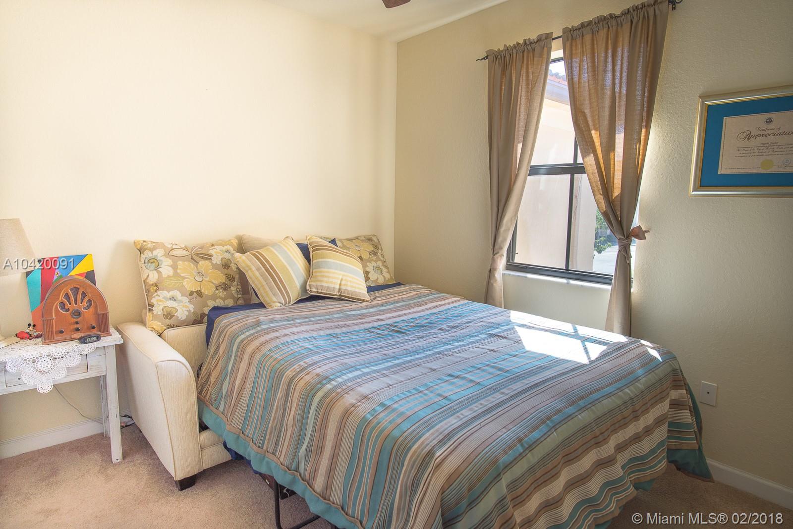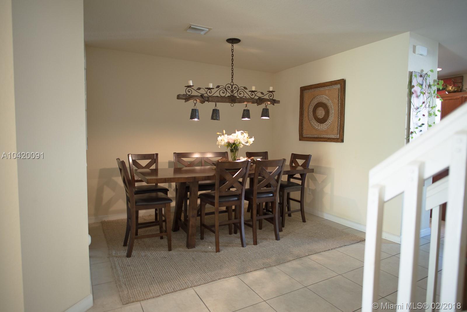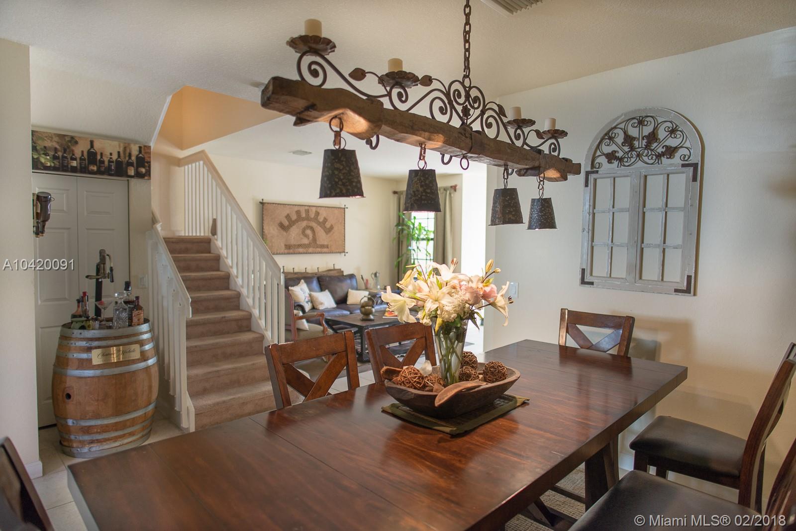 Great Opportunity to own this Townhouse 3 Bed/2.5 Baths. Functional floor plan with formal living & dining room. Nice Kitchen overlooking family room, Wood-Finish Cabinets,Stainless Steel Appliances, Granite Countertops with breakfast area bar. The Family Room also gives access to an outdoor Patio. The 2nd floor includes a Laundry Room, 2 Bedrooms both with access to a full bath with vanity and tub, Master Suite, with a walk-in closet, master bath with dual sinks, marble countertop, vanity, and glass enclosed shower. Walking distance to community pool and mail boxes area. No Neighbors on the back. Excellent location. Close to great schools, mayor highways, and Doral Legacy Park in which you can gather to enjoy sports, cultural arts. Current owner will move one month after closing.