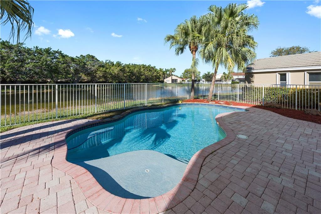 Amazing lake views! Beautiful free form pool! This home boasts 3 large bedrooms & 2.5 baths and is situated on a quiet, tree lined street in guard gated Weston community. Patio is screened but has ample deck space & extended fenced in yard with great lake view. Accordion shutters, neutral tile on first floor, wood laminated stairs & bedroom plus carpeting in 2 bedrooms. Fresh interior paint including 2 car garage. Separate laundry room upstairs. Over-sized master features walk-in closet & volume ceilings.