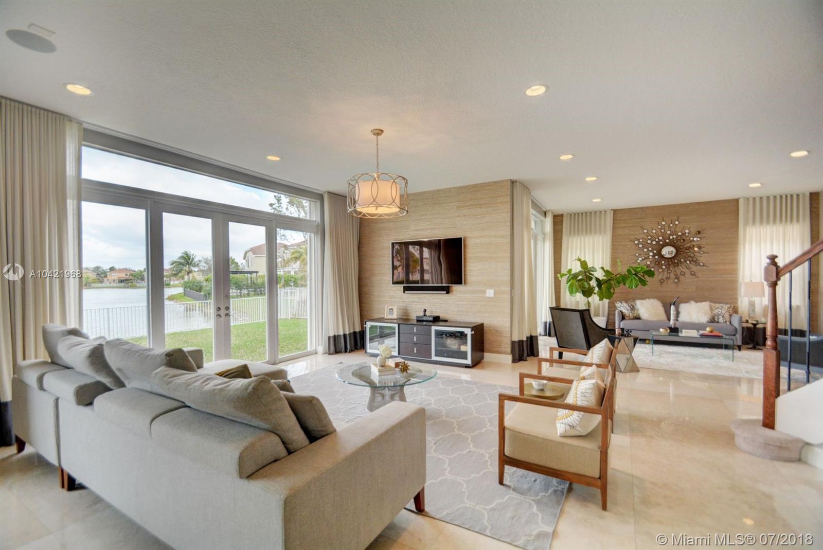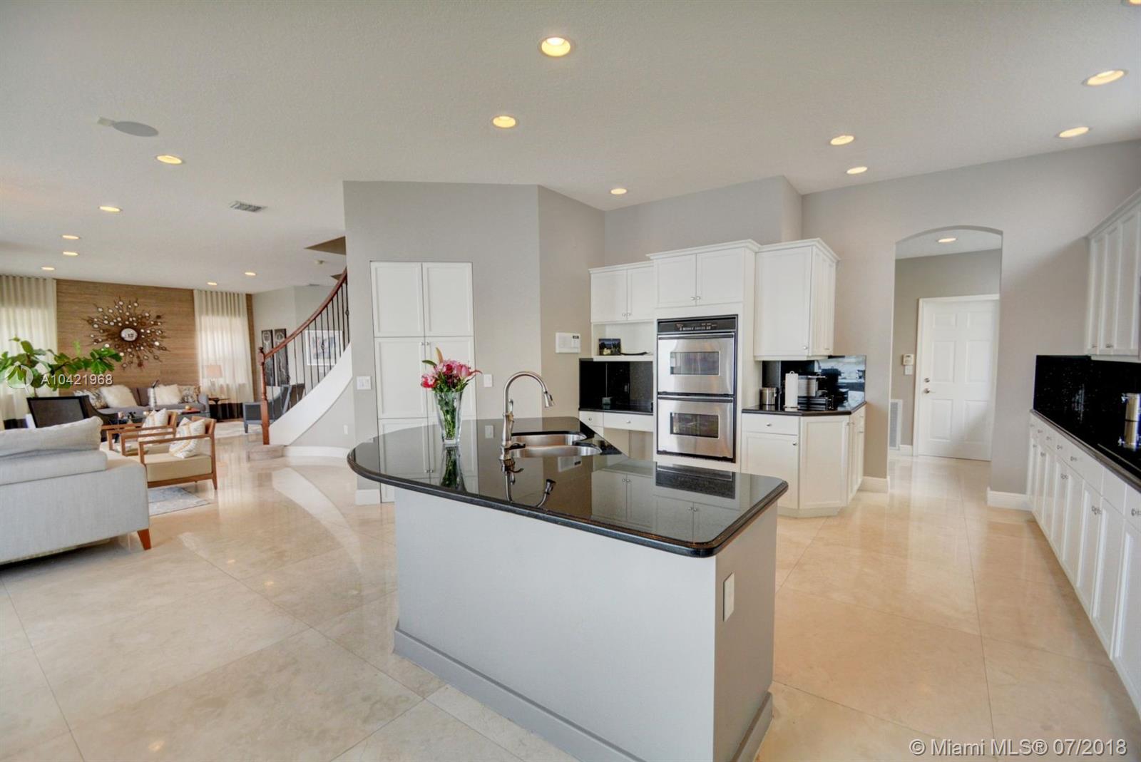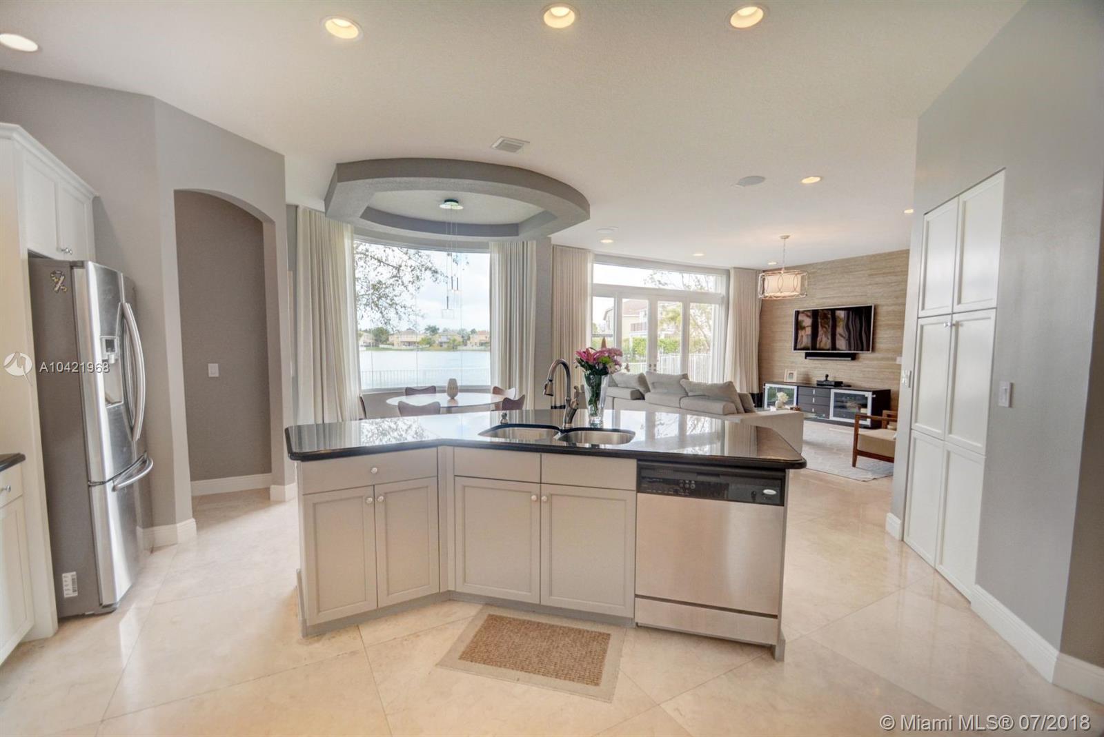 MAGNIFICENT LAKEFRONT, designer perfection 5143 total square feet, 3'x 3' Crema Marfil marble flooring throughout first floor, upgraded granite kitchen with butler’s pantry, stainless steel appliances, double ovens, custom linen drapes adorn living room and family room areas, 8 foot tall glass French doors lead to the backyard with waterfront views, accordion shutters and impact windows, new lighting, freshly painted, 2 newly remodeled bathrooms, huge master bedroom suite with outside balcony, extra-large walk-in closet with built-ins, master bath with whirlpool tub, glass enclosed double head shower, formal dining room, fenced yard. Located inside Riviera Isles Resort-Style community, 24/7 guard gated. Amenities include: tennis & basketball courts, fitness center, lagoon-style pool.