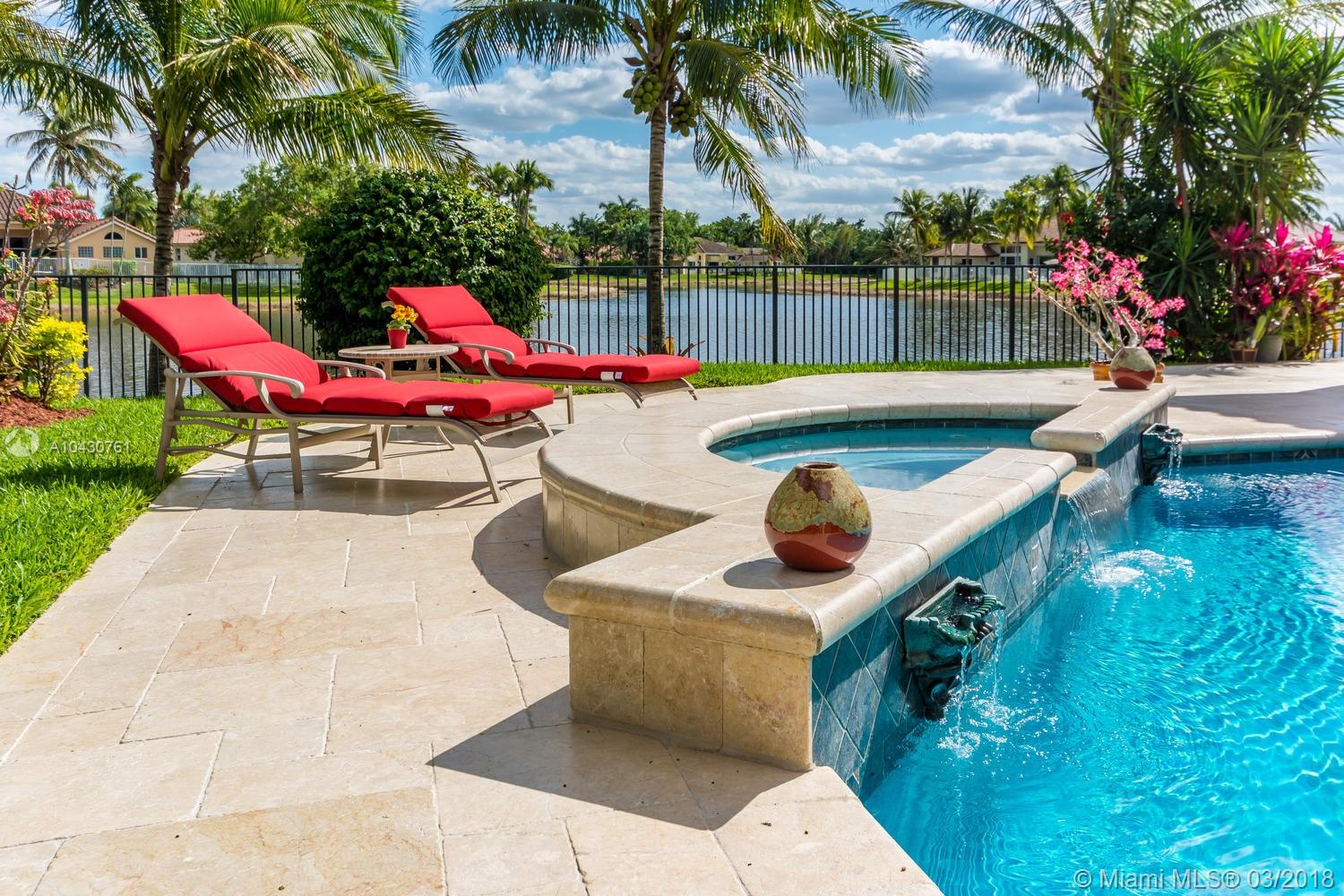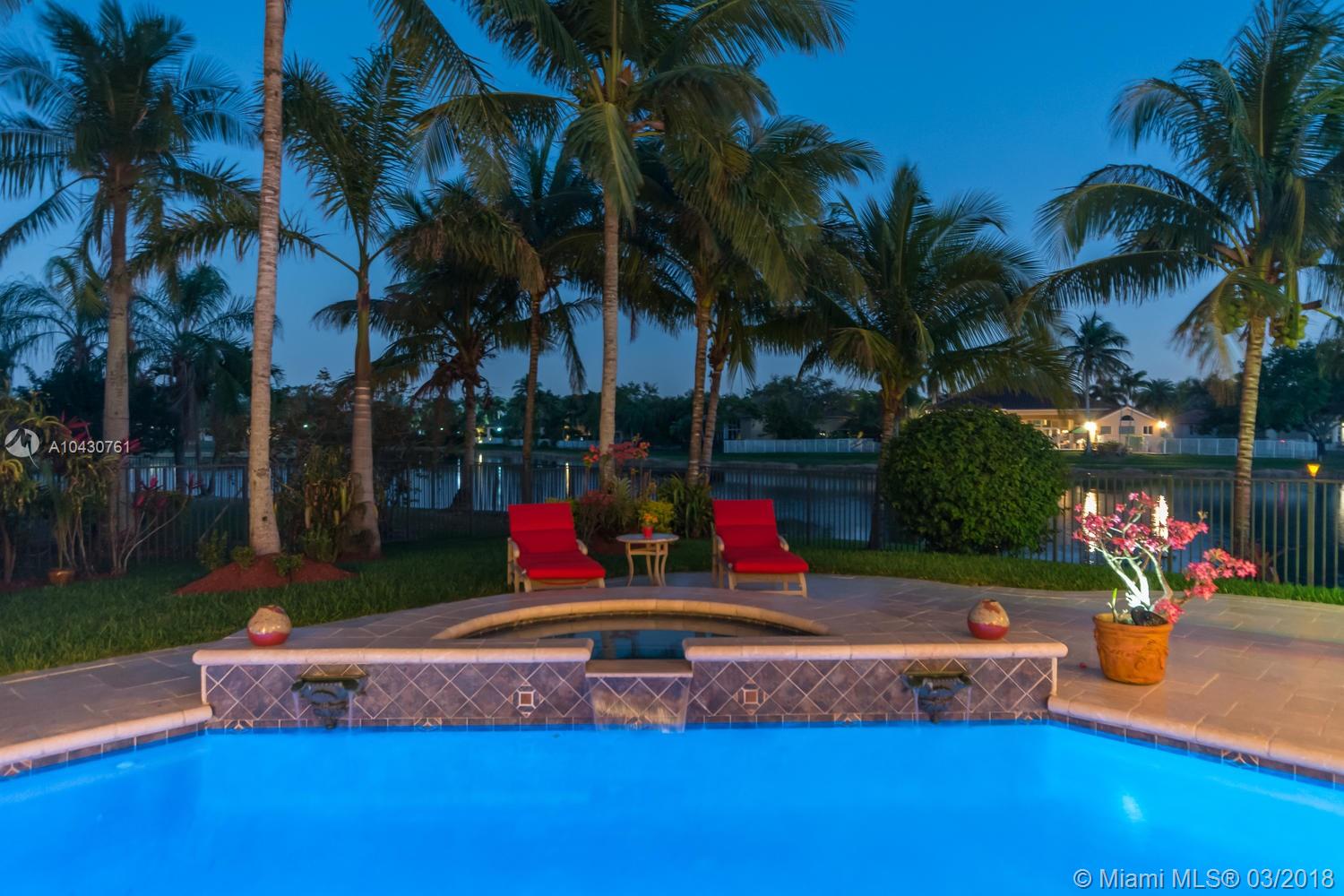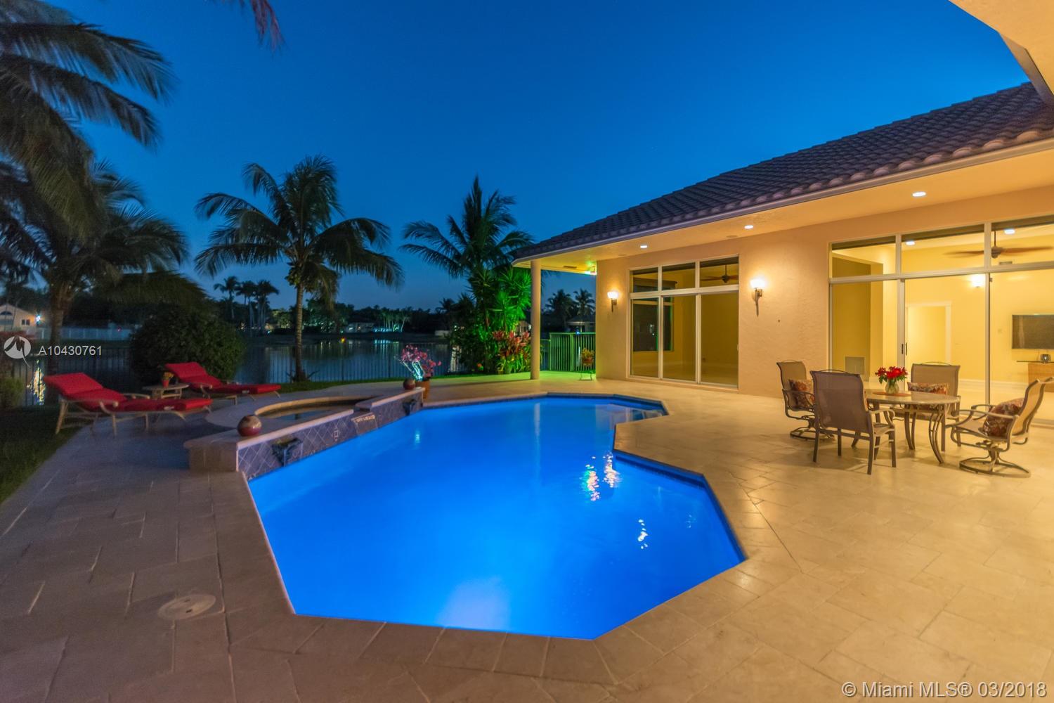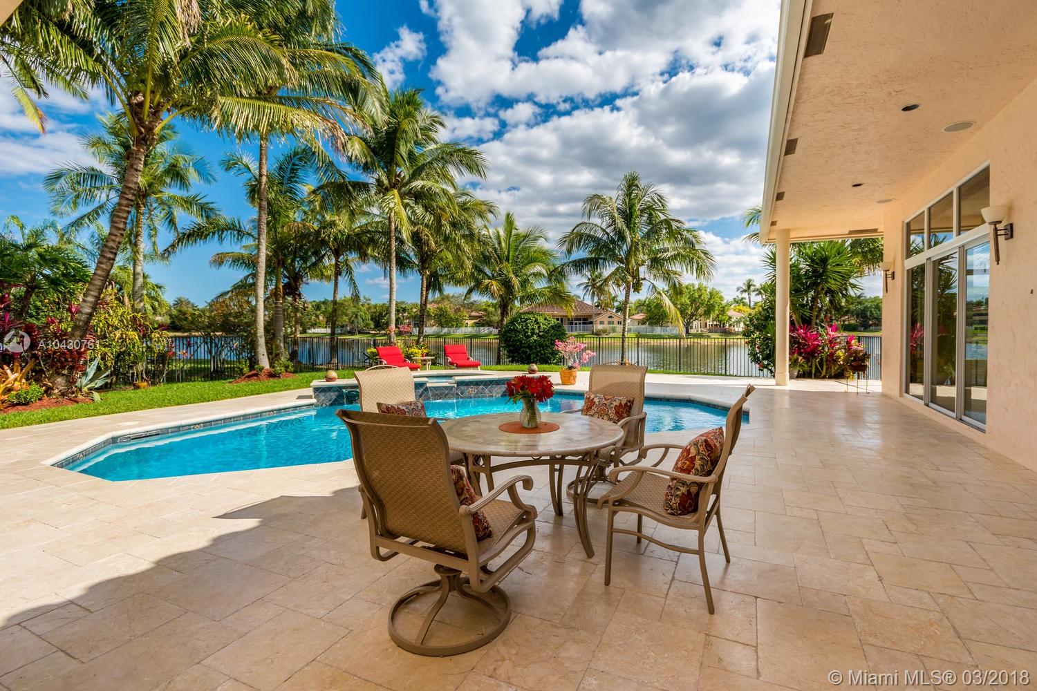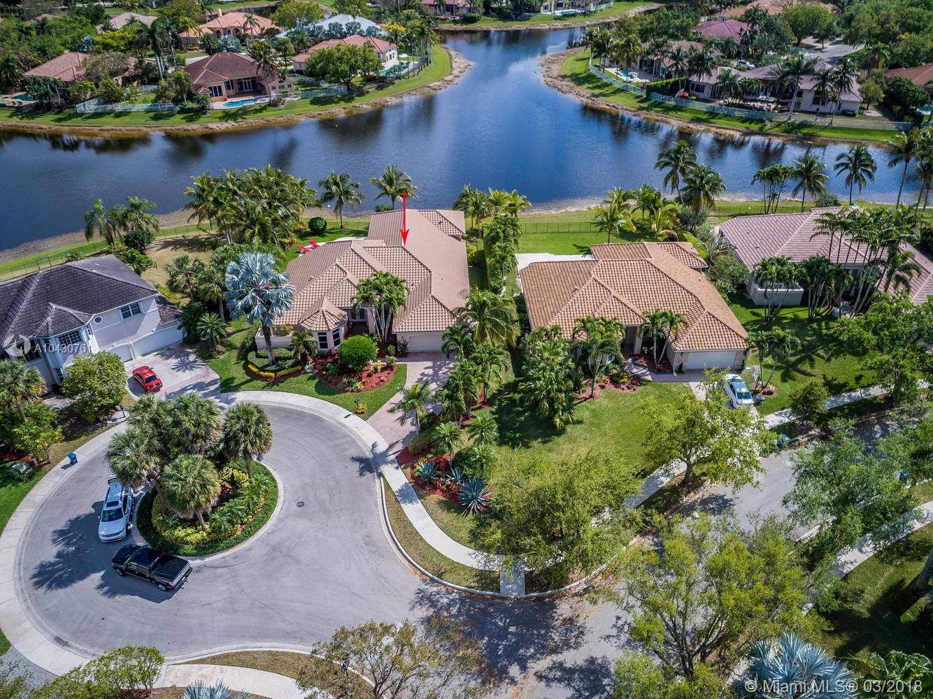 Tastefully upgraded, executive home nestled in the heart of Weston Hills Country Club, featuring a private cul-de-sac location with the best 270-degree water view in the community. Enjoy the mesmerizing sunrise & moon rise from the stunning pool area, boasting a salt pool with French marble designed deck surrounded by lush tropical landscape.This serene oasis features all common areas finished with Jerusalem stone. You will spend many cherished moments preparing gourmet meals in this chef’s kitchen. This home offers many spectacular upgrades including, but not limited to, motorized blinds, piano/pool room, impact windows & doors, master bath adorned with marble and onyx, wood flooring in all the bedrooms and library and a newer roof. Excellent school district & easy access to highways.