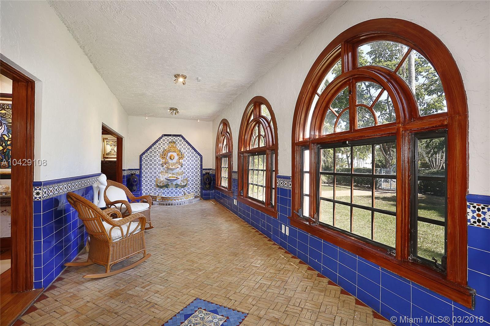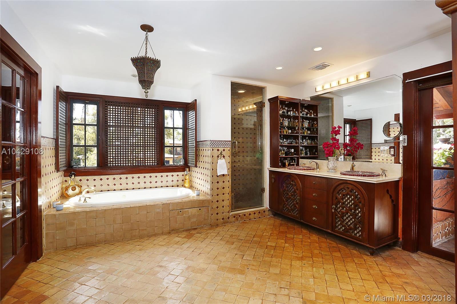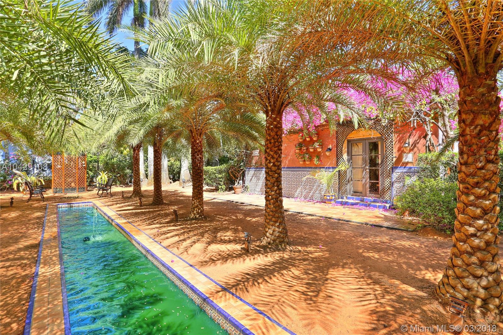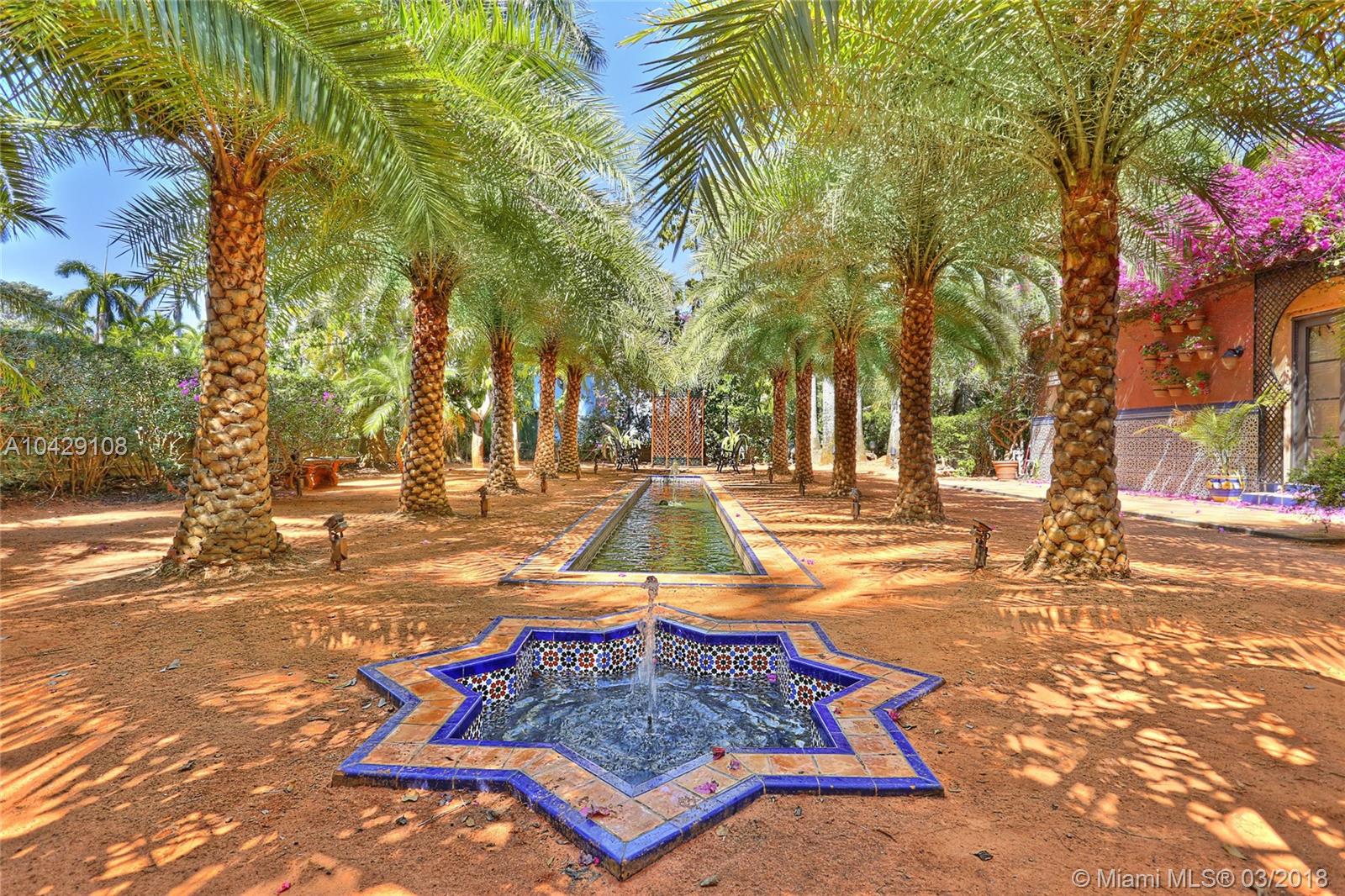 Timeless Mediterranean Villa with elegant Moroccan details on a corner half acre. Courtyard entry to the light filled sunroom with arched windows and fountain. Beautiful living room with high beamed ceilings, carved fireplace and adjoining dining room. Staircase with wood scrollwork leads you upstairs. Master suite with fireplace, wood floors, & private terrace with fountain overlooking the pool. Carriage house for guests nested among the award-winning Andalusian garden with pond, gazebo and fountain. Designed by acclaimed pioneering architect Martin Luther Hampton.