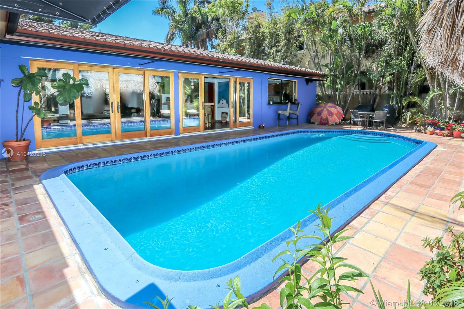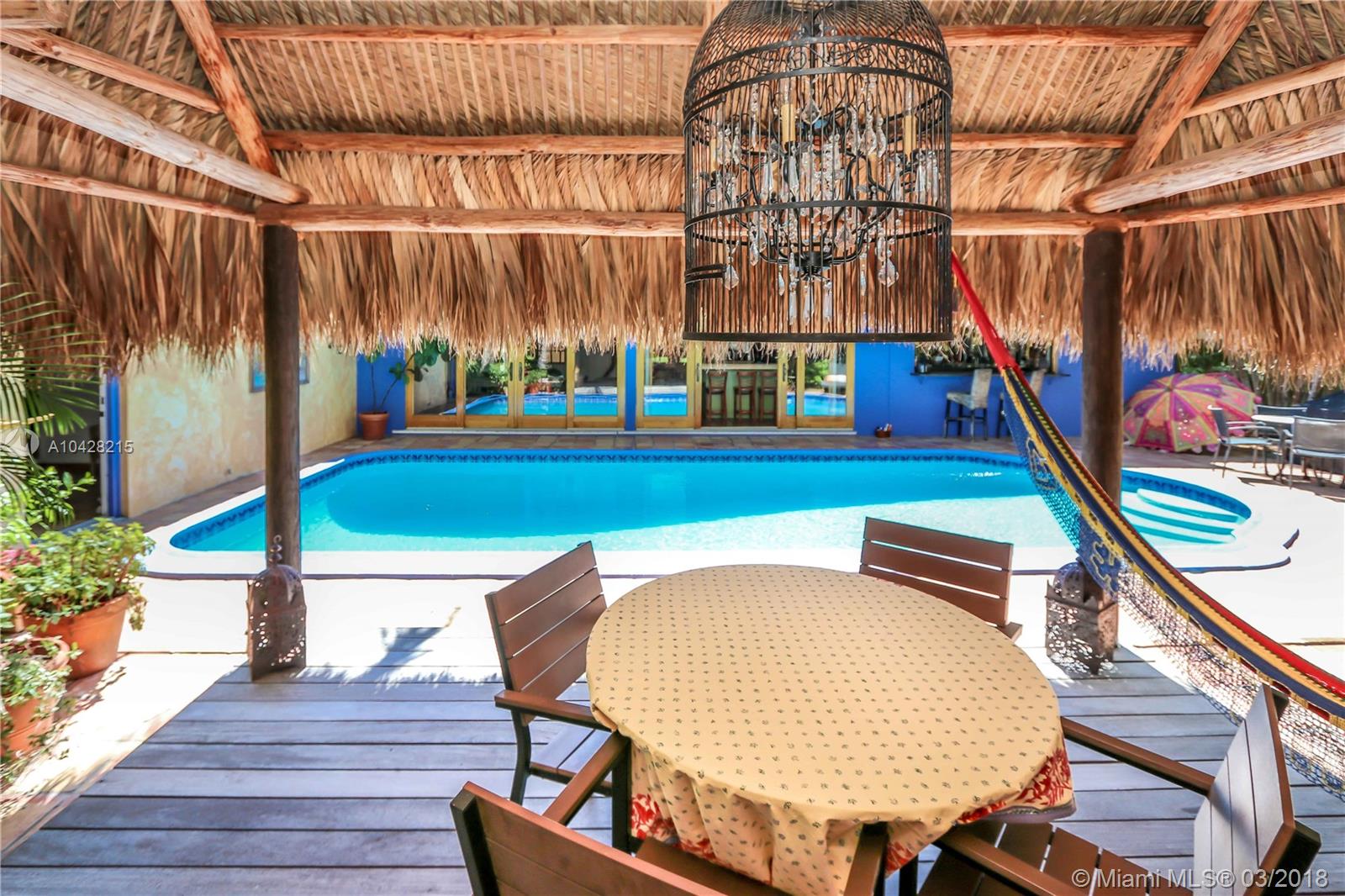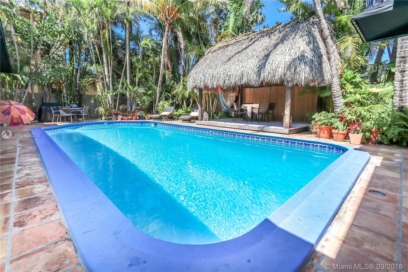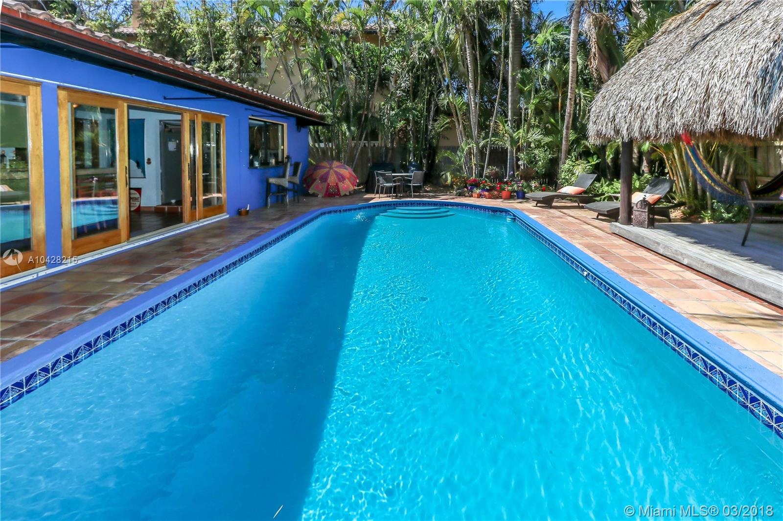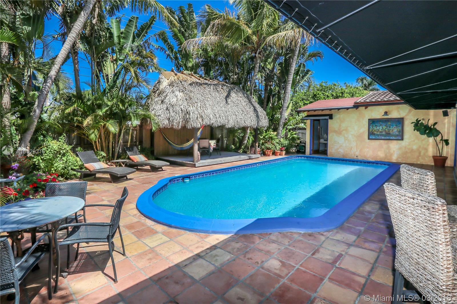 Enjoy Real Tropical living in the Heart of Hollywood Lakes just 1 block from the intracoastal. Bright & Spacious 4 bed/3bath 2 CG w/ a Pool features Living Room, Formal Dining Room & Florida Room. Large Eat in Kitchen w/ Granite Counter Tops, Cherry Wood Cabinets w/ pull outs & an Island w/ Counter Height Dining. Entire wall of wood sliding doors opens to lush landscaped pool area which connects to bar - dining area & kitchen. Great for Entertaining w/ tropical fenced outdoor space & oversized Balinese Style Tiki Hut. Master Bath has Chic Marble w/ Double Sink & Roman Tub. Other baths feature Handicap Accessible shower & Contemporary Free Standing Tub. Half circle driveway w/ lots of parking. 2Water Heaters (gas/electric), New A/C & 2nd Fridge in Garage.