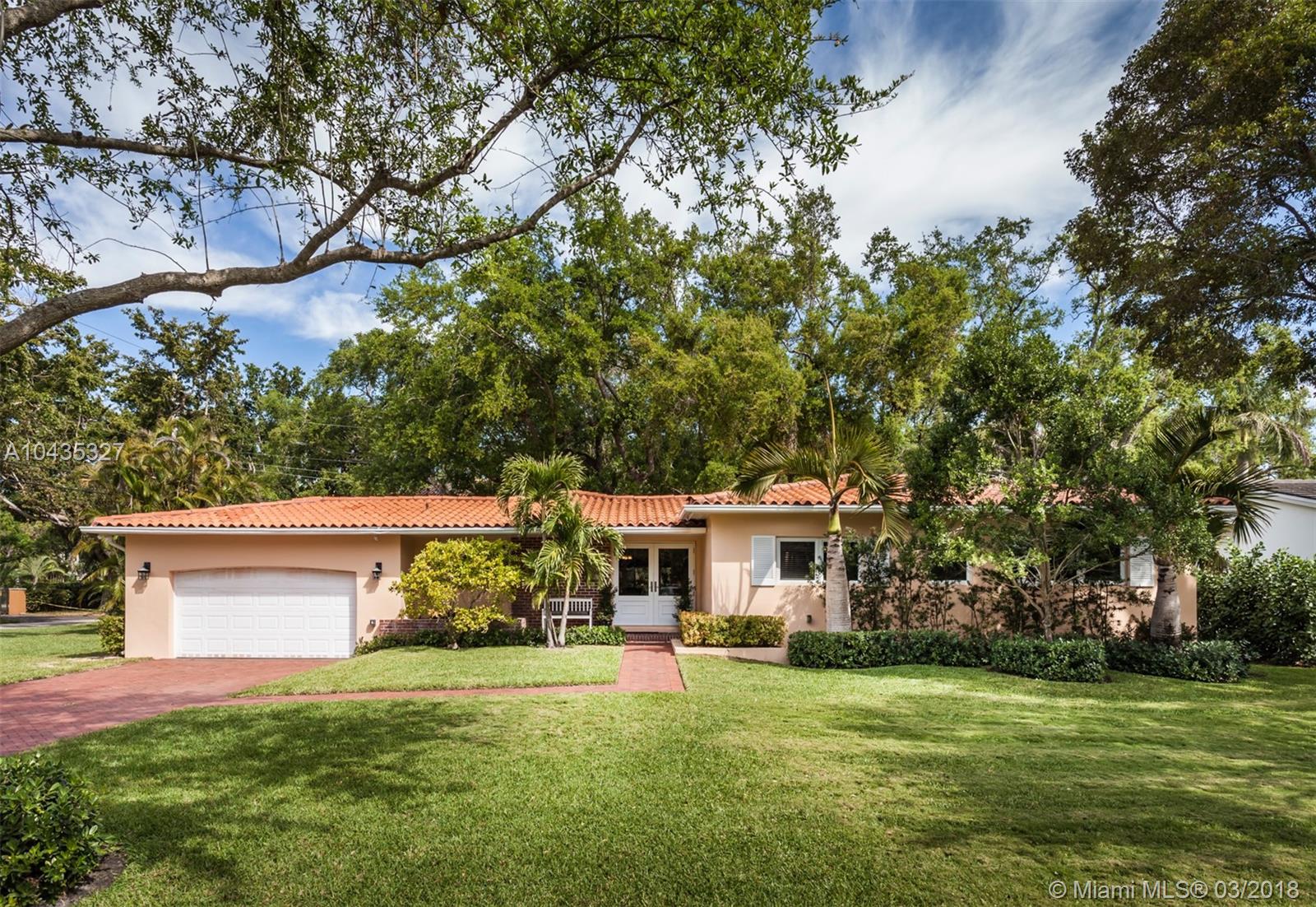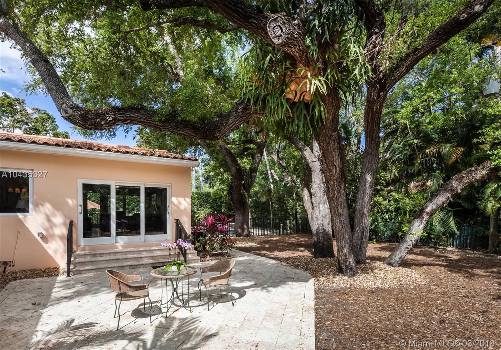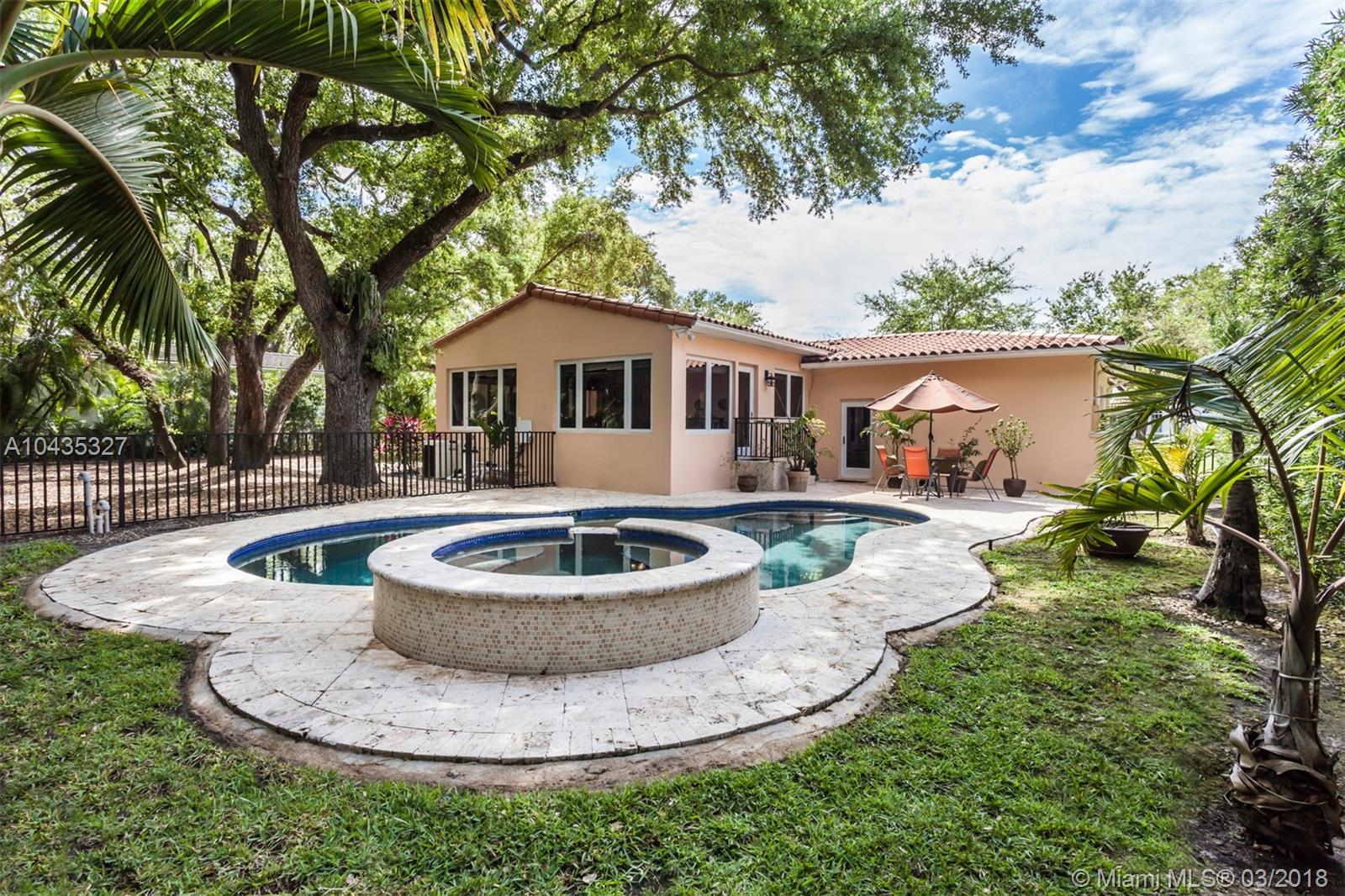 Located in the premier “Platinum Triangle” neighborhood in Coral Gables, this 4-bedroom, 2-bath home features beautiful beamed ceilings and classic Oak wood floors. Completely renovated in 2008, the grand kitchen and pebble tech pool and Jacuzzi, with a waterfall fountain, add to the allure of this immaculate residence. The kitchen showcases Black Venata Soapstone countertops, custom hardwood with trim line cabinetry, subway tile backsplash and Viking and Sub Zero appliances. Surrounded by oak trees, the exquisite outdoor entertainment areas feature Dominican Keystone floors, a patio that extends to the pool, and manicured tall hedges for ultimate privacy. While the home has been beautifully updated with all the modern conveniences, it never lost its charm.