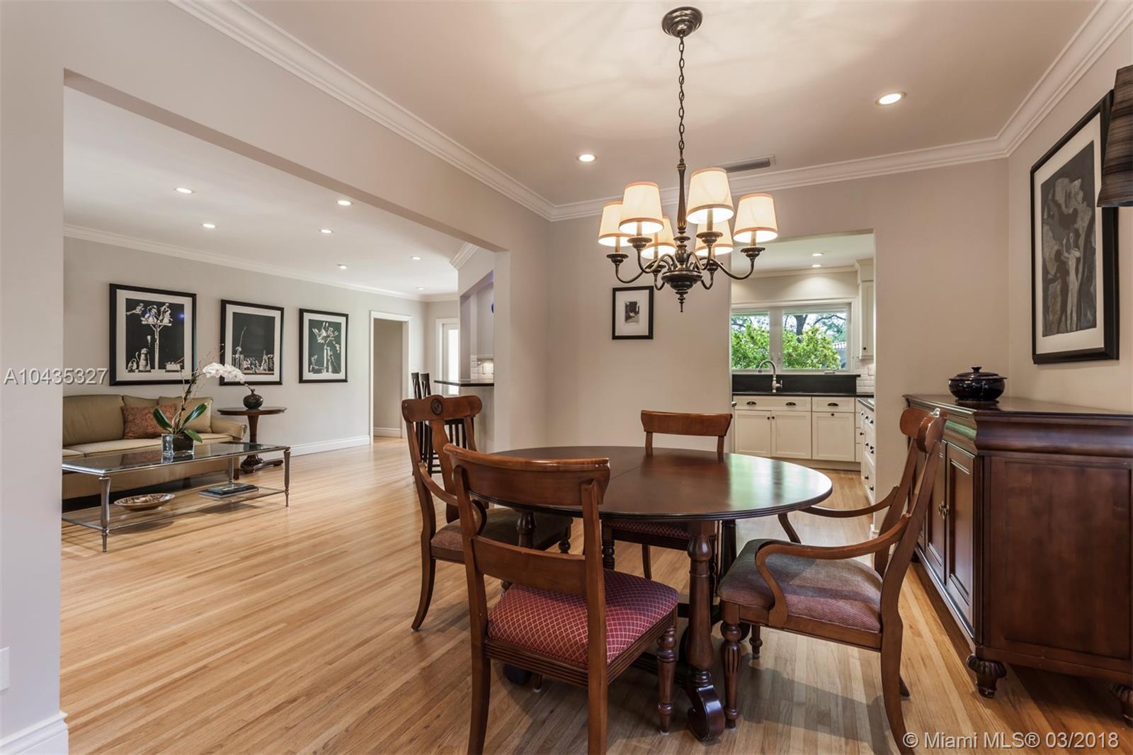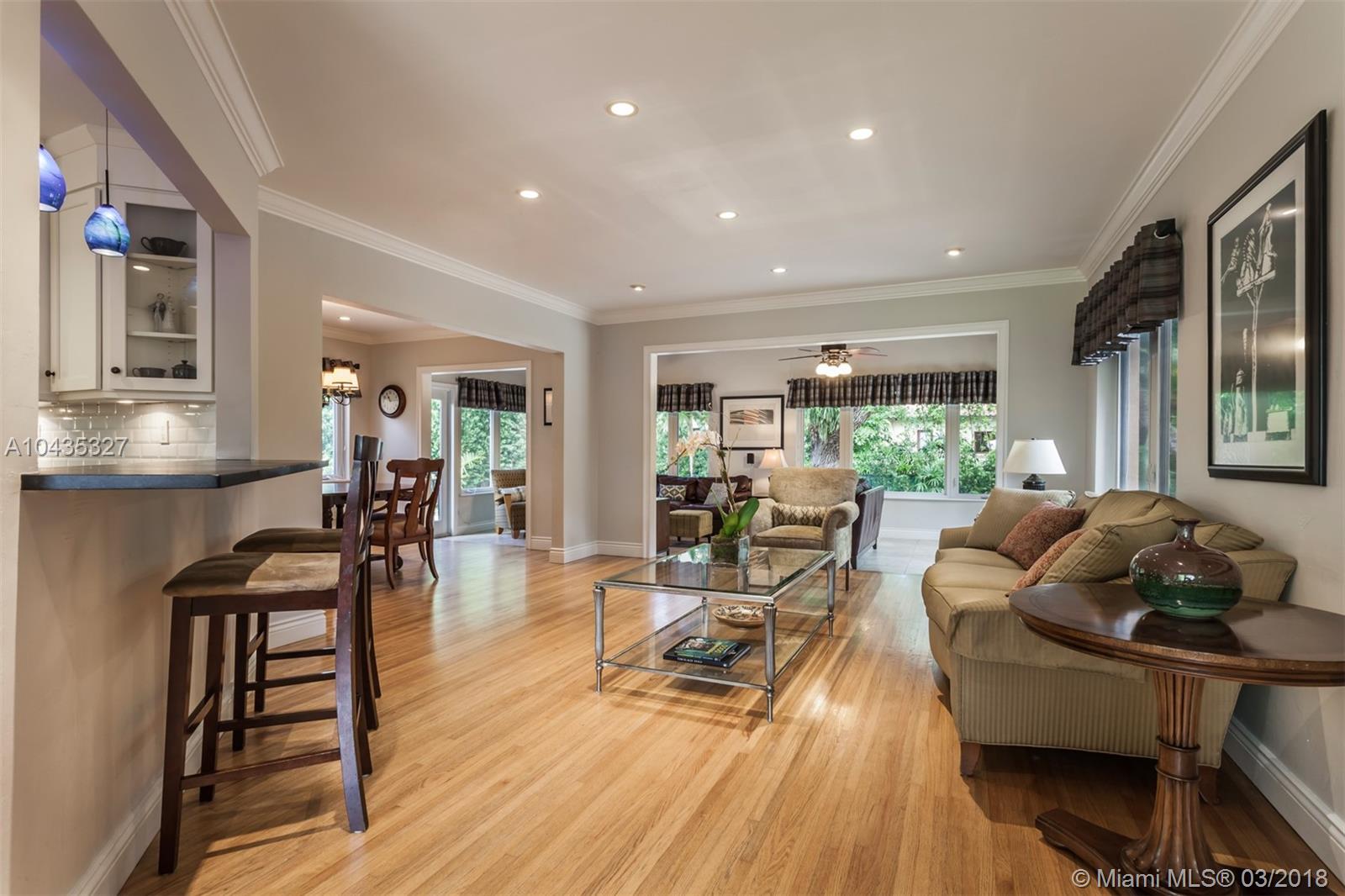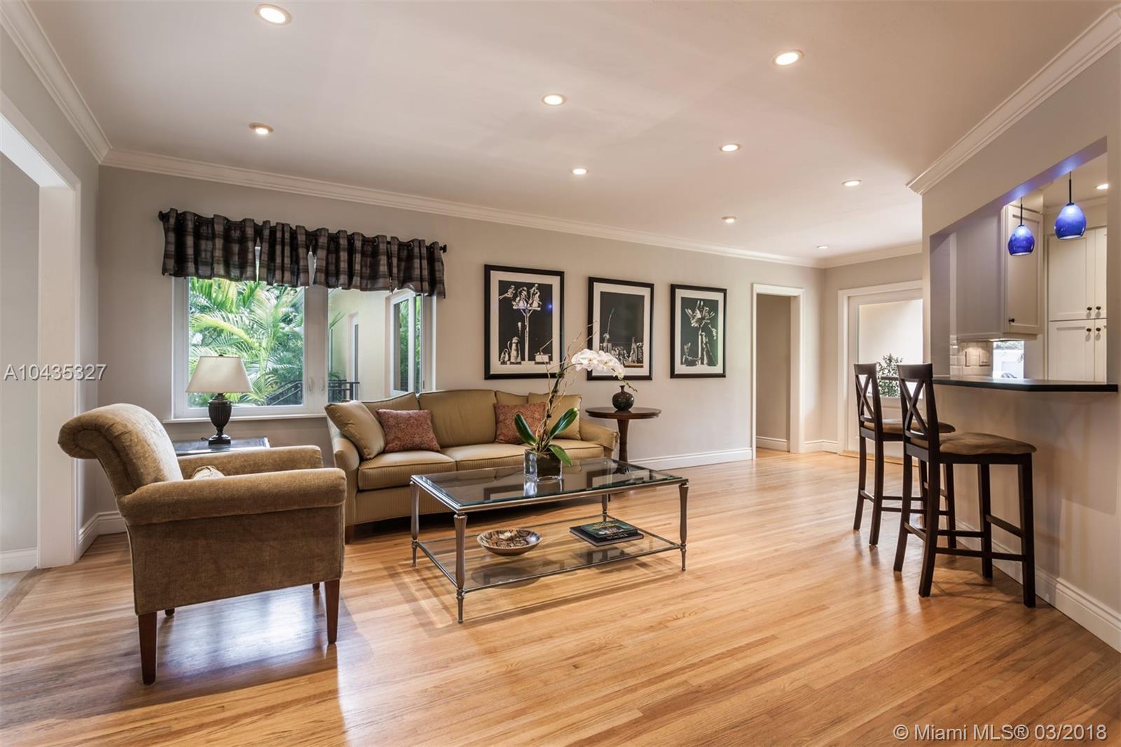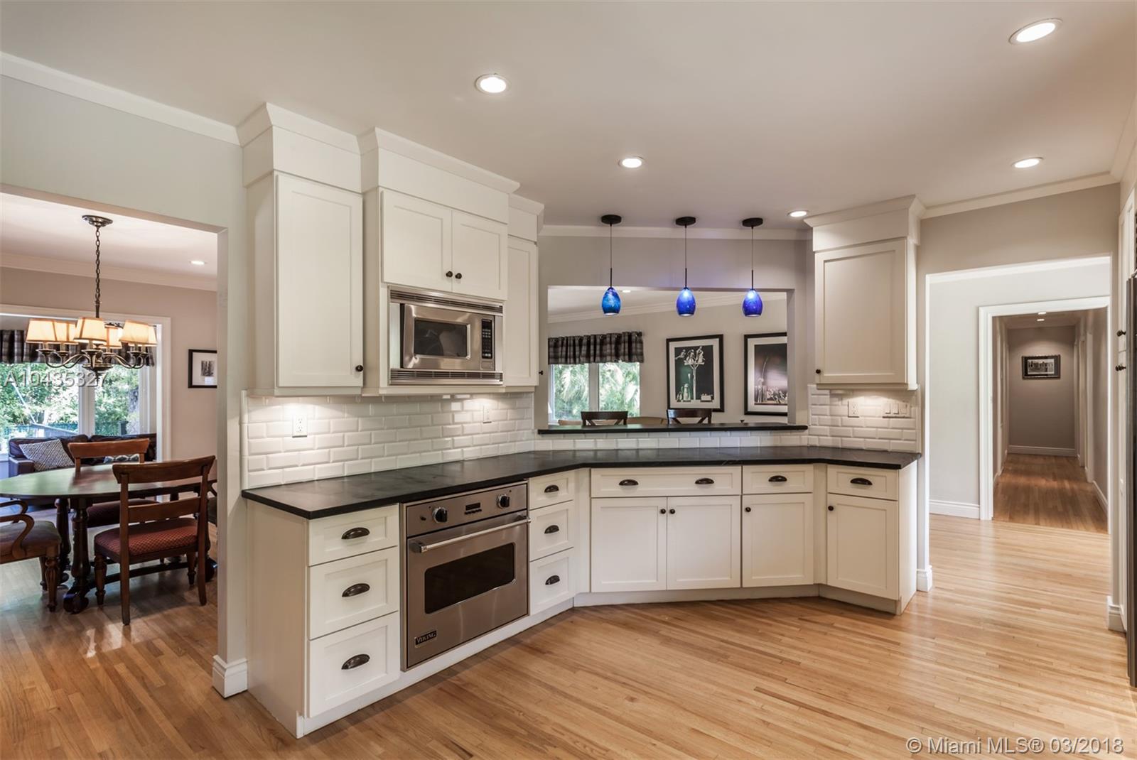 Located in the premier “Platinum Triangle” neighborhood in Coral Gables, this 4-bedroom, 2-bath home features beautiful beamed ceilings and classic Oak wood floors. Completely renovated in 2008, the grand kitchen and pebble tech pool and Jacuzzi, with a waterfall fountain, add to the allure of this immaculate residence. The kitchen showcases Black Venata Soapstone countertops, custom hardwood with trim line cabinetry, subway tile backsplash and Viking and Sub Zero appliances. Surrounded by oak trees, the exquisite outdoor entertainment areas feature Dominican Keystone floors, a patio that extends to the pool, and manicured tall hedges for ultimate privacy. While the home has been beautifully updated with all the modern conveniences, it never lost its charm.