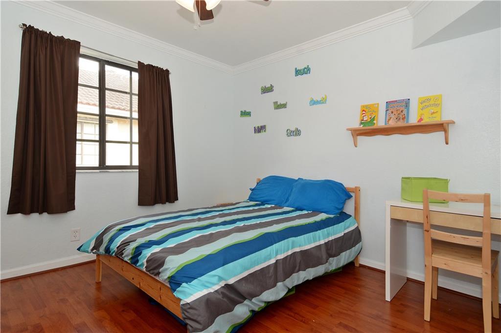 Spacious and rarely available 4 bed/2.5 bath corner town home in gated Courtyard at the Grove. Boasts private patio with greenery and a good location for enjoying the clubhouse and pool area. 24/7 Security. Walk to highly rated local schools. Tile floors in the living and dining areas, newer stainless appliances with wood cabinets in the kitchen. Wooden staircase leads to large master and 3 other bedrooms upstairs, all with wooden floors...good closet space. A pet friendly and well manged HOA community.