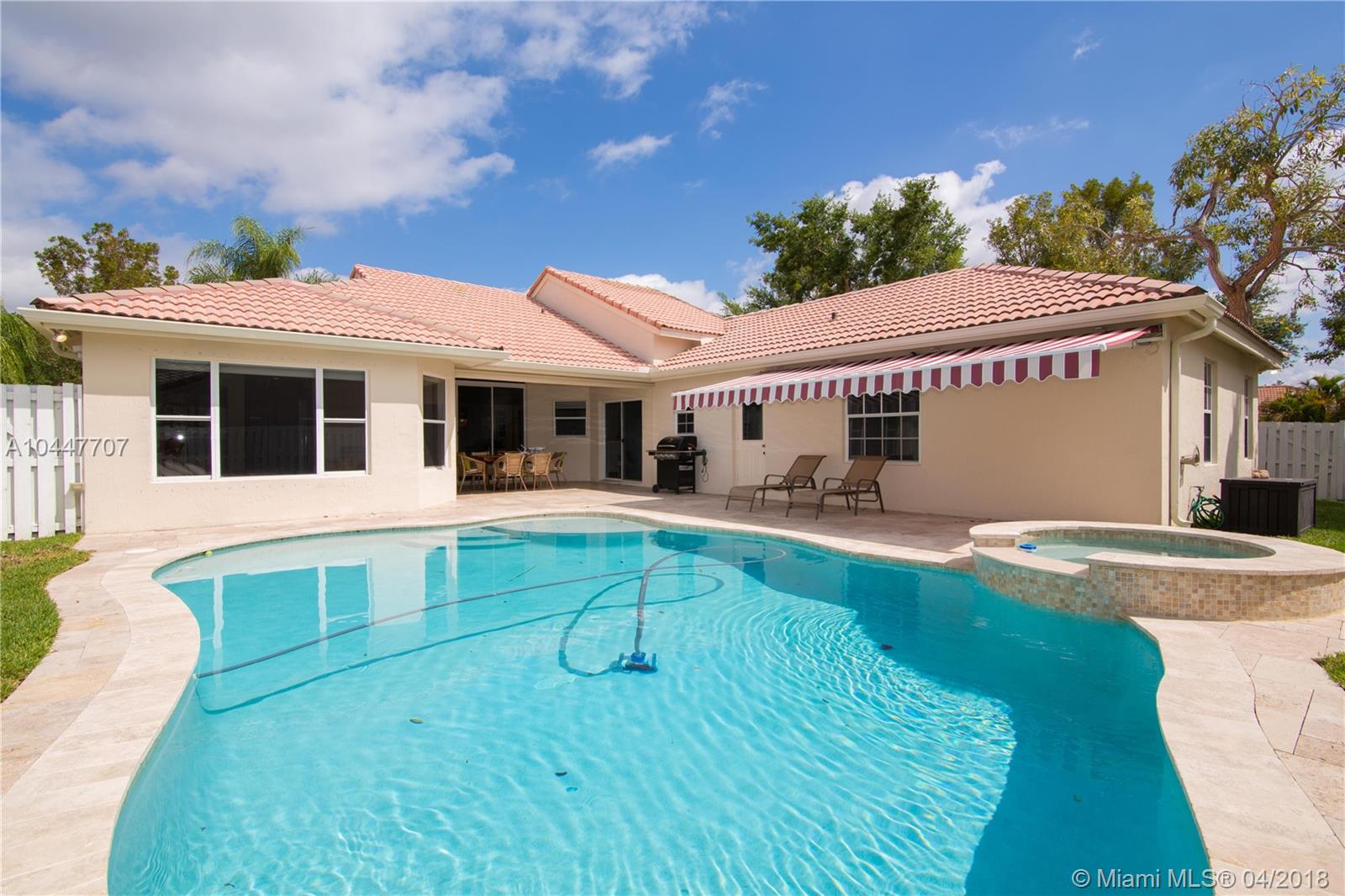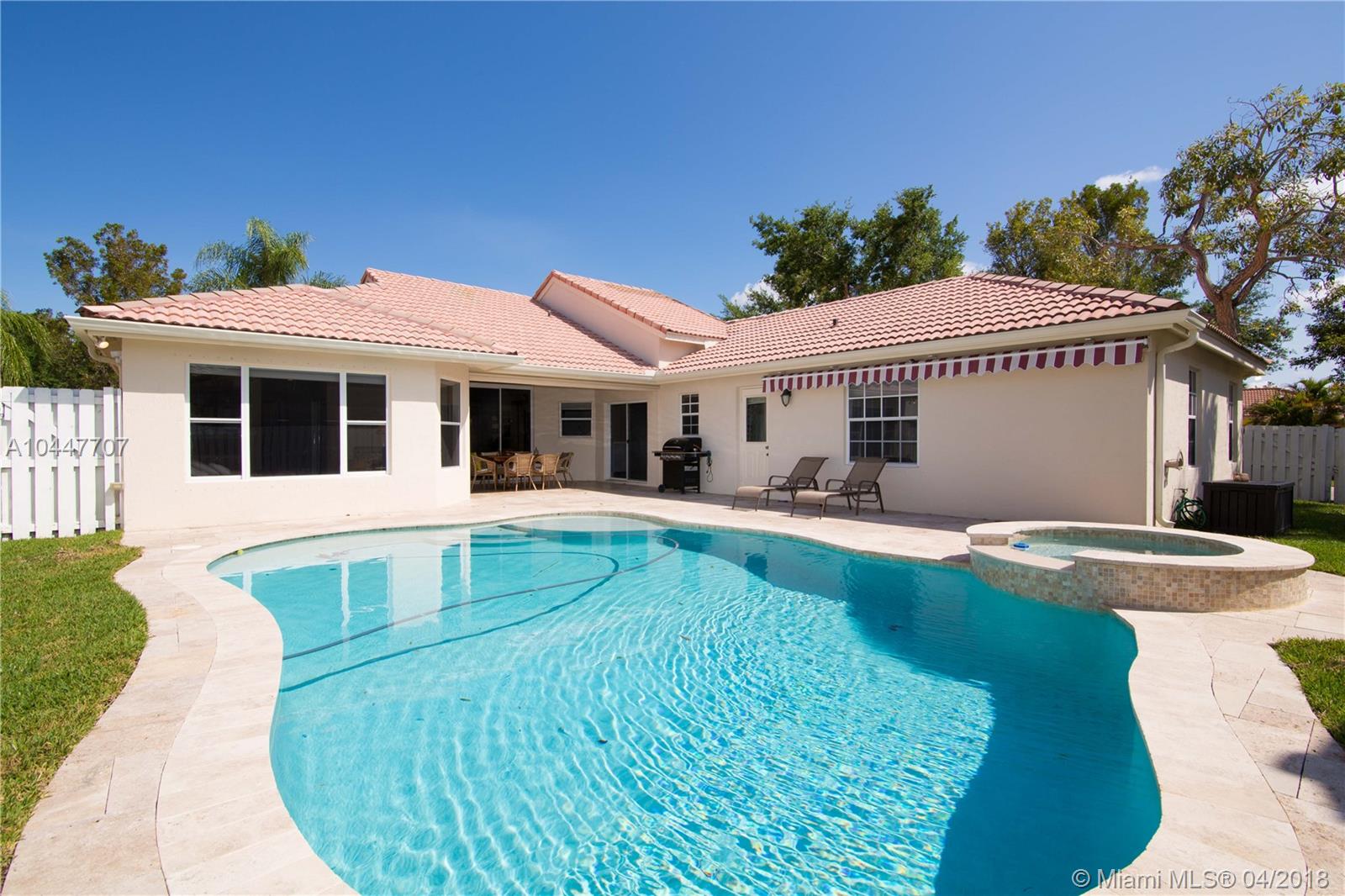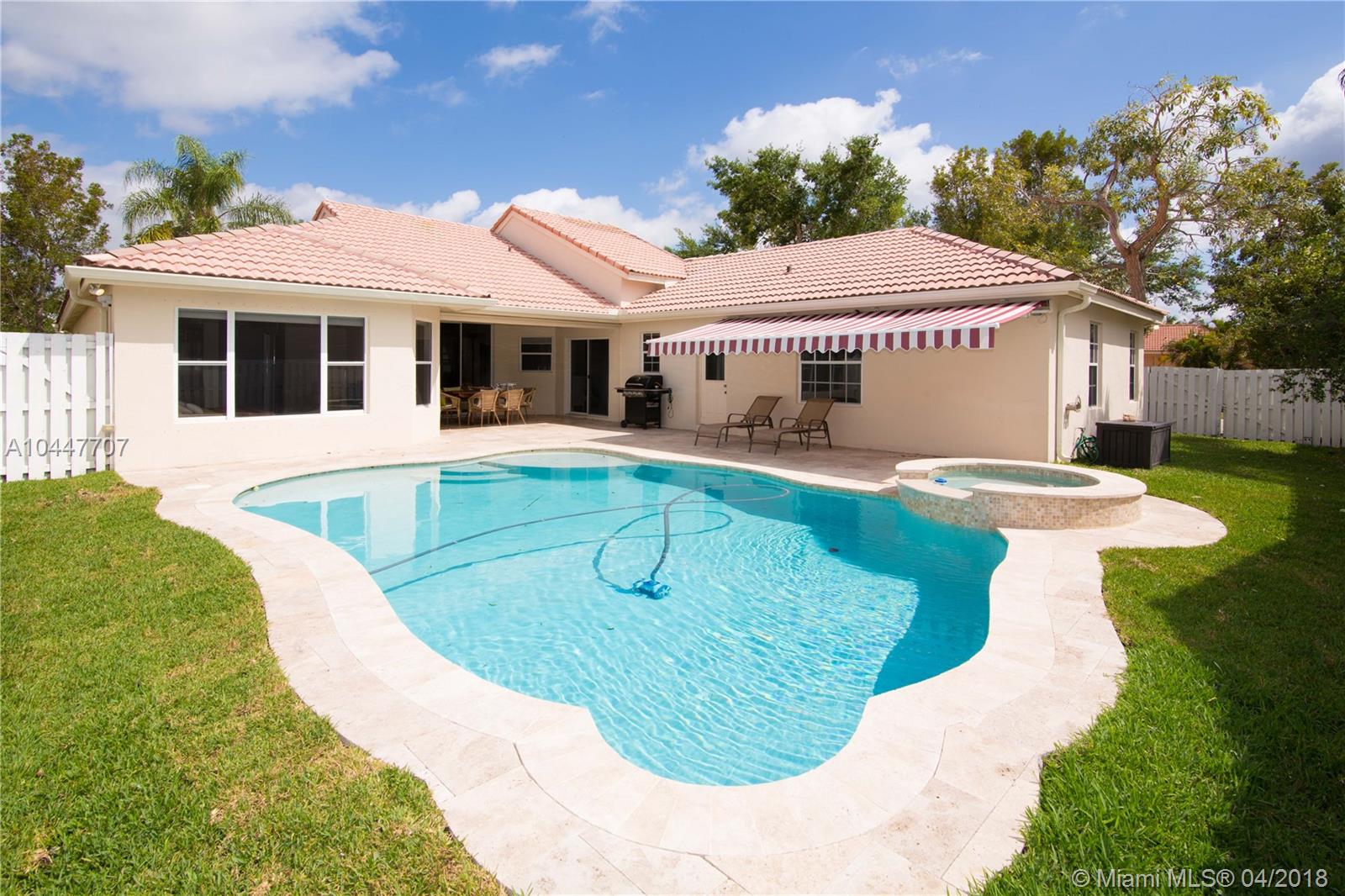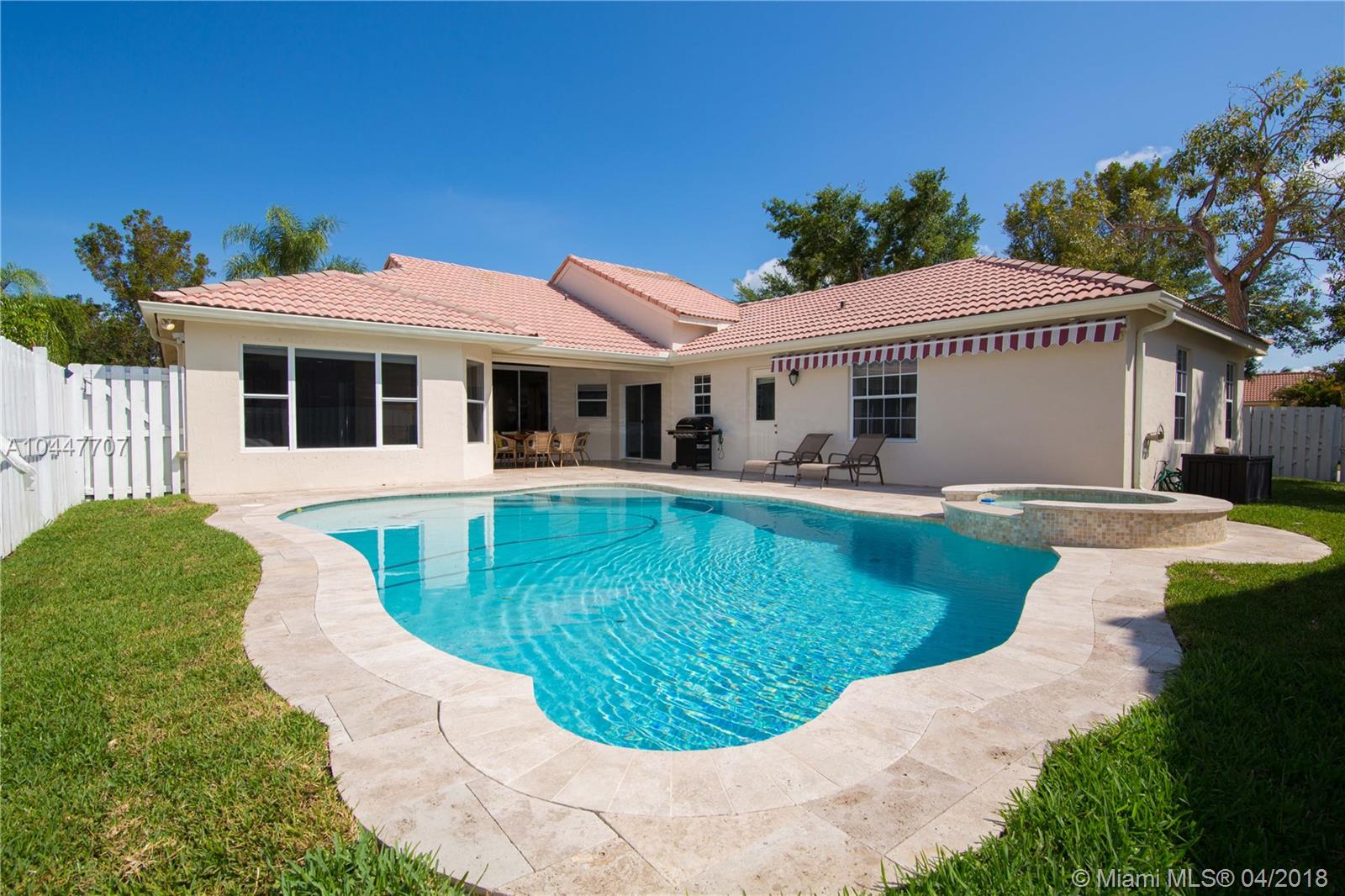 IMPECCABLE DESIGNED 5 BEDROOM AND 2.5 BATH HOME VERY WELL MAINTAINED. MARBLE THROUGHOUT LIVING AREA. BEAUTIFUL DARK WOOD FLOORS IN BEDROOMS. CUARZO COUNTERTOP IN KITCHEN WITH JACUZZI, TUB IN MASTER-BATH, BOTH BATHROOM JUST REDONE, HIGH END BLINDS. SIT OUT ON THE COVERED PATIO OVERLOOKING THE NEW SALT POOL WITH SPA. CORNER LOT. ROOF JUST PRESSURE CLEANED. GREAT LOCATION CLOSE TO SUPERMARKETS AND SAWGRASS EXPRESSWAY THE LAKES AMENITIES INCLUDE COMMUNITY POOL, PLAYGROUND, SOCCER FIELD, GUARD GATE. BEST SCHOOLS ALL A RATED.
