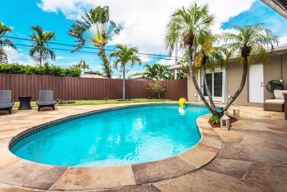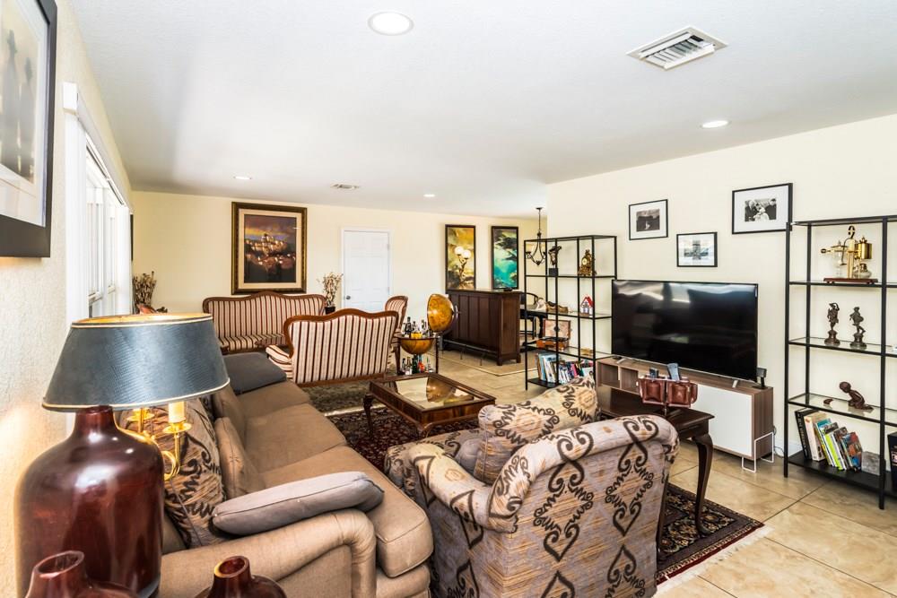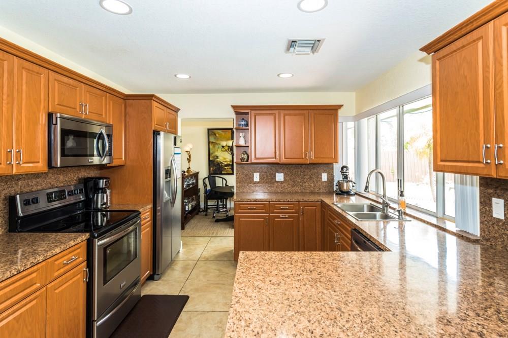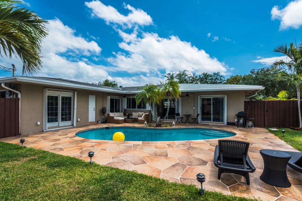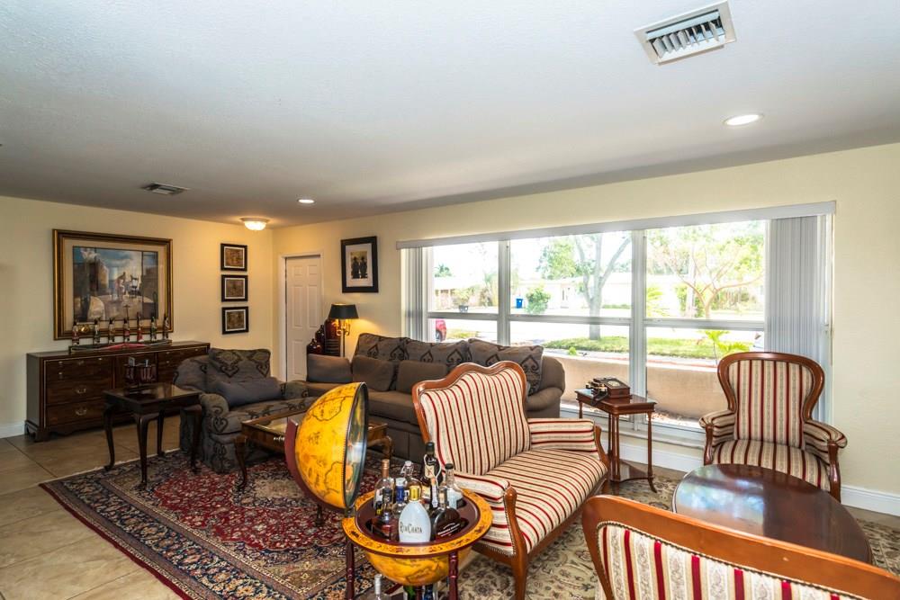 Expansive 5 bedroom 3 bath home includes mother-in-law suite or children's wing. 24' tile throughout. Elongated living room, formal dining room, family room, and updated kitchen. Stainless appliances including washer and dryer. Tankless hot water heater. Impact windows, large private pool, enormous fenced backyard, secluded guest outdoor lanai. 2-car garage on a tree lined street with circular drive and room for 5 cars.