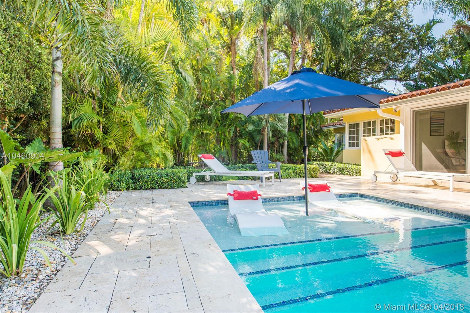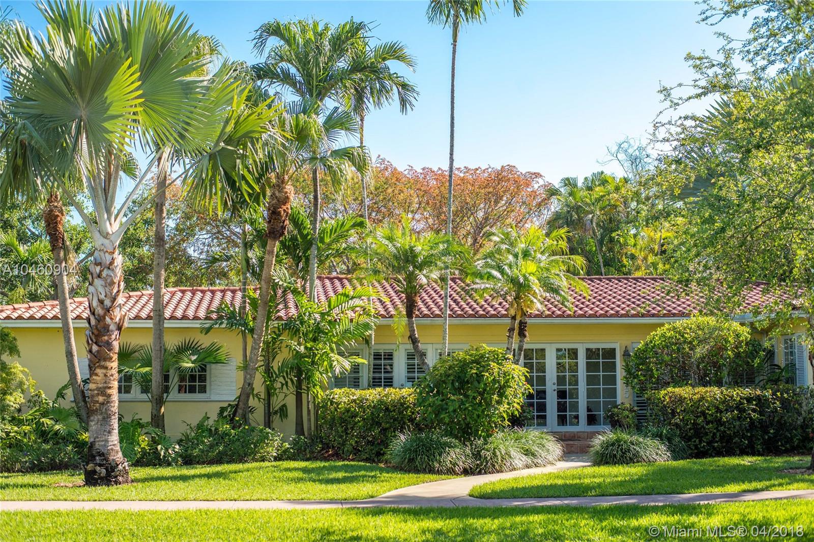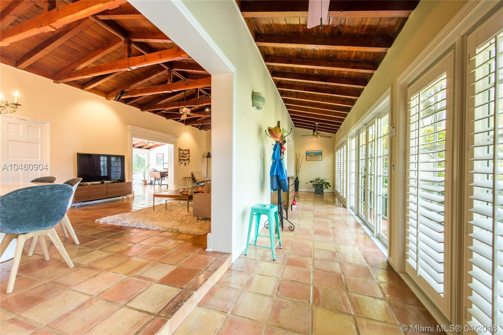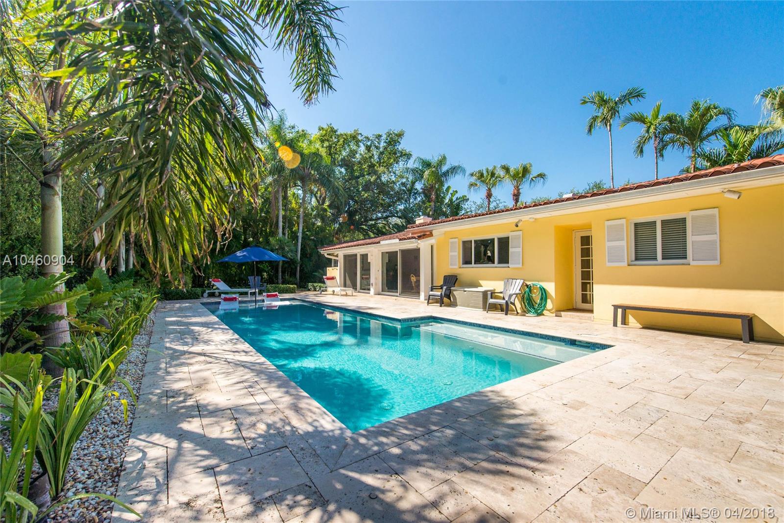 Classic mid-century home, on a quiet tree-lined street in coveted South Gables neighborhood. Updated & light-filled living spaces that feature vaulted, wood beamed ceilings, fireplace, terra-cotta flooring and impact glass throughout. 3BR/3BA plus den. Walls of glass overlook the lushly landscaped tropical garden ( 14,093 SF) which surrounds a spectacular new pool (heated) and limestone terrace. Custom kitchen with white wood cabinetry, granite countertops/backsplash and range with double-oven. Large master suite features marble bath with Jacuzzi tub & frameless glass-enclosed shower. Prime location in Sunset Elementary school district, is close to South Miami town center’s shopping, dining & entertainment and minutes to downtown Coral Gables, UM & Metrorail.