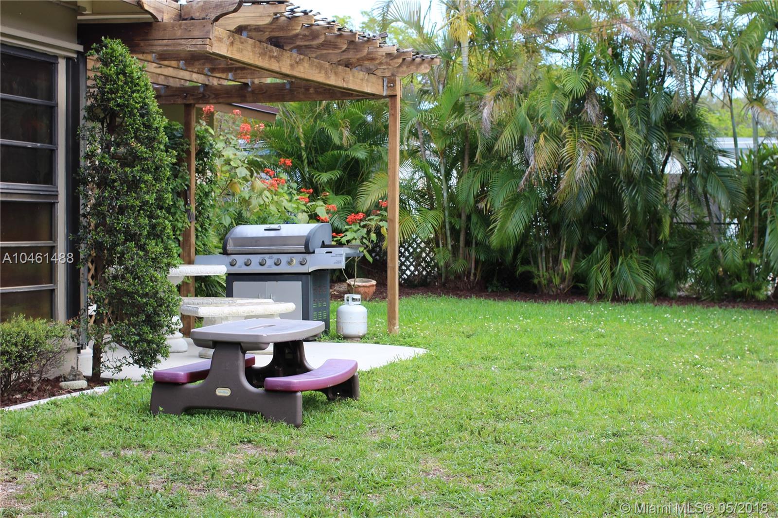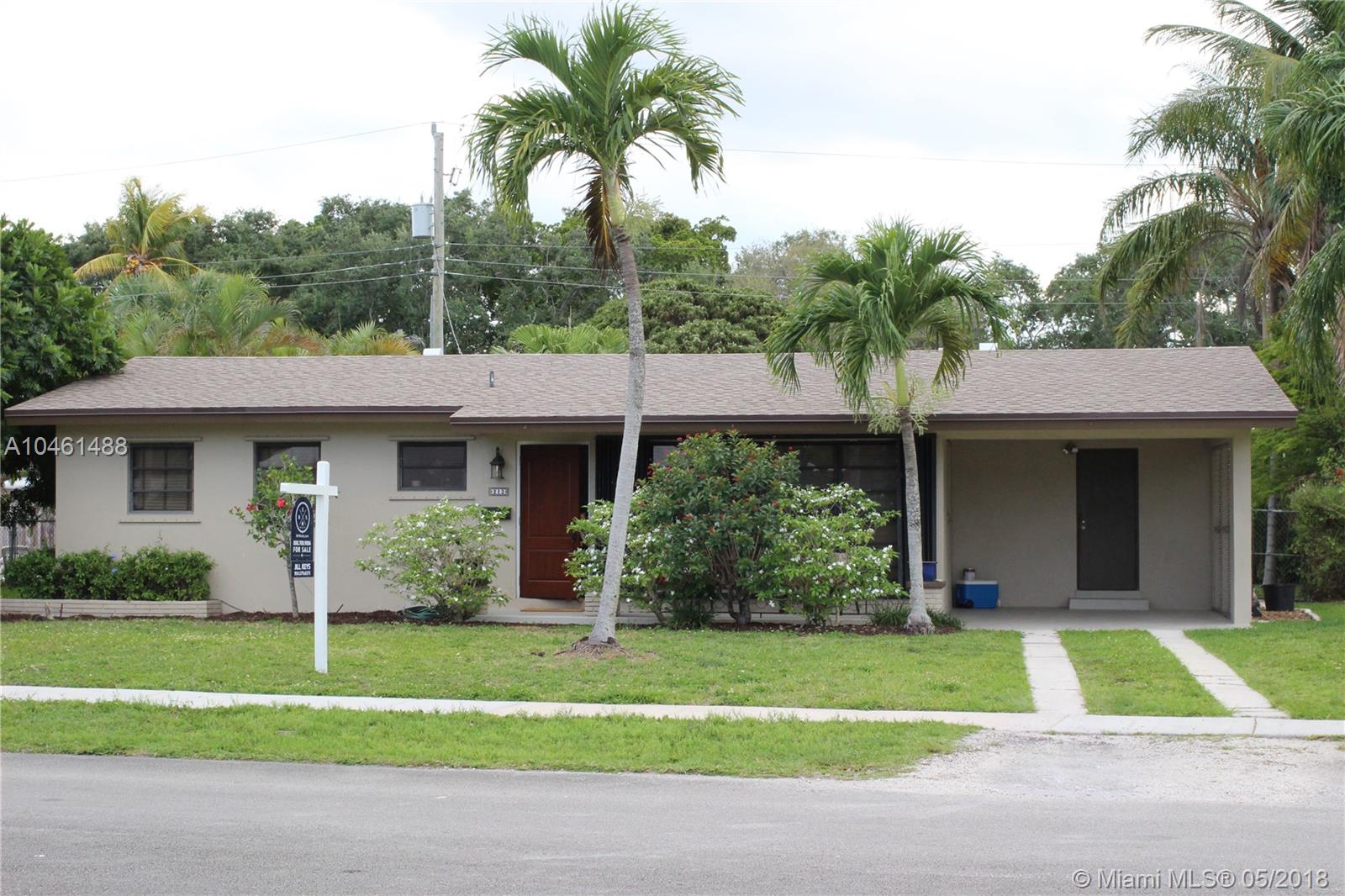 Fabulous Lawn Acres community, one story, single family home. Roof only one year old, A/C one year old with transferrable warranty. New Samsung Graphite finish French Door Refrigerator and matching dishwasher only 3 months old. Tons of windows/lots of natural light. Hurricane shutters on windows, some are accordion. New Wood front door. Gorgeous Brazilian Cherry, real wood floors throughout living areas. Front Load Maytag washer/dryer in separate in-house laundry room with extra storage. Lots of closet space. Huge, light, bright family room looks onto spacious, private fenced back yard with patio and pergola. French door from kitchen also leads to yard. One car carport. Master BR has en-suite bath with shower and walk in closet. Remodeled guest bath with tub/shower & pedestal sink.