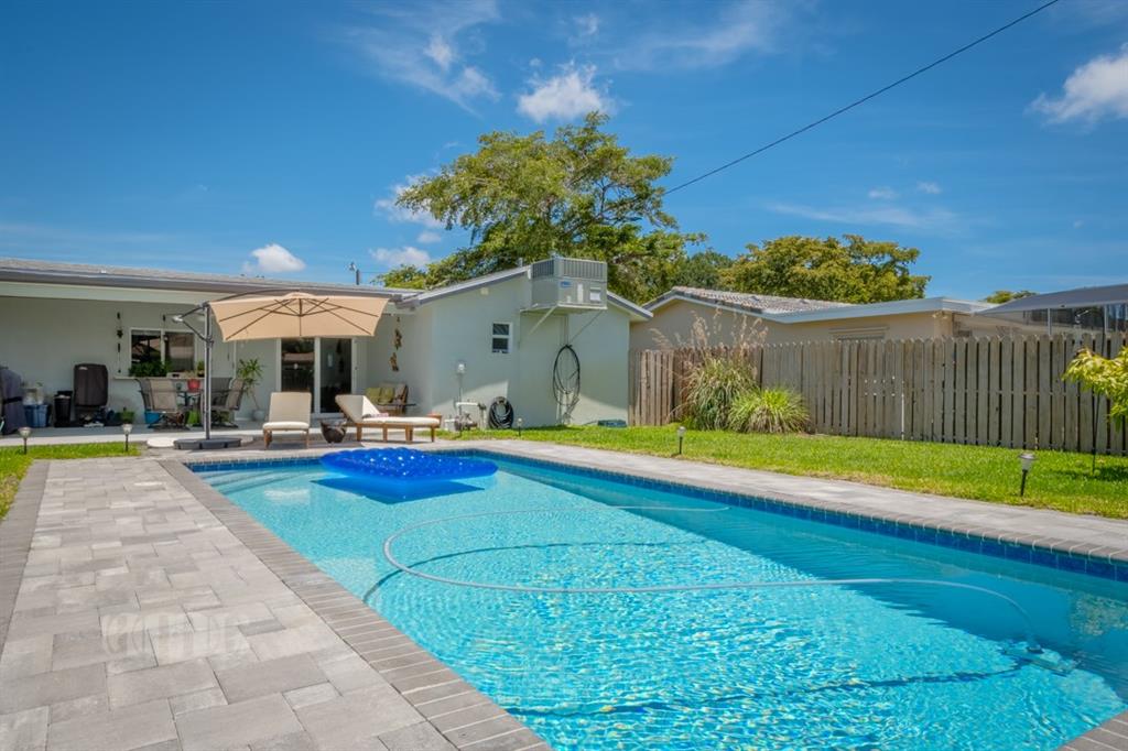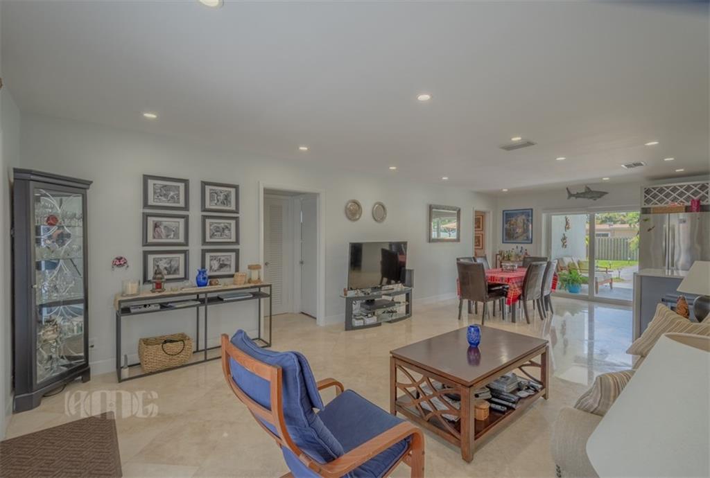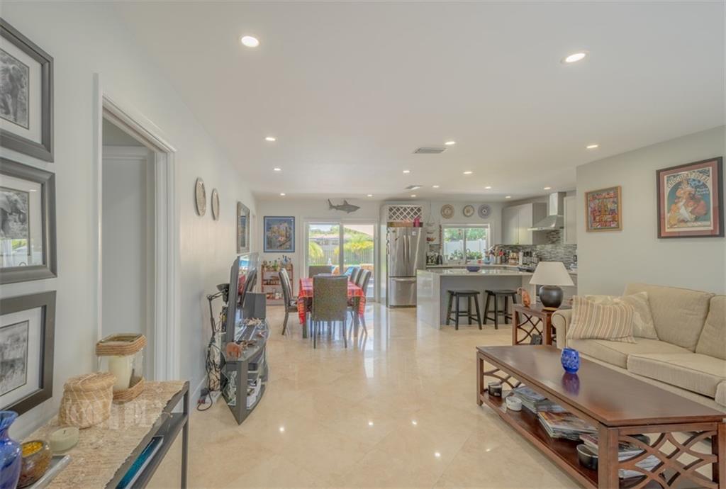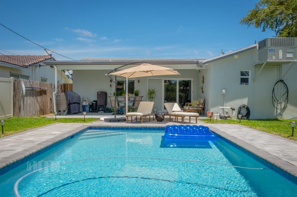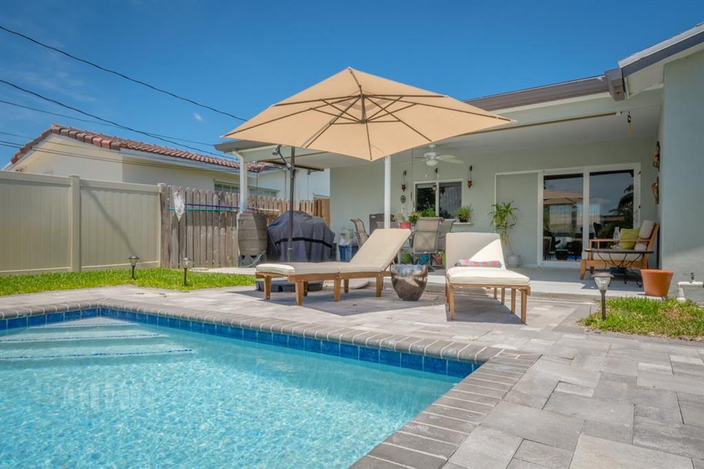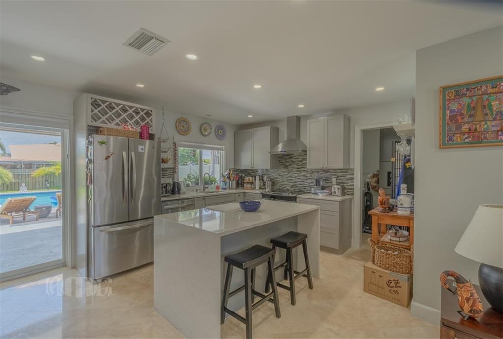 This 3/2 home has been BEAUTIFULLY remodeled with the best of everything! The Living/Dining/Kitchen "Great Room" is impeccable with glossy tile flooring & looks directly at the large pool & fenced yard. The open Kitchen has pale grey Shaker style cabinets, white quartz "waterfall" countertops & all stainless steel appliances. A marble tile backsplash, stainless range hood & island breakfast bar complete this Dream Kitchen. Impact doors/windows, garage, laundry & location make this your 'must have' home.