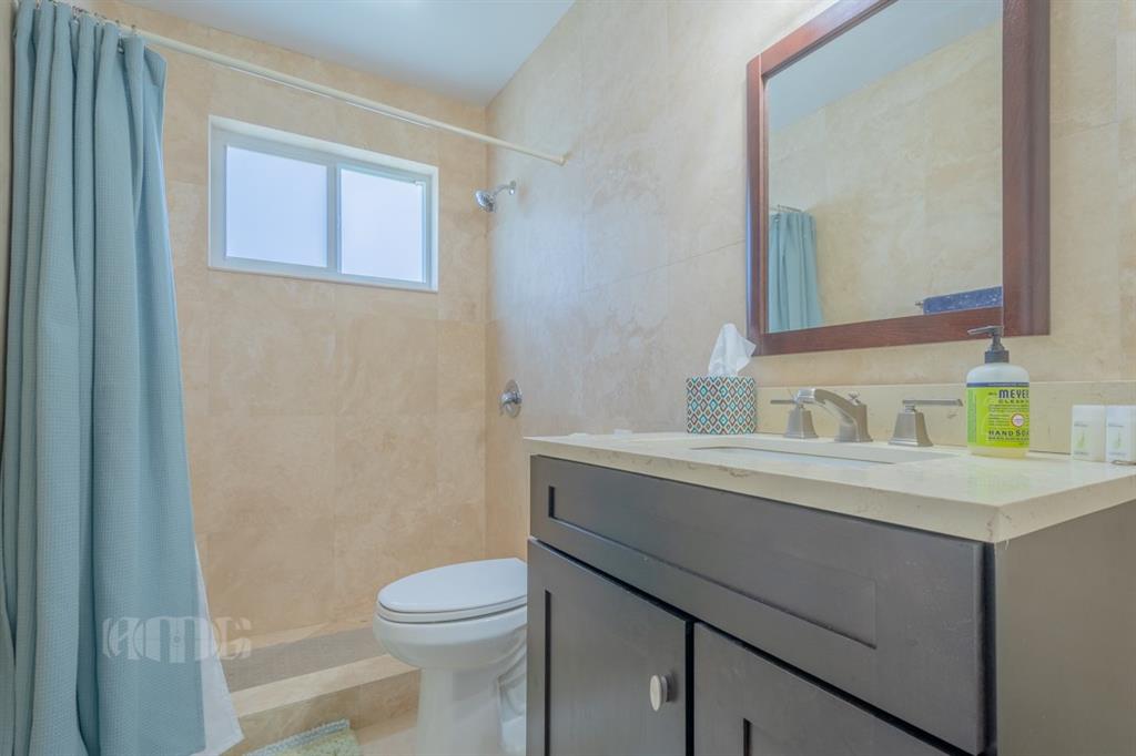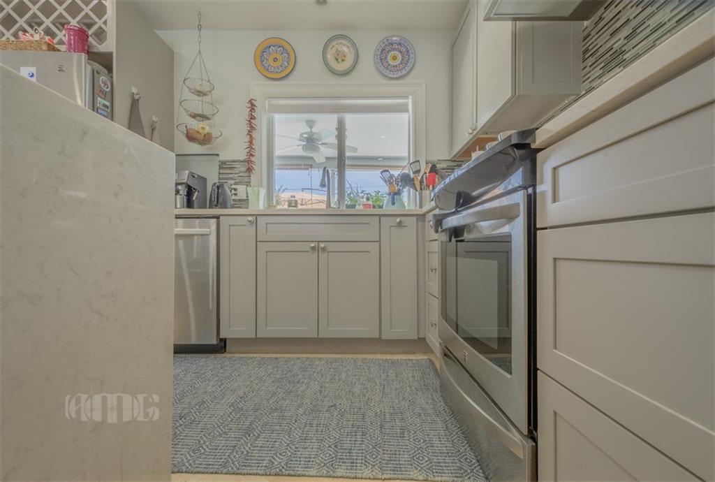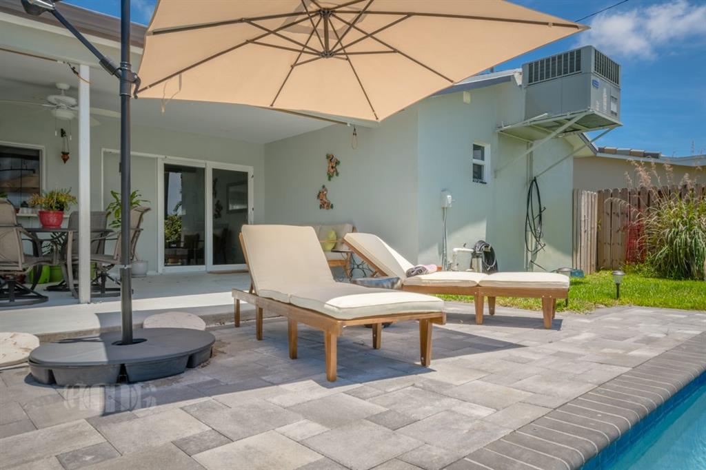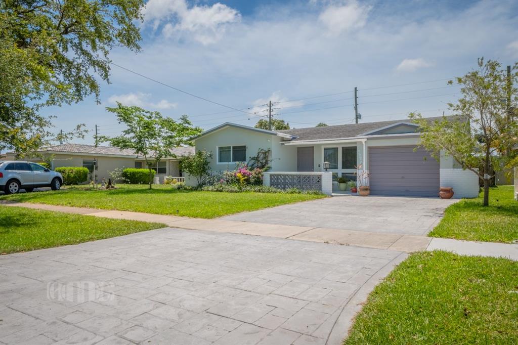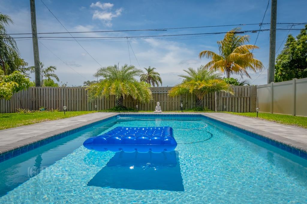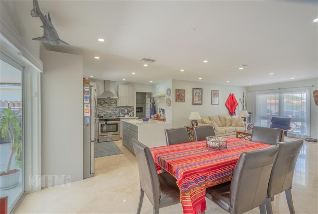 This 3/2 home has been BEAUTIFULLY remodeled with the best of everything! The Living/Dining/Kitchen "Great Room" is impeccable with glossy tile flooring & looks directly at the large pool & fenced yard. The open Kitchen has pale grey Shaker style cabinets, white quartz "waterfall" countertops & all stainless steel appliances. A marble tile backsplash, stainless range hood & island breakfast bar complete this Dream Kitchen. Impact doors/windows, garage, laundry & location make this your 'must have' home.