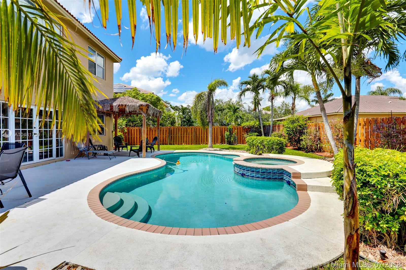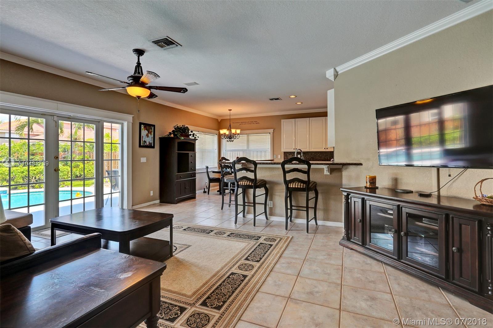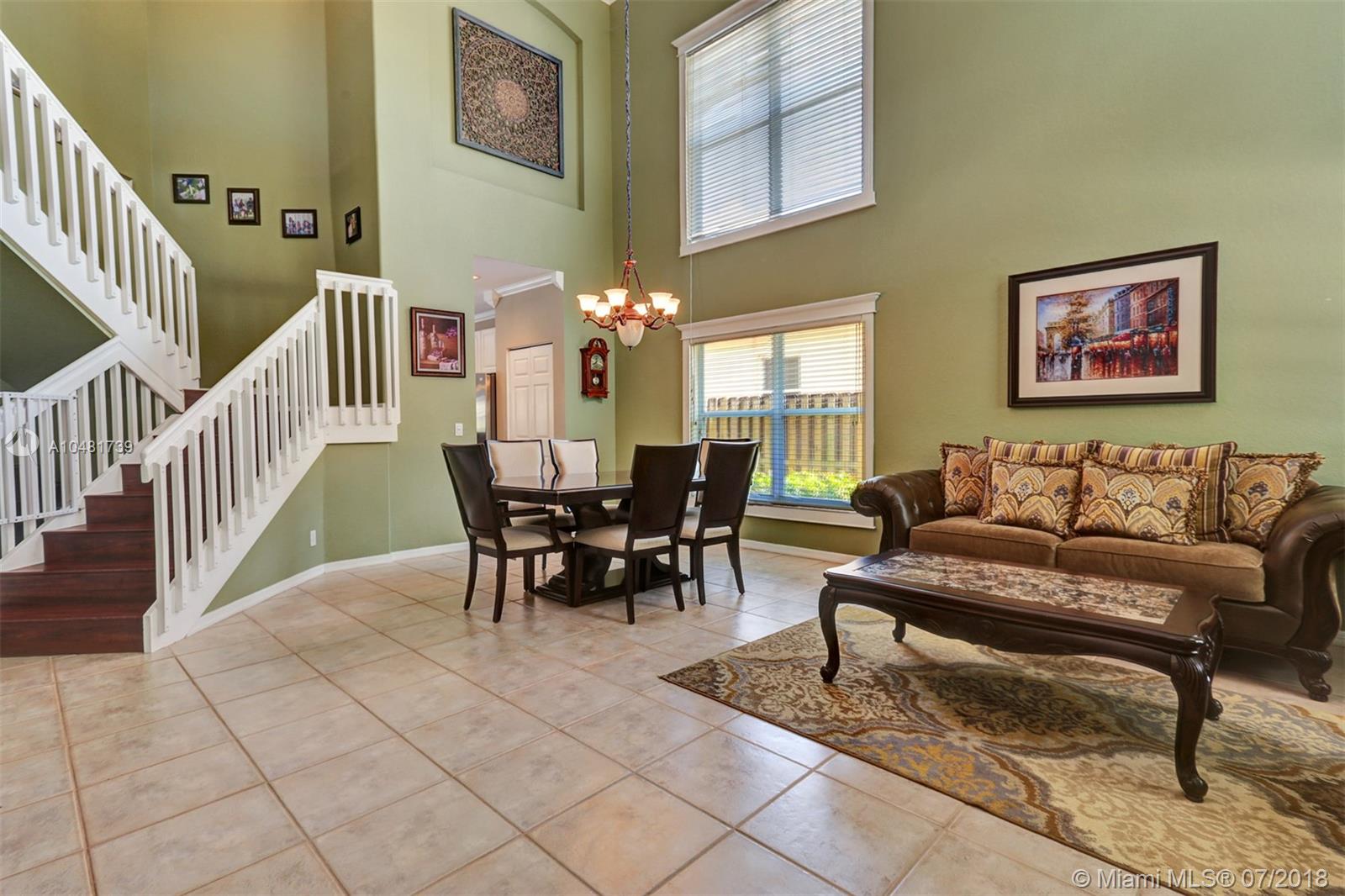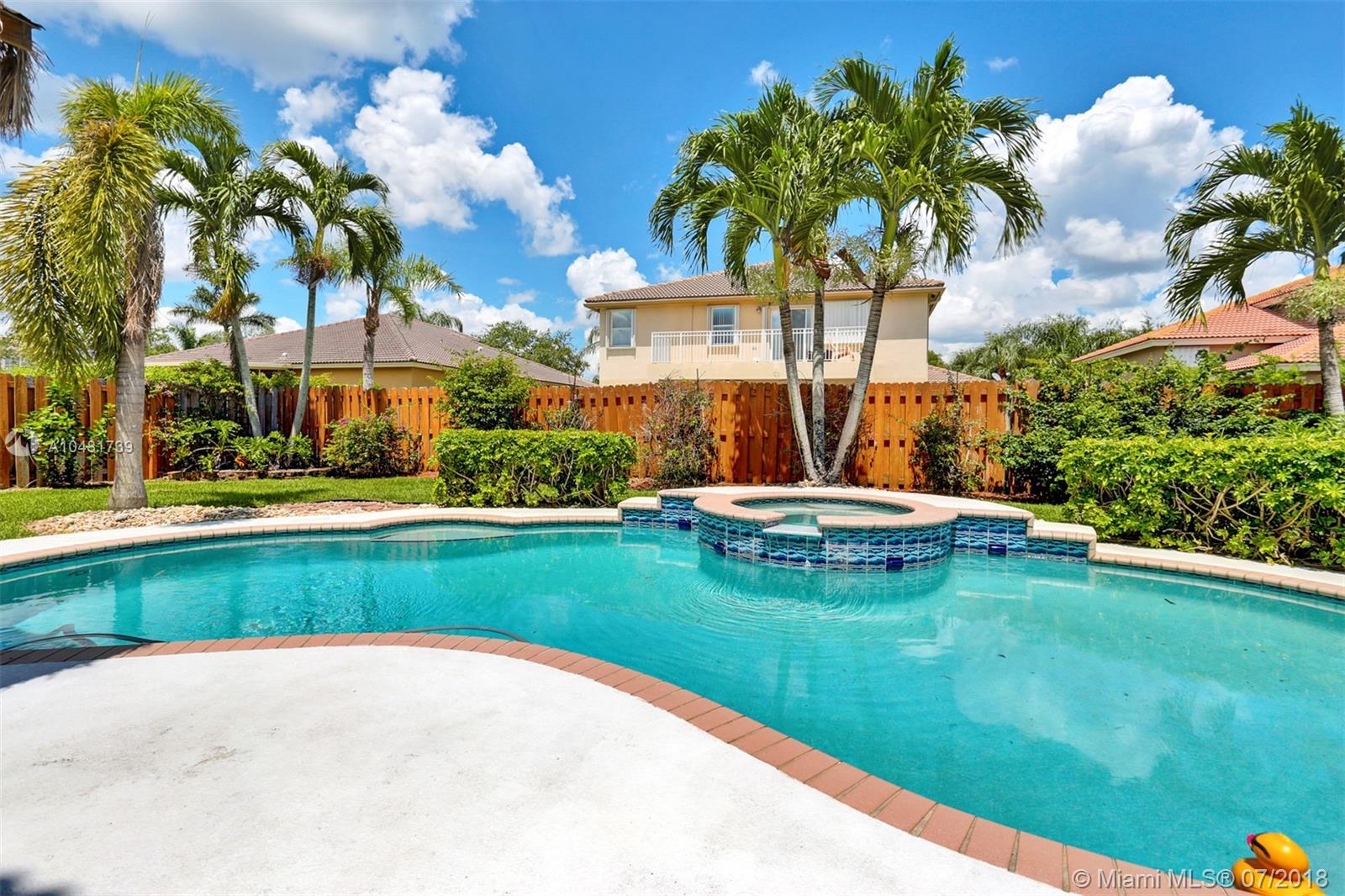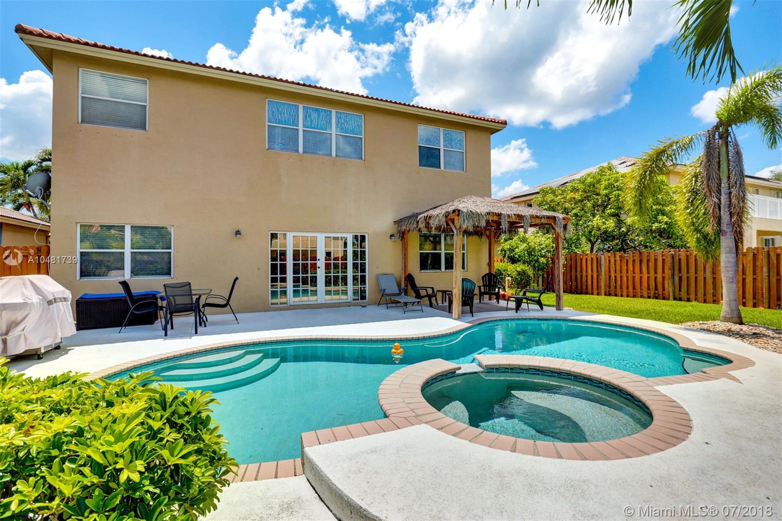 Two story 3100' sq. with 5BR/3BA plus loft. Fully fenced yard and patio plus pool and spa. Master bedroom upstairs, one bedroom downstairs. Ceramic flooring on the social areas, carpeted bedrooms. Granite kitchen counters, white wooden cabinets and stainless steel appliances. Maintenance includes basic cable, security, landscaping and irrigation, guarded gate entry, community pool and gym, common areas,