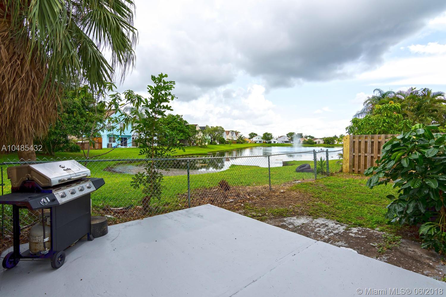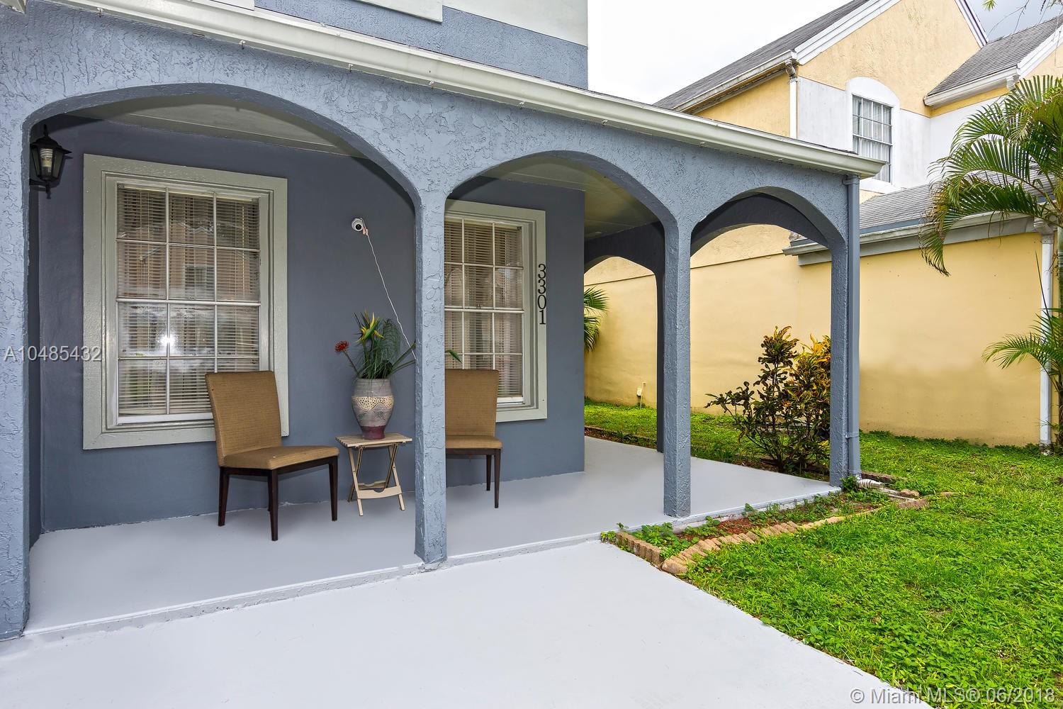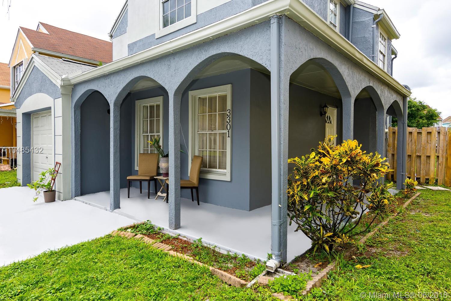 Charming starter home with serene lagoon view in the community of Hampshire Homes. Located just east of Palm Avenue and south of Miramar Parkway, it features large porcelain tile throughout the first floor and carpet on stair and second floor, honey maple wood cabinets and granite finish - Formica counter tops in kitchen, and updated bathrooms. Spacious master with walking closet and two generously comfortable guest bedrooms upstairs. Recently painted exterior and driveway! Enjoy family barbecues in fenced back yard overlooking the water or quite afternoons sitting in the wrap around porch. Come see it soon!