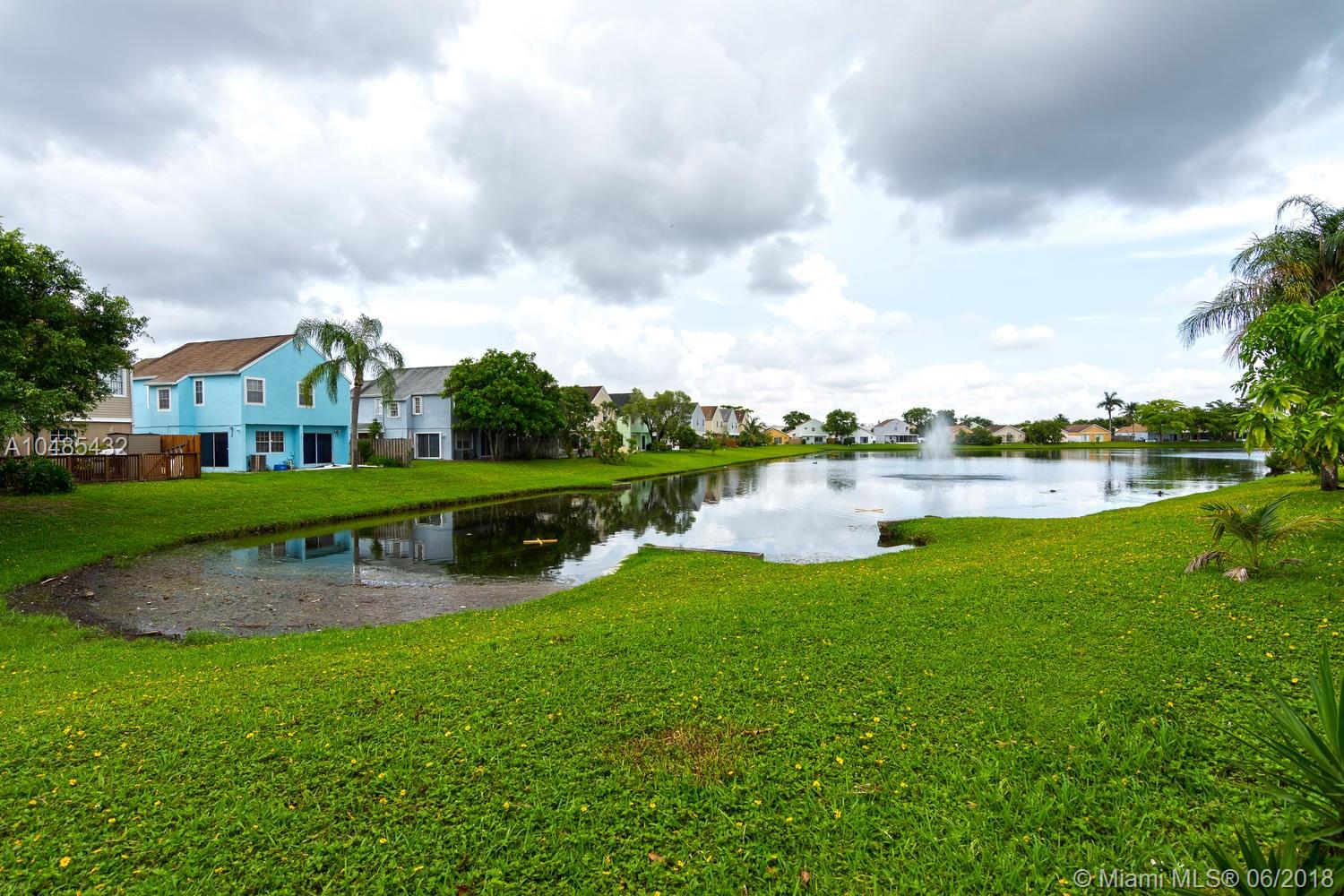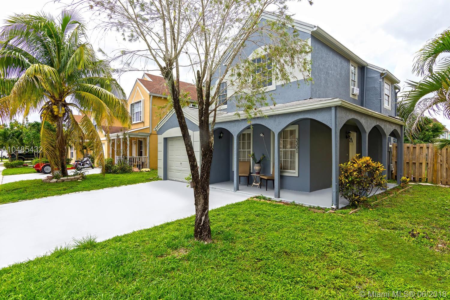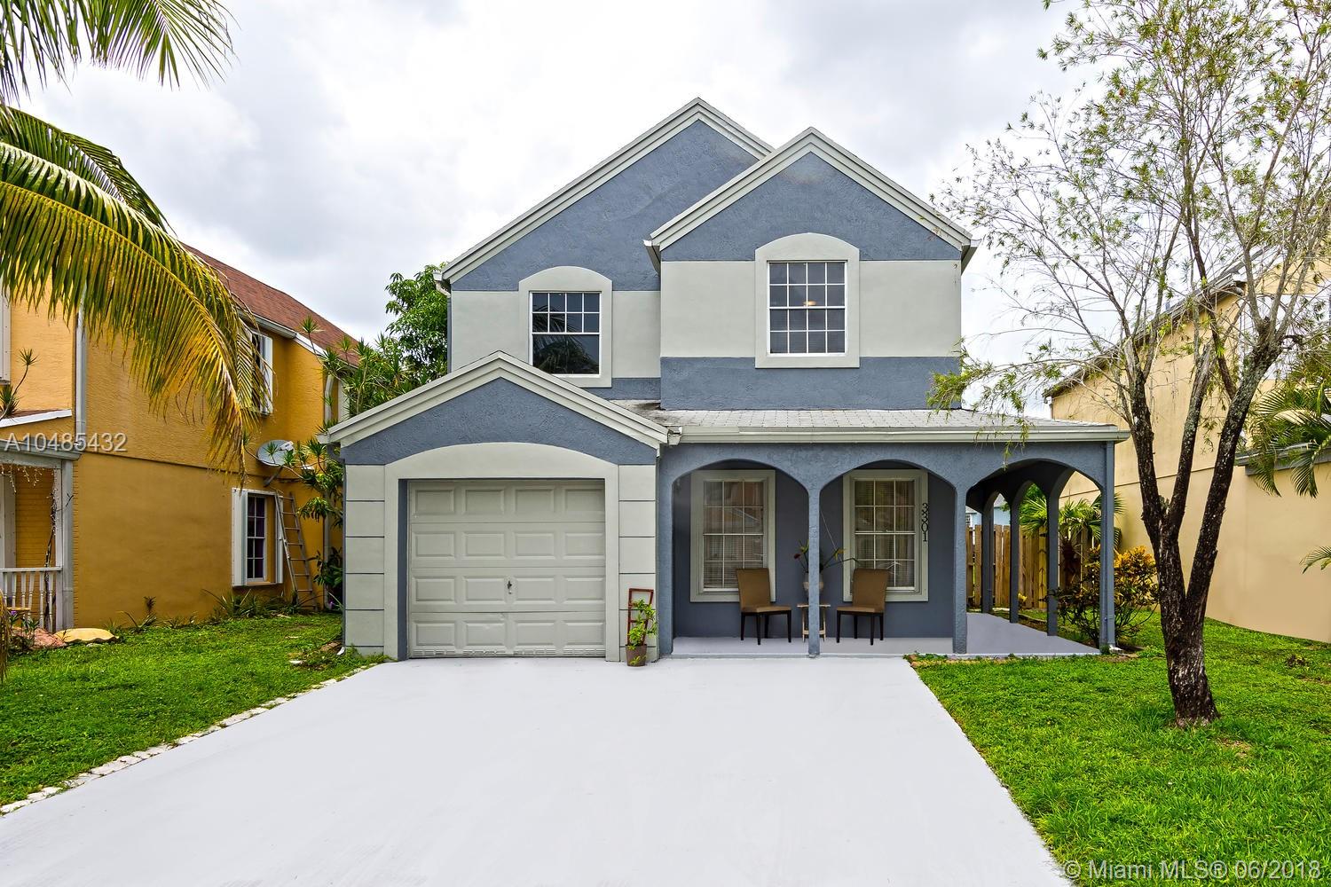 Charming starter home with serene lagoon view in the community of Hampshire Homes. Located just east of Palm Avenue and south of Miramar Parkway, it features large porcelain tile throughout the first floor and carpet on stair and second floor, honey maple wood cabinets and granite finish - Formica counter tops in kitchen, and updated bathrooms. Spacious master with walking closet and two generously comfortable guest bedrooms upstairs. Recently painted exterior and driveway! Enjoy family barbecues in fenced back yard overlooking the water or quite afternoons sitting in the wrap around porch. Come see it soon!