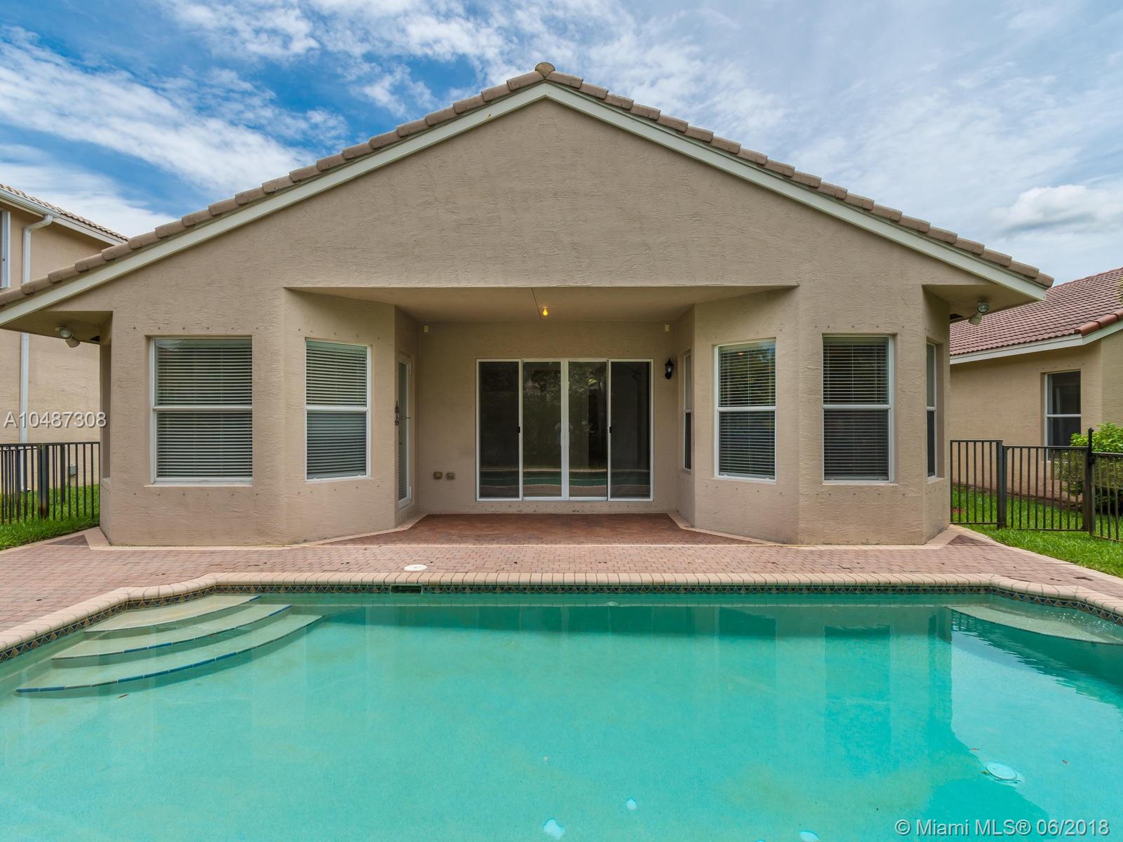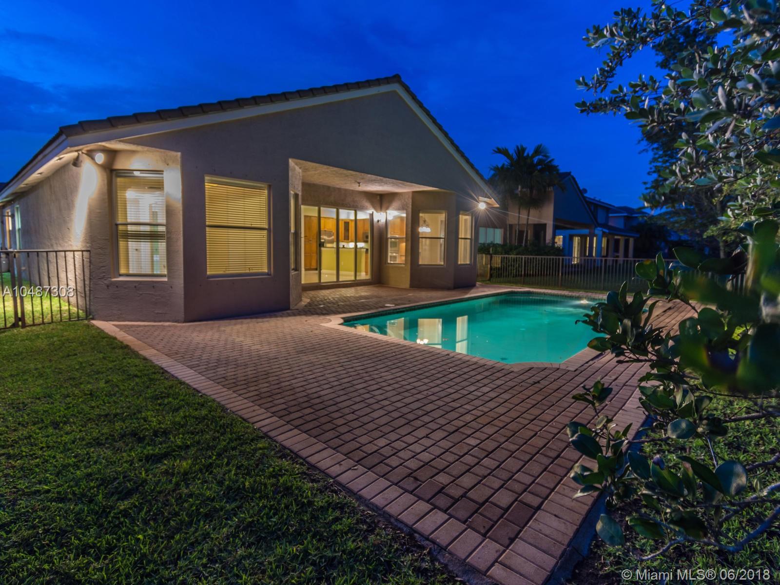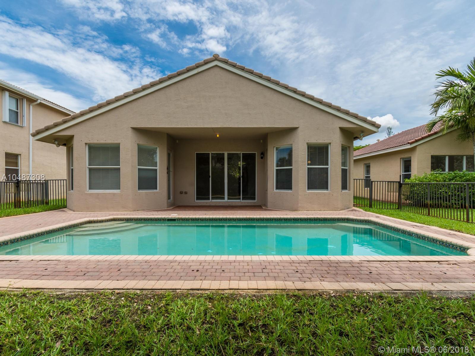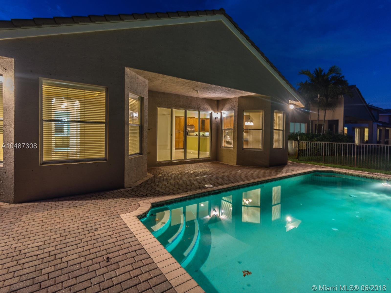 **DESIRED SUZANNA MODEL WITH POOL**4 BEDROOMS, 3 FULL BATHROOMS, 2 CAR GARAGE. PAVER DRIVEWAY HEAD TO DOUBLE DOOR MAIN ENTTRANCE. TRIPLE SPLIT FLOOR PLAN. 10' HIGH CELLINGS. ELEGANT CROWN MOLDING ALL AROUND. DIAGONAL TILE IN SOCIAL AREAS AND BATHROOMS;LAMINATED WOOD FLOORING IN BEDROOMS. UPGRADED WOOD CABINETS IN KITCHEN WITH BLACK GRANITE AND SS APPLIANCES. BREAKFAST NOOK WITH POOL VIEW. FORMAL LIVING AND DINING. OPEN FAMILY ROOM HEAD TO PAVERED POOL AREA. FENCED PATIO, PERFECT FOR FAMILY ENTERTAINTMENT.KIDS FENCE FOR POOL AT THE GARAGE. SPACIOUS MASTER ROOM WITH TWO WALKING CALIFORNIA CLOSETS.ROMAN TUB AT MASTER BATHROOM.SEPARATE SHOWER WITH TEMP GLASS DOOR.HER AND HIS SINK. AND MUCH MORE..CLUB HOUSE WITH TENNIS COURTS, GYM,PLAY GROUND, BASKETBALL.GUARD GATE 24/7.COME!, YOU WILL LOVE IT!