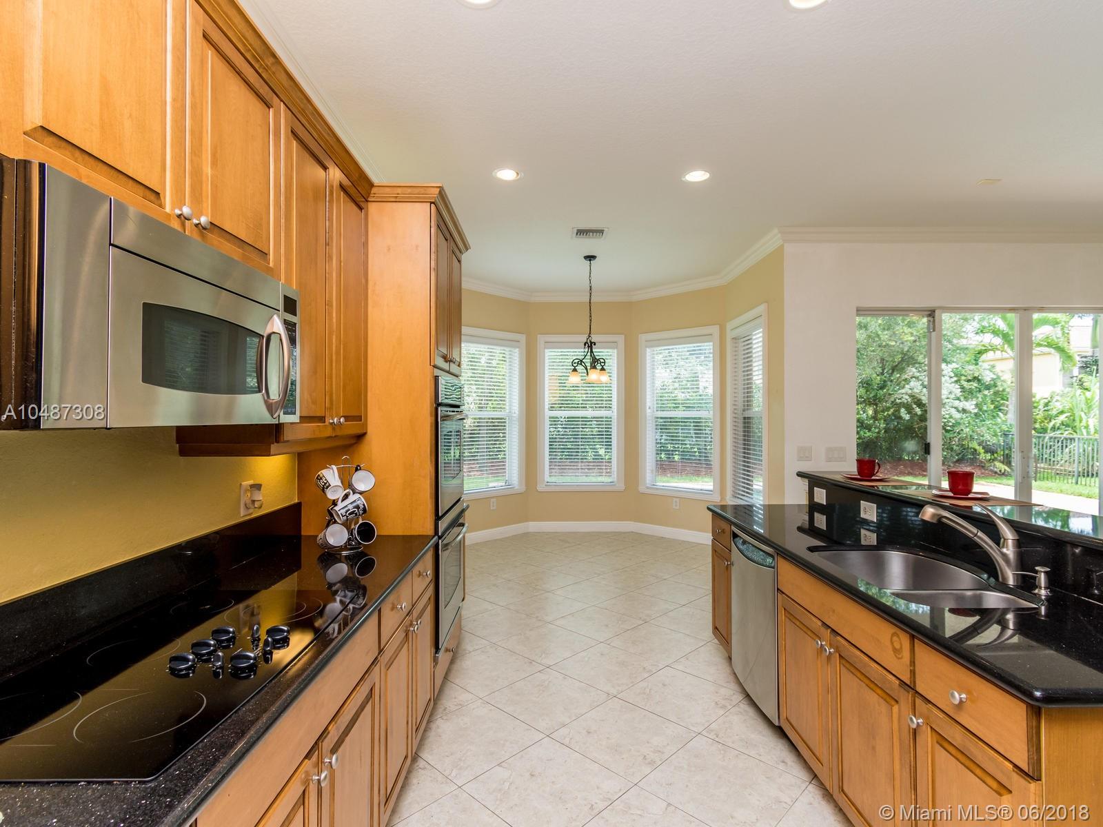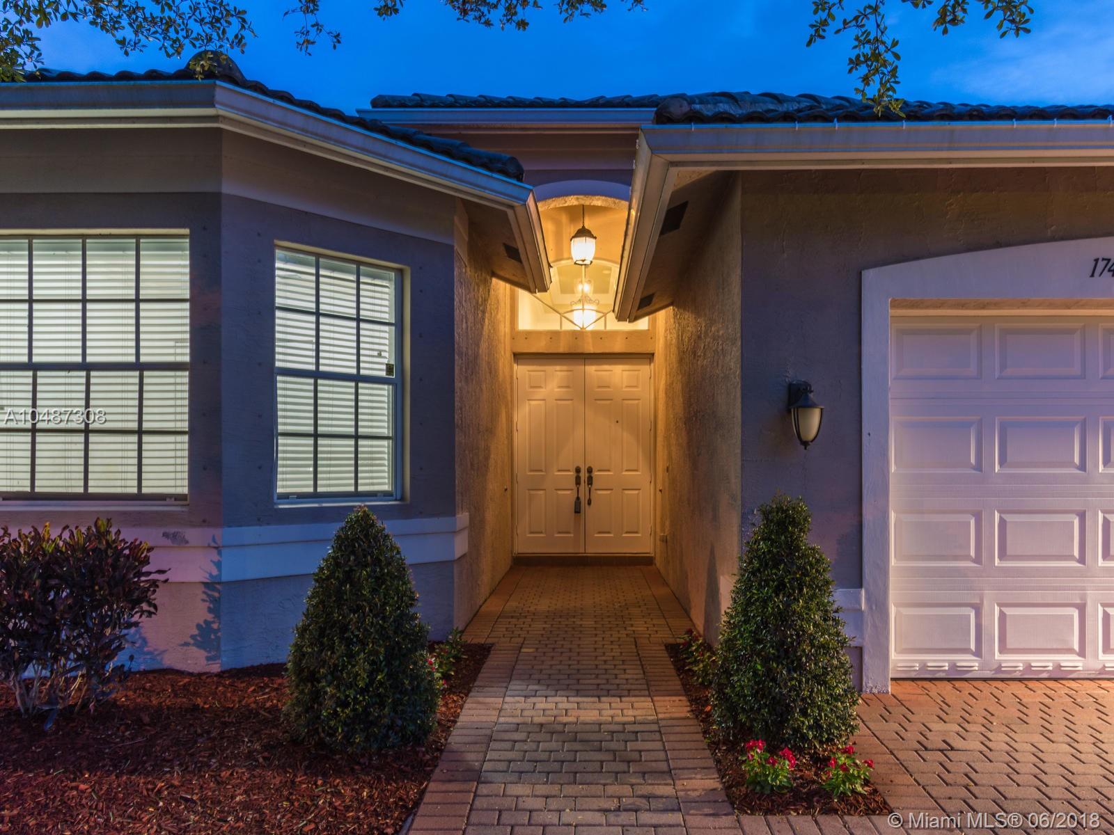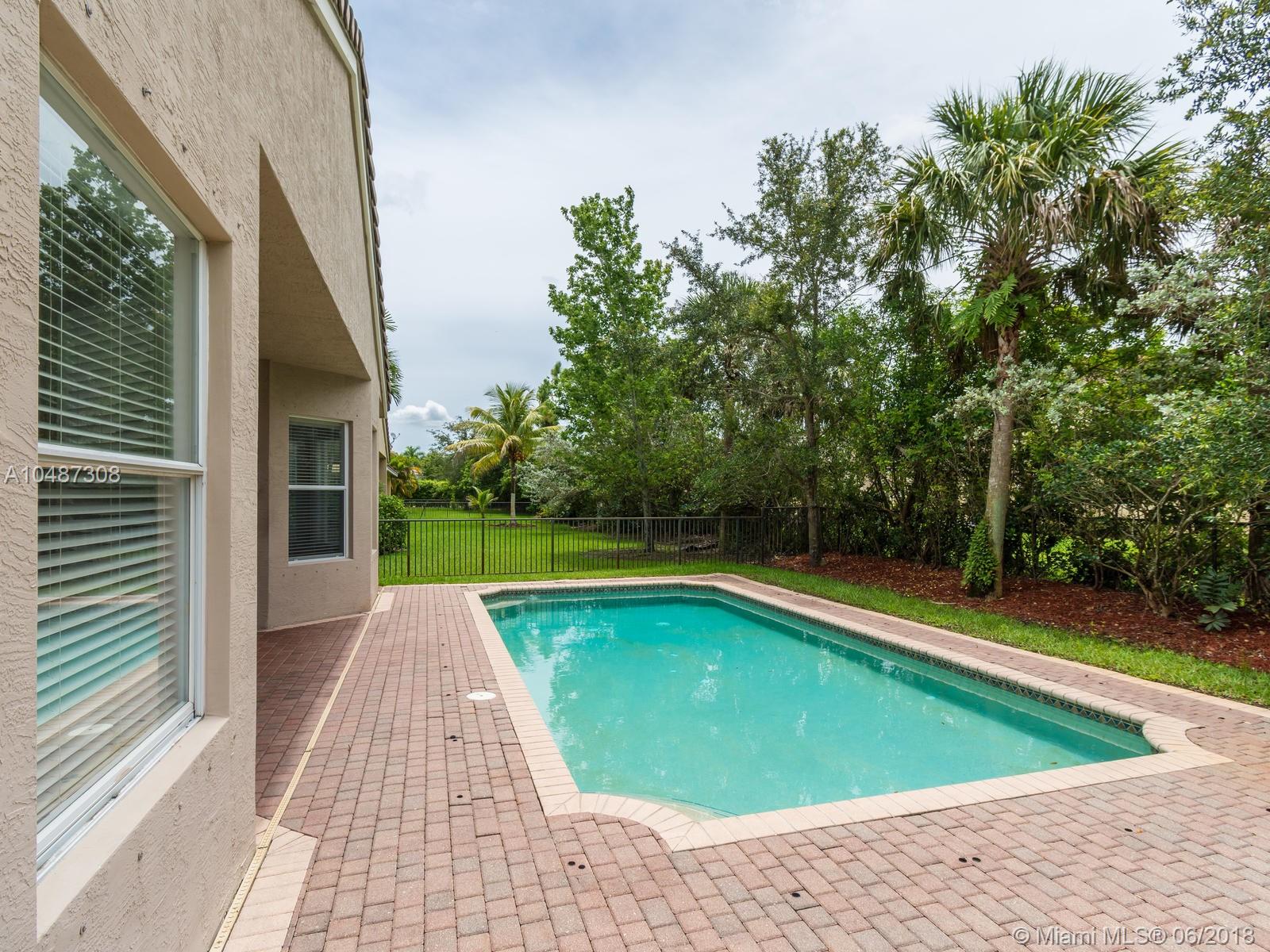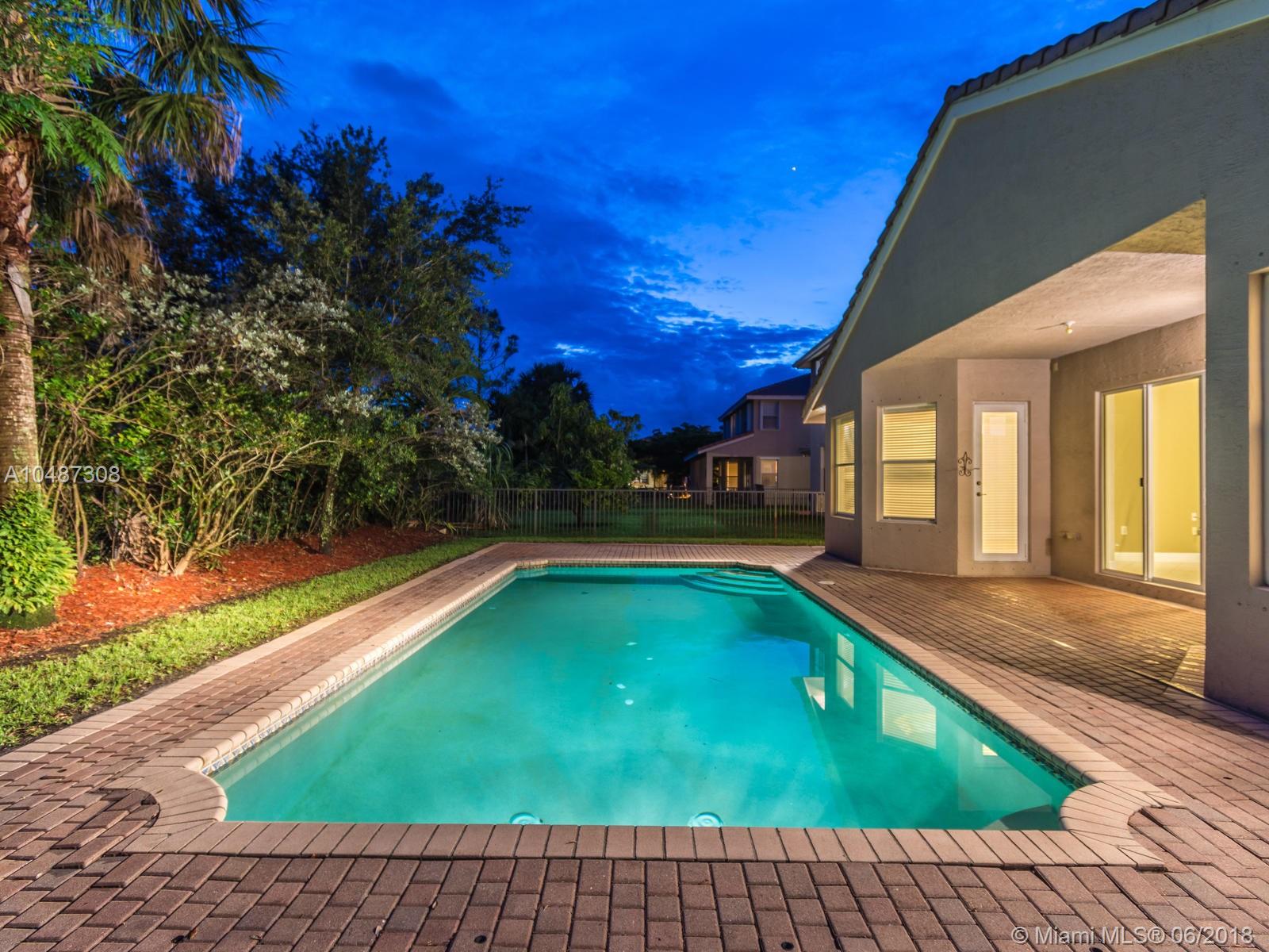 **DESIRED SUZANNA MODEL WITH POOL**4 BEDROOMS, 3 FULL BATHROOMS, 2 CAR GARAGE. PAVER DRIVEWAY HEAD TO DOUBLE DOOR MAIN ENTTRANCE. TRIPLE SPLIT FLOOR PLAN. 10' HIGH CELLINGS. ELEGANT CROWN MOLDING ALL AROUND. DIAGONAL TILE IN SOCIAL AREAS AND BATHROOMS;LAMINATED WOOD FLOORING IN BEDROOMS. UPGRADED WOOD CABINETS IN KITCHEN WITH BLACK GRANITE AND SS APPLIANCES. BREAKFAST NOOK WITH POOL VIEW. FORMAL LIVING AND DINING. OPEN FAMILY ROOM HEAD TO PAVERED POOL AREA. FENCED PATIO, PERFECT FOR FAMILY ENTERTAINTMENT.KIDS FENCE FOR POOL AT THE GARAGE. SPACIOUS MASTER ROOM WITH TWO WALKING CALIFORNIA CLOSETS.ROMAN TUB AT MASTER BATHROOM.SEPARATE SHOWER WITH TEMP GLASS DOOR.HER AND HIS SINK. AND MUCH MORE..CLUB HOUSE WITH TENNIS COURTS, GYM,PLAY GROUND, BASKETBALL.GUARD GATE 24/7.COME!, YOU WILL LOVE IT!