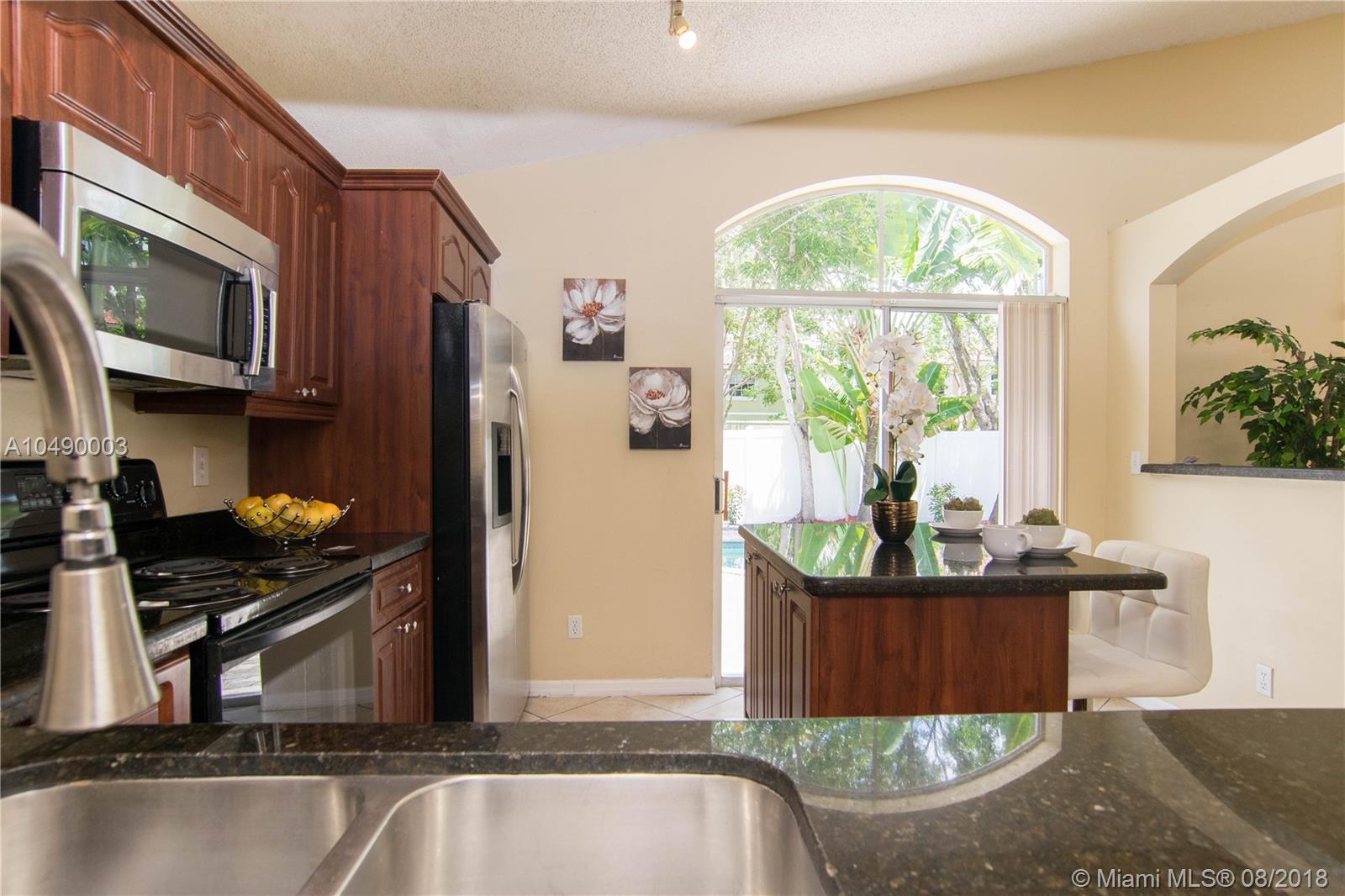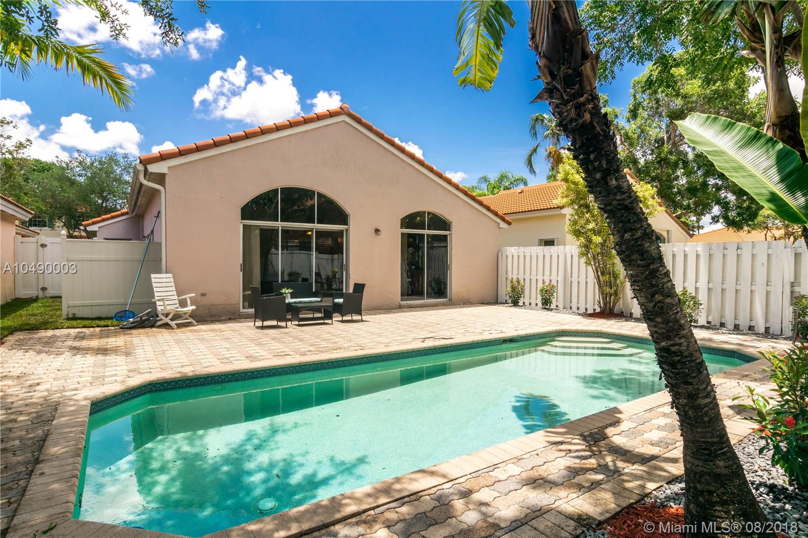 Superb remodeled 4 BR, 2 Bath pool single family home in gated Emerald Isles of Weston. Not huge square foot-wise but feels much bigger via super design, layout. Double sets of sliding glass doors open to tropical paradise, fully fenced yard, no neighbors behind, your own private pool. Just competed remodeling the master suite-new new wood-look tile plank flooring, fully remodeled master bath. Kitchen was already remodeled/upgraded with wood cabinetry and granite countertops. Walk to community pool, top Weston schools, Tequesta Park. Roof, A/C both less than 2 years old. Newer kitchen appliances, washer, dryer and hot water heater. Unique opportunity at this price range. Close to Weston Town Center, parks, hospital, houses of worship and I-75 for easy commutes in every direction