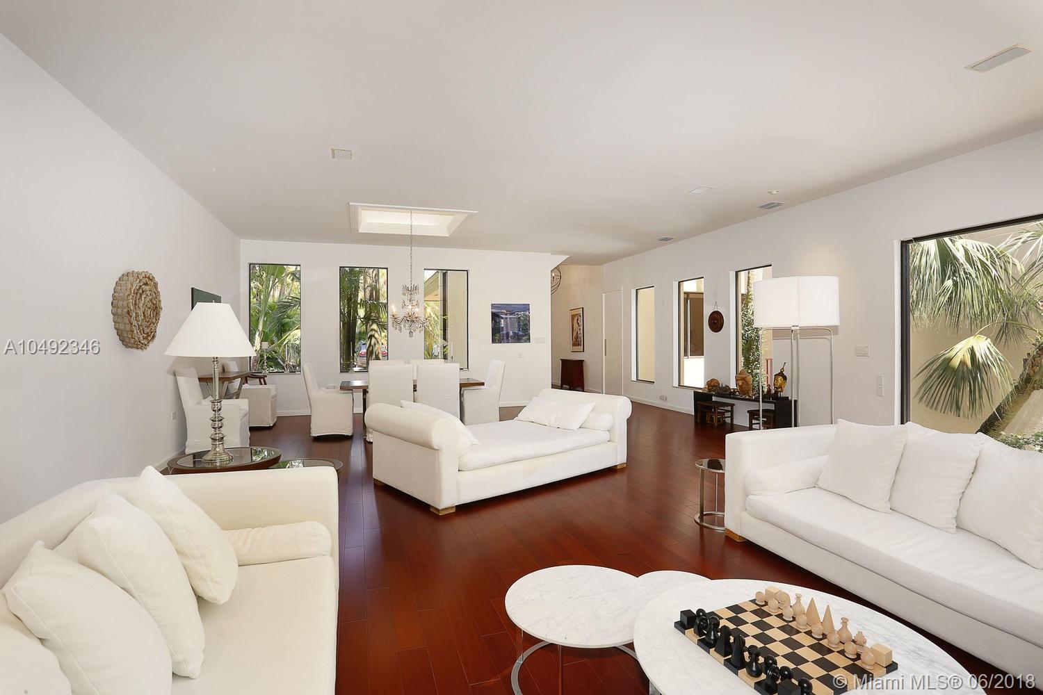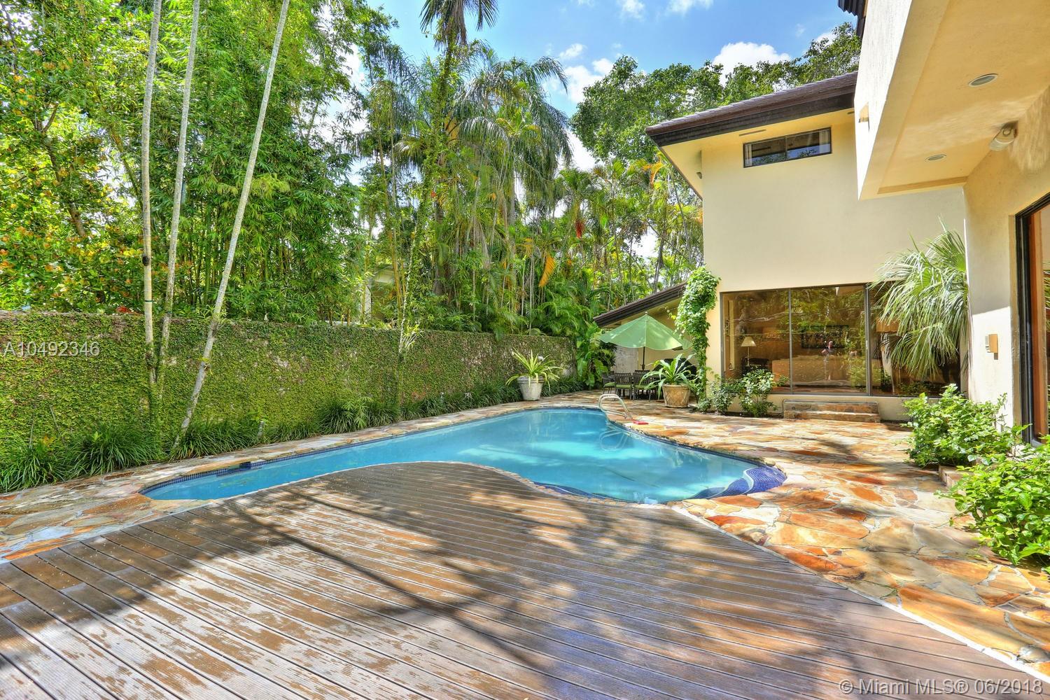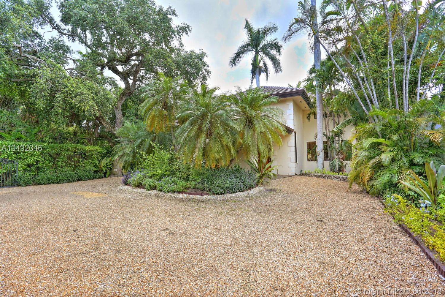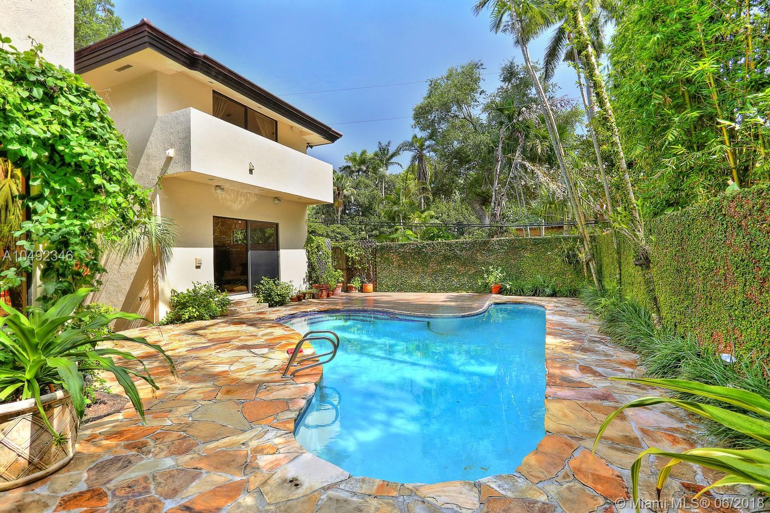 Lovely gated home, set back behind a coral rock wall & privacy hedge in lush South Coconut Grove. Light-filled rooms with high ceilings & stunning new hardwood flooring. Formal living, dining and family room, overlook tropical garden. Open kitchen features wood cabinetry, granite countertops, stainless appliances & adjacent breakfast area. Downstairs guest/housekeepers room. Second floor consists of 3 bedrooms with new en-suite baths and a large master suite with separate sitting area, balcony & new spa-like master bath. Expansive, walled backyard with tropical pool and terrace. New roof. Walk to highly rated private schools and to the Grove village center’s galleries, boutiques, cafes, bayfront parks & marinas. Minutes to downtown, MIA, Coral Gables, Key Biscayne and the Beaches.