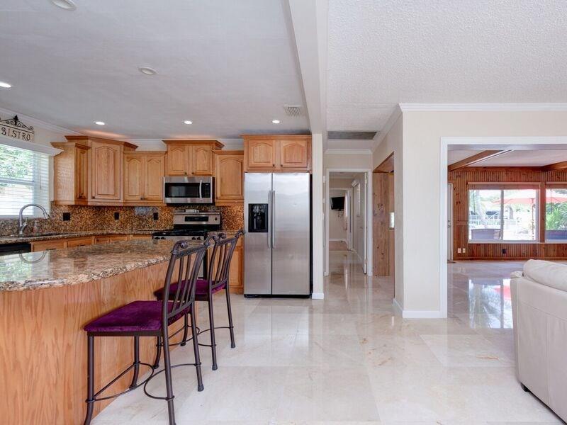 Motivated Seller! Ocean Access Pool Home w/ Private Dock. Marble flooring throughout and wood in bedrooms. HOME WARRANTY FOR ALL Major Appliances & Pool incl. til 4/2019. Updated electric! Open concept kitchen w/ large cooking Island. 2 wine fridges. Tons of cabinets w/ lights& pullouts. Fenced yard, pool w/ baby gate & rock water fall Cabana Bath w/ dual sinks. Gas oven. Big laundry rm w/ storage + Shed/Work room. Eastern exposure. Walk to Mcnab elementary. 1 Blk to shops & US1. MB has central air AND New wall a/c saves energy. 1 fixed Bridged Newly pavered driveway. All pavers recently sealed.