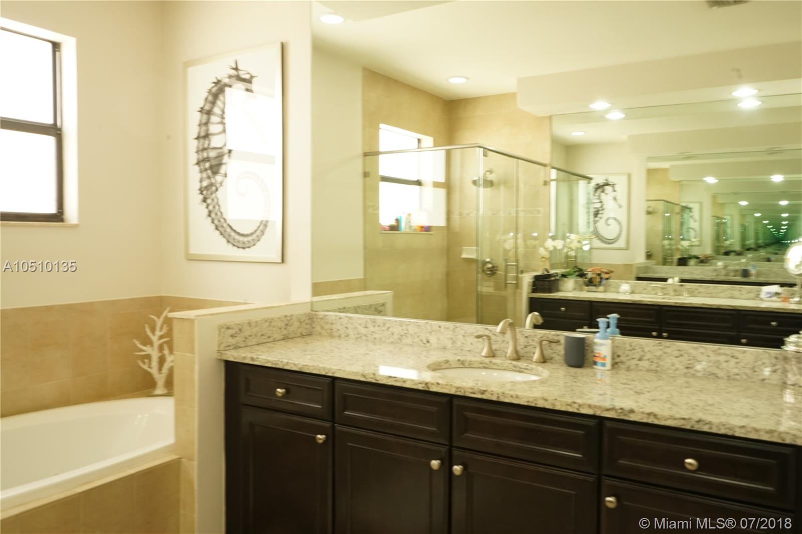 Modern design house in the desirable gated Community at Grand Bay in the prestigious City of Doral. Great open design floor plan, 2 story home with 4 bedrooms & 3.5 baths, porcelain floors throughout the downstairs & bamboo wood floor upstairs. Modern staircase with stone accent wall. The kitchen is big & open and features recessed lighting, dark brown cabinetry, granite counter tops, stainless steel appliances, double wall oven & wine cooler. Family room with an amazing TV wall unit. Master suite with his & hers walk in closets. Covered patio overlooking the lake with travertine floors & custom made barbecue area - great for entertaining. You & your family can enjoy the resort style amenities that include pool, jacuzzi, sauna, steam room, fitness center & children's play area.
