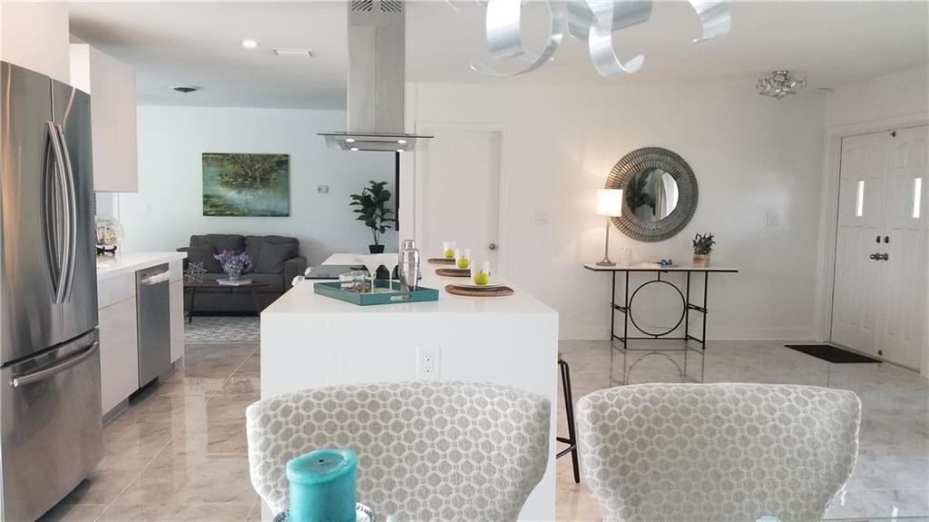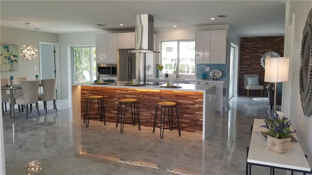 Complete remodel w/permits in sought after Coral Ridge Isles! Ocean access pool home offers 78' waterfront & private dock. Split floor plan, open concept kitchen,living,dining & family rooms show off the sprawling entertaining spaces that flow outside to the pool area. Huge cooking island w/quartz countertop & waterfall edge, modern all new custom kitchen cabinets, just bring the dishes. New 24x24 porcelain tile throughout. NEW vertical impact windows, sliders, roof, electric panels, driveway & MUCH MORE!