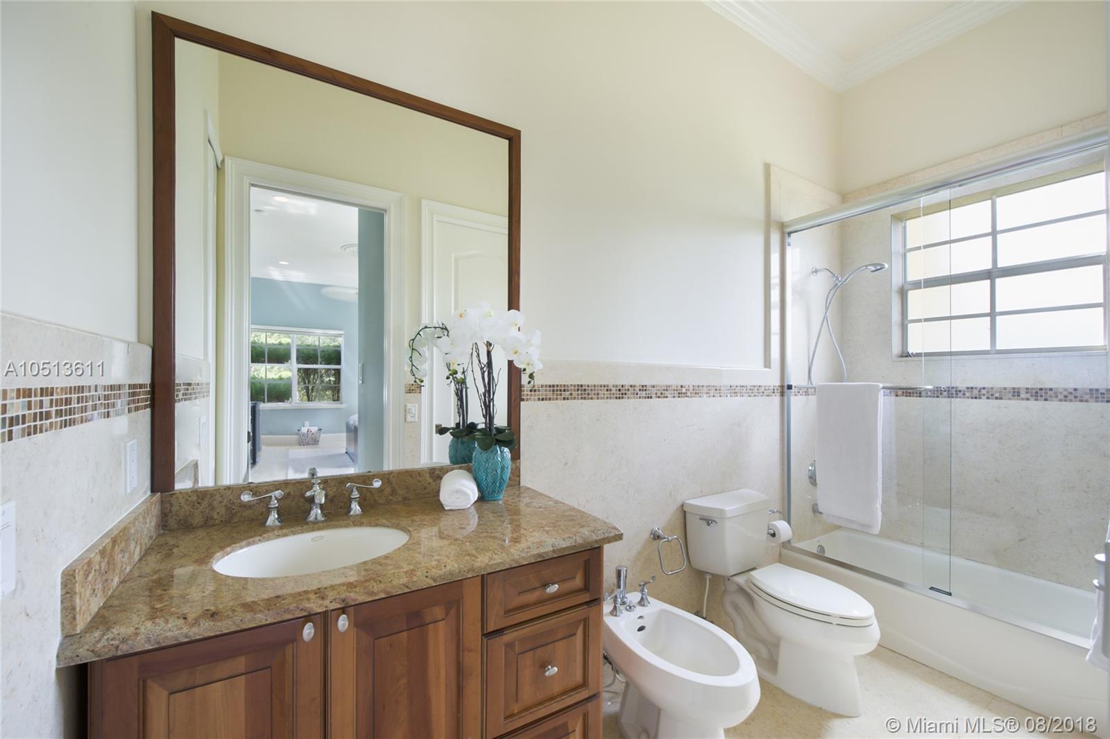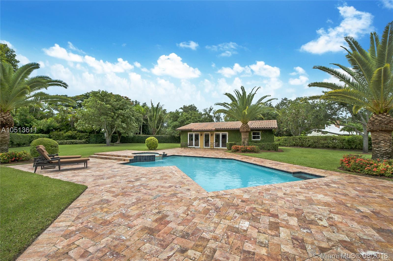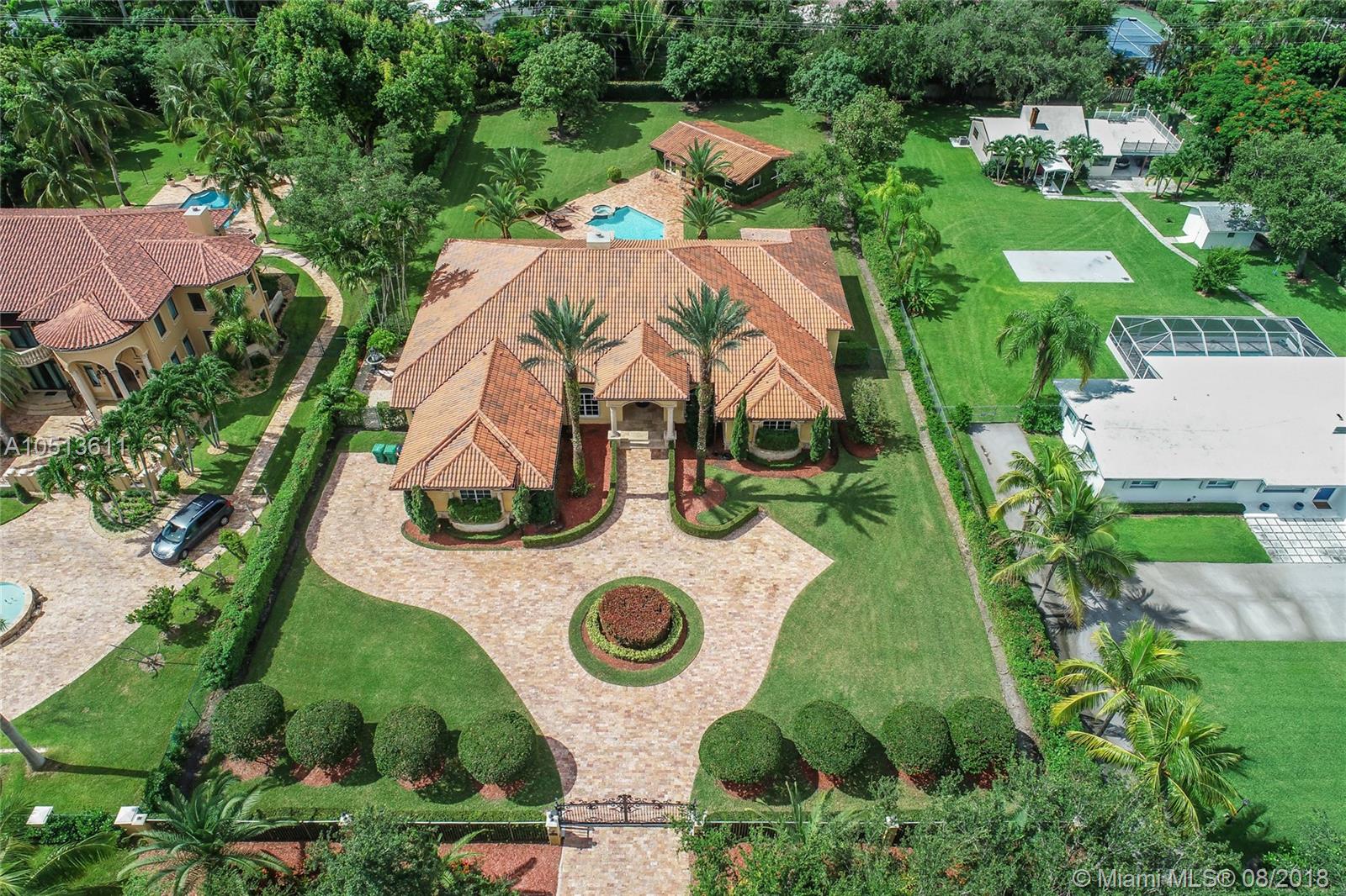 Magnificent Mediterranean design estate home with detached pool/guest house. Home is nestled on lush, gated acre lot in sought after northeast Pinecrest. The main house, 5B/5B with good quality finishes and great appointments, guest house 2B/1B. Beautiful entryway with gorgeous marble floors with onyx inlays, lighted art niches & fireplace. Grand MB w/sitting area and enormous walk-in closet, gourmet kitchen, coffered ceiling in the large family room with wet bar. A home to be enjoyed and relax in!