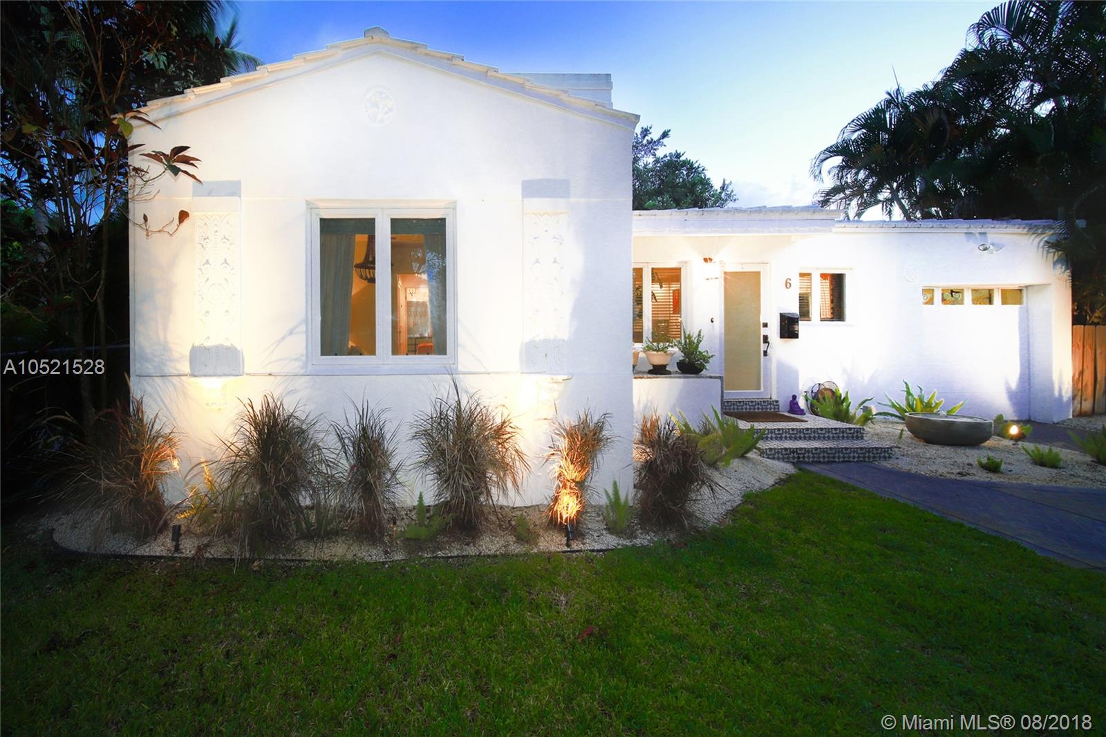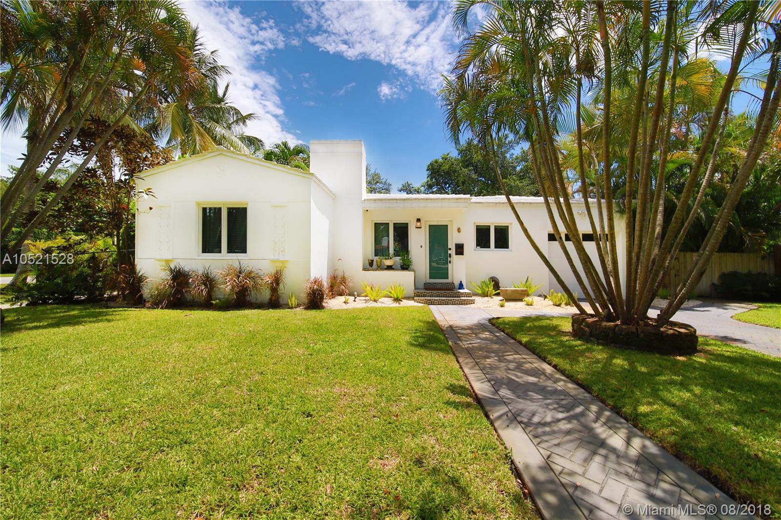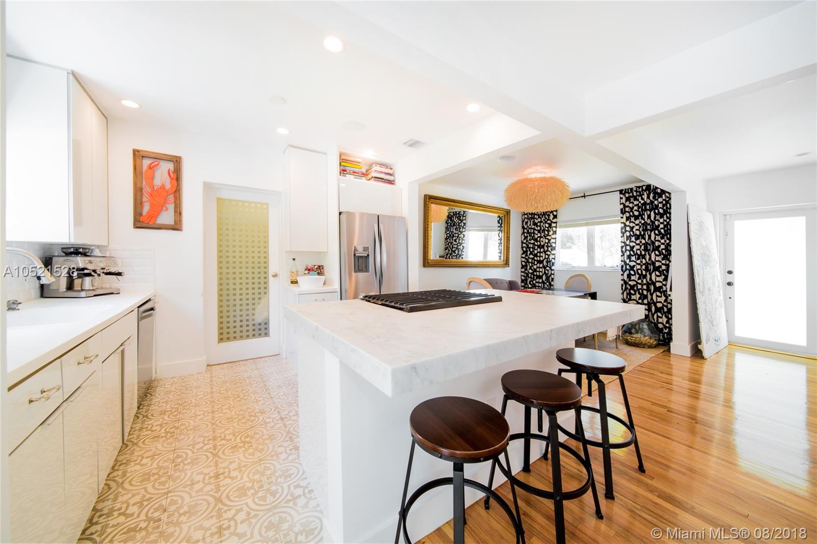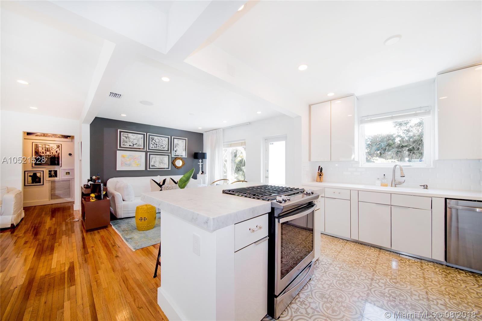 SHORES CASA PALMAS - Live large in this smartly-updated compact 1940s dream home with Deco design details and countless upgrades. Wide-open living area is spacious and perfect for get-togethers. Modern eat-in open gourmet kitchen boasts sleek white cabinetry, SS appliances, and a Carrara marble top island with gas range. Beautifully-maintained original finishes and upgrades include rich hardwood floors, gorgeous retro-chic tiles, new AC, upgraded plumbing and electric, recessed lighting, indoor-outdoor sound system, security cameras throughout, smart Nest thermostat, and impact windows and doors overlooking the private lush tropical backyard with room for a pool. Plus a convertible one-car garage and full storage room. All on a large corner lot in the heart of Miami Shores!