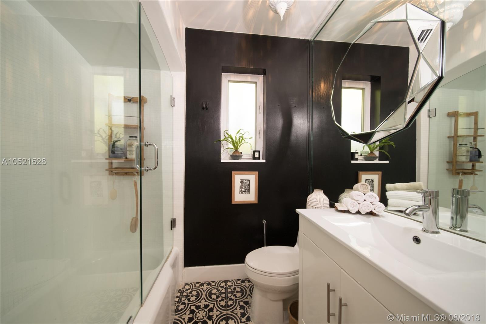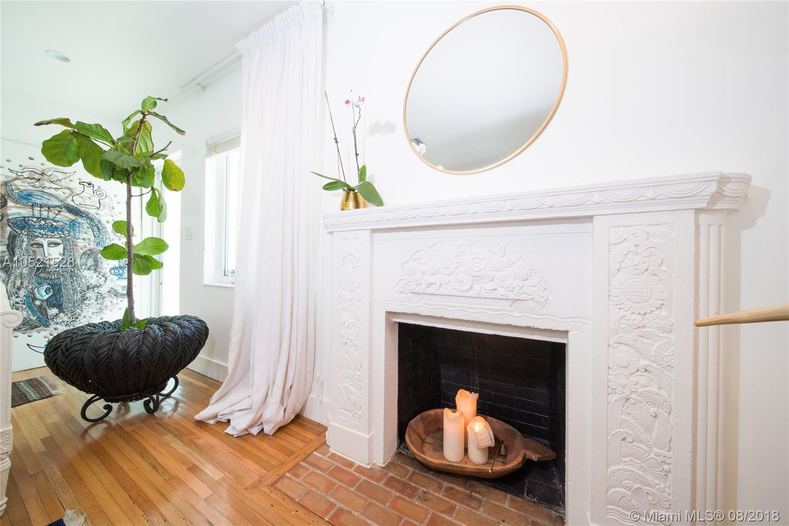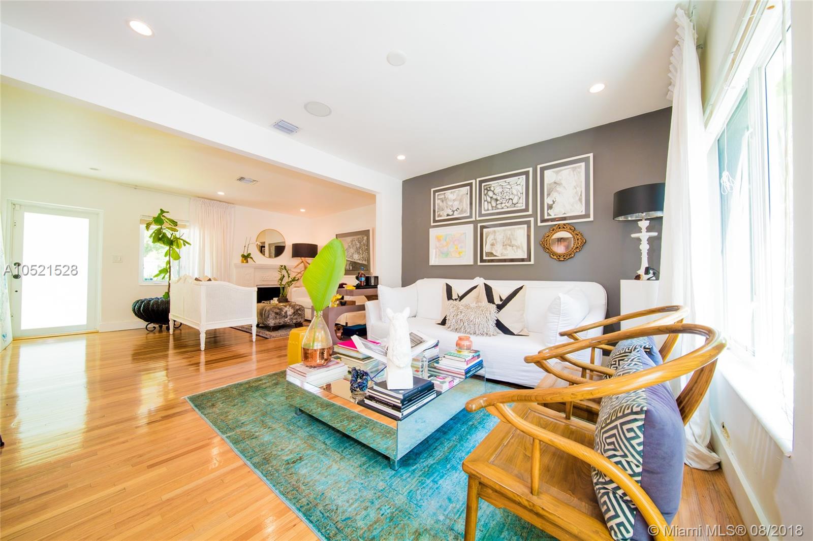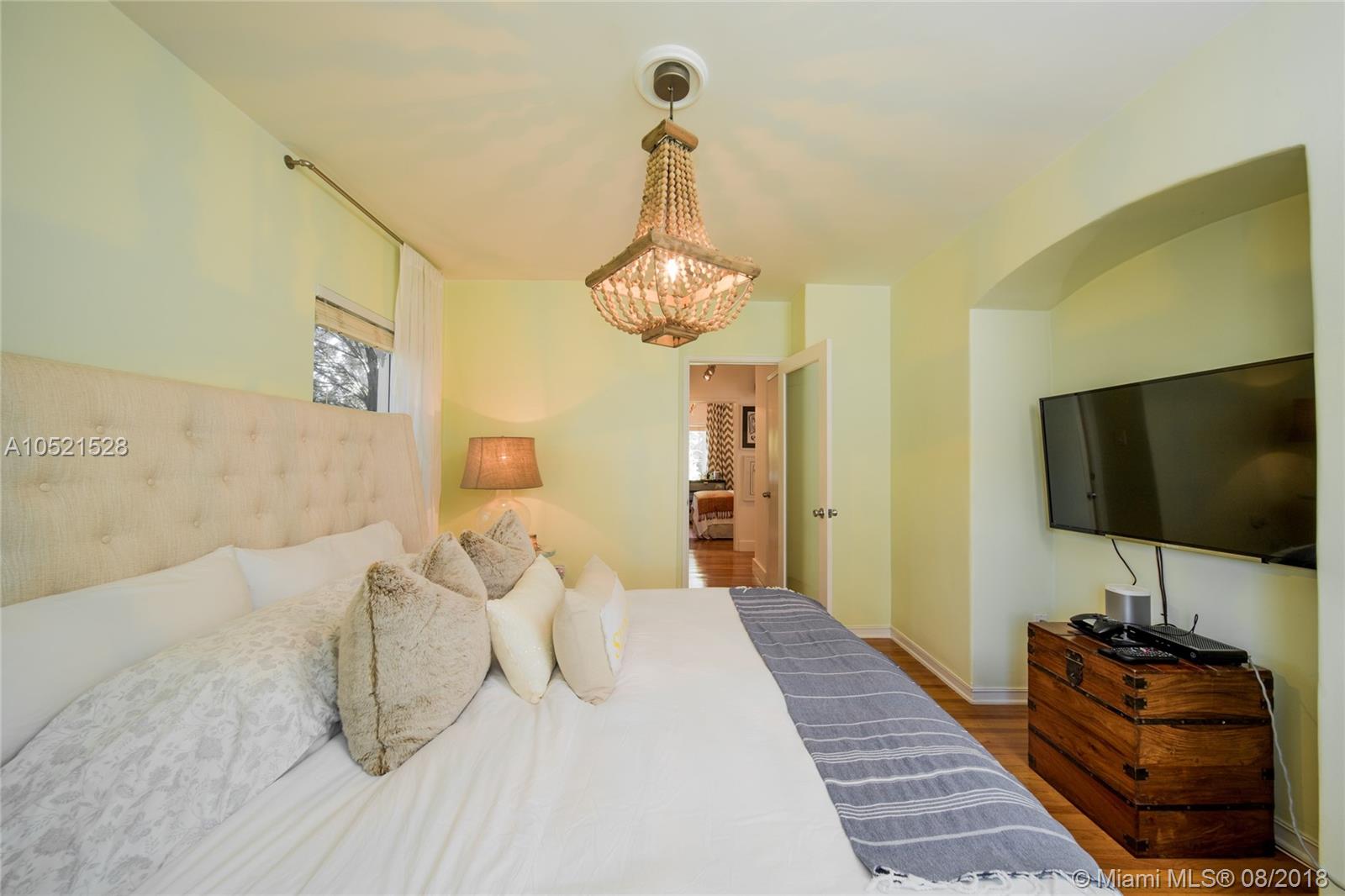 SHORES CASA PALMAS - Live large in this smartly-updated compact 1940s dream home with Deco design details and countless upgrades. Wide-open living area is spacious and perfect for get-togethers. Modern eat-in open gourmet kitchen boasts sleek white cabinetry, SS appliances, and a Carrara marble top island with gas range. Beautifully-maintained original finishes and upgrades include rich hardwood floors, gorgeous retro-chic tiles, new AC, upgraded plumbing and electric, recessed lighting, indoor-outdoor sound system, security cameras throughout, smart Nest thermostat, and impact windows and doors overlooking the private lush tropical backyard with room for a pool. Plus a convertible one-car garage and full storage room. All on a large corner lot in the heart of Miami Shores!