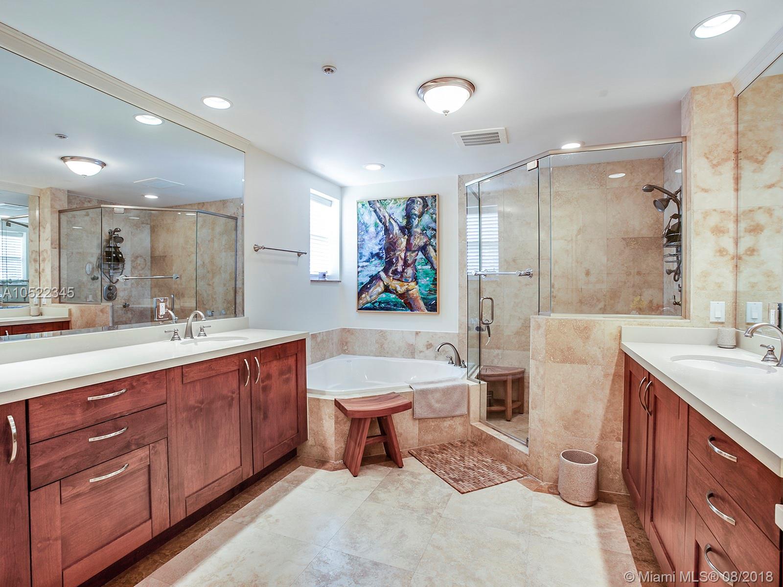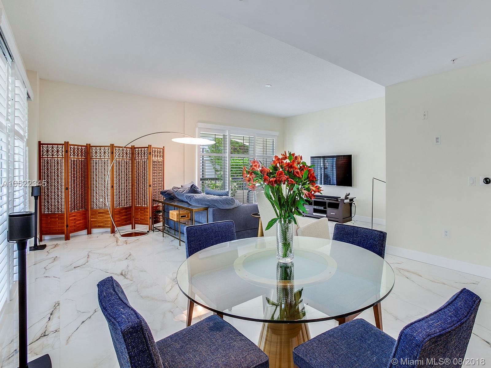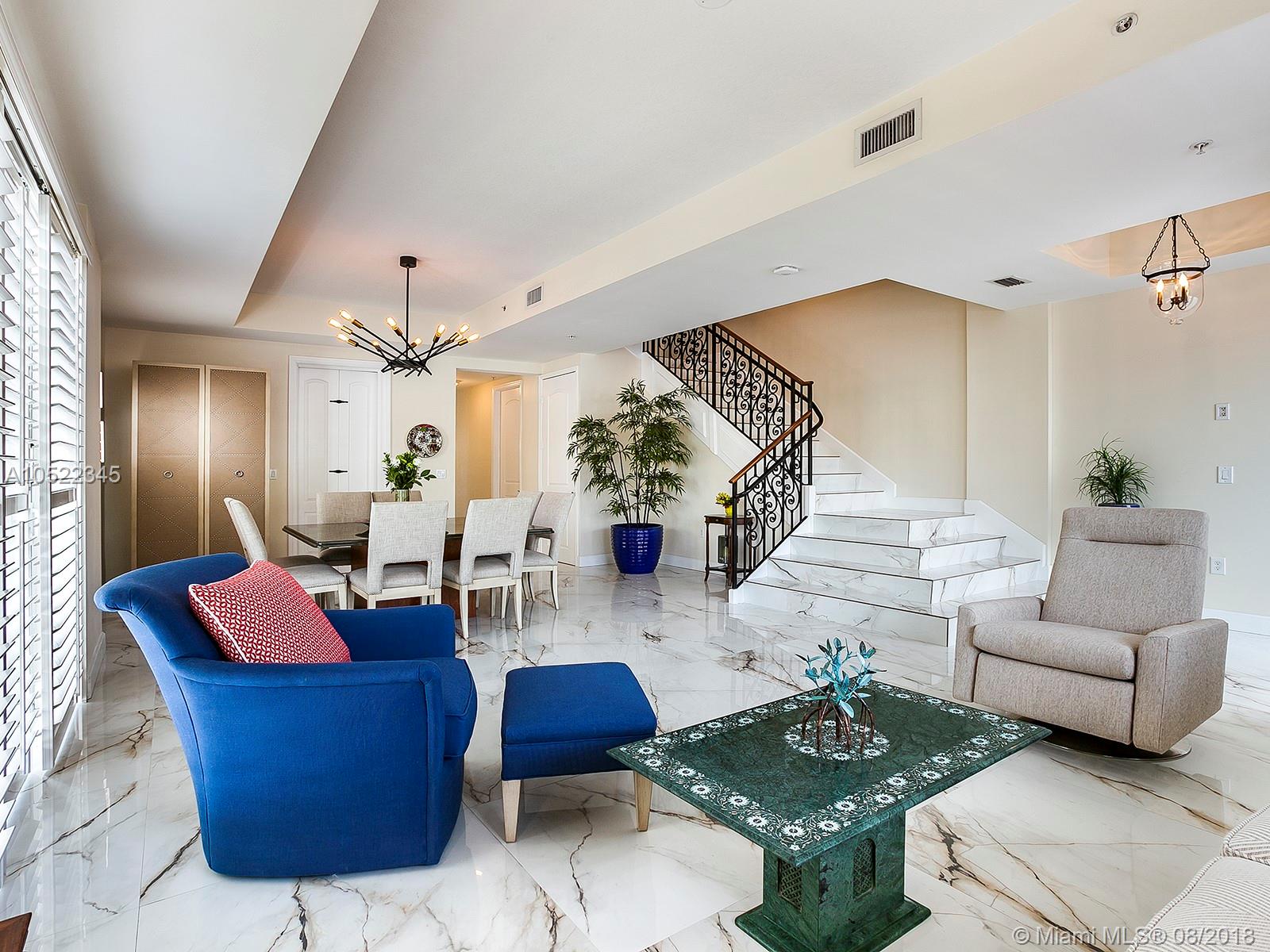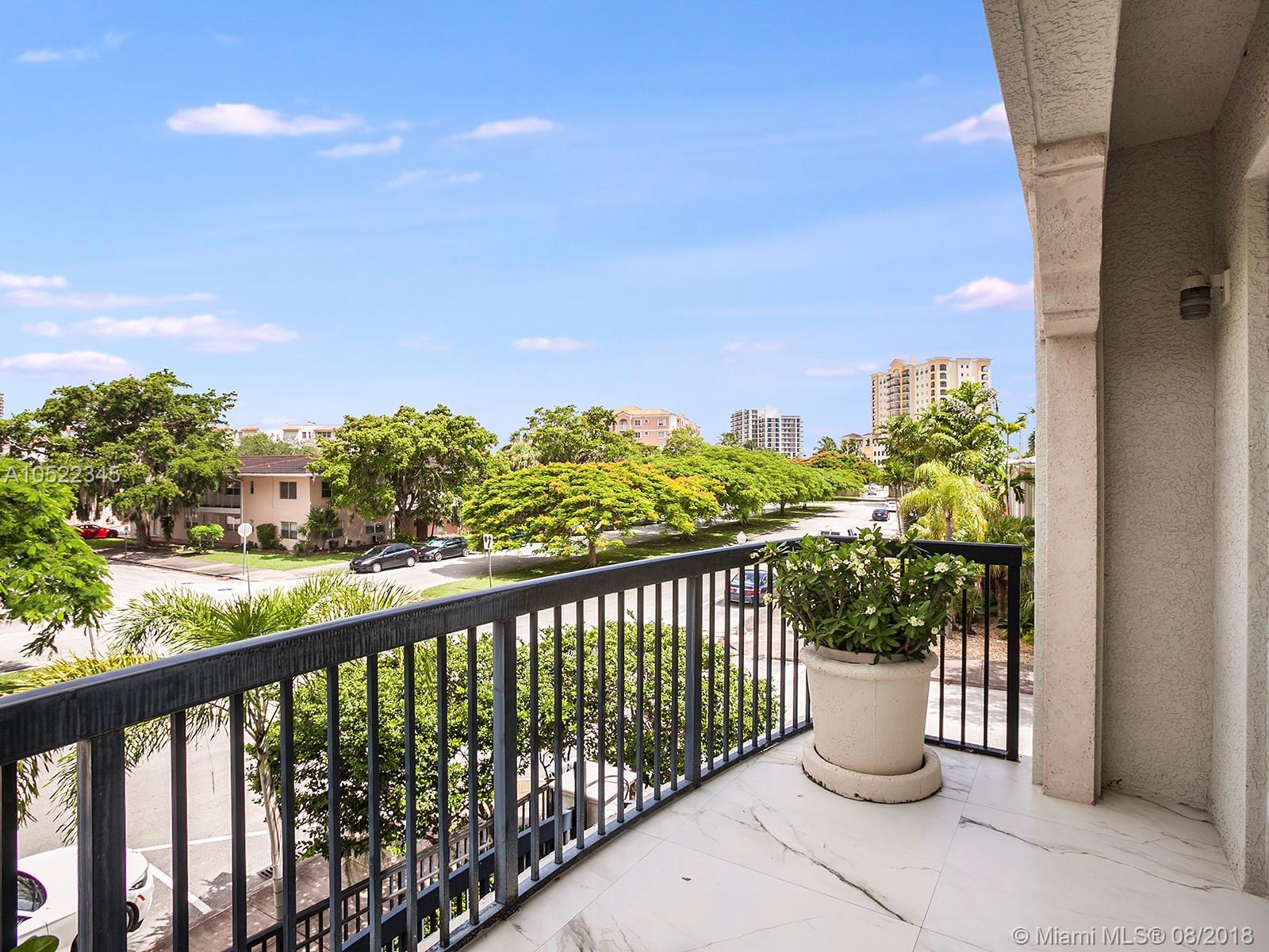 Coral Gables Villa Alhambra, A beautiful 2 story corner unique private townhouse in small centrally located quiet Building. 2800+ sq ft flowing & spacious floor plan. Balconies from every room allowing light & view of colorful tree lined street. A grand staircase & newly installed white ceramic porcelain tile floors and new baseboards incl 6 exterior balconies, rich wood floors in bedrooms. 12 foot ceilings. New interior white plantation shutters. A chef’s kitchen with granite counters & stainless steel appliances. Breakfast area and dining room. New Nest video doorbell,2 Nest protects, 2 Nest thermostat, all work with any smart phone. Majestic master bath with new luxury non-porous quartz counters. 3 bedrooms 3 ½ baths. All impact windows/doors. 2 underground parking spaces