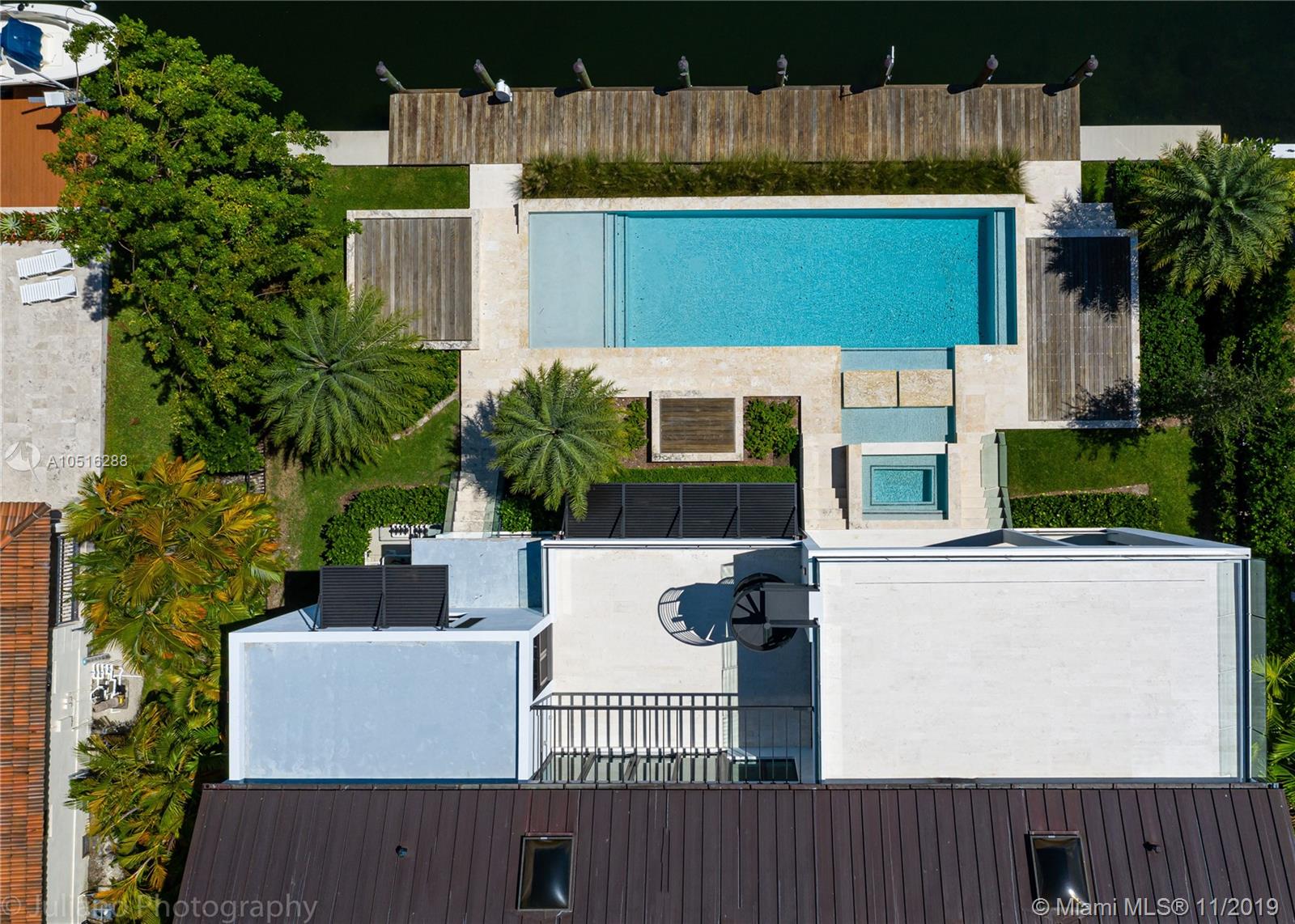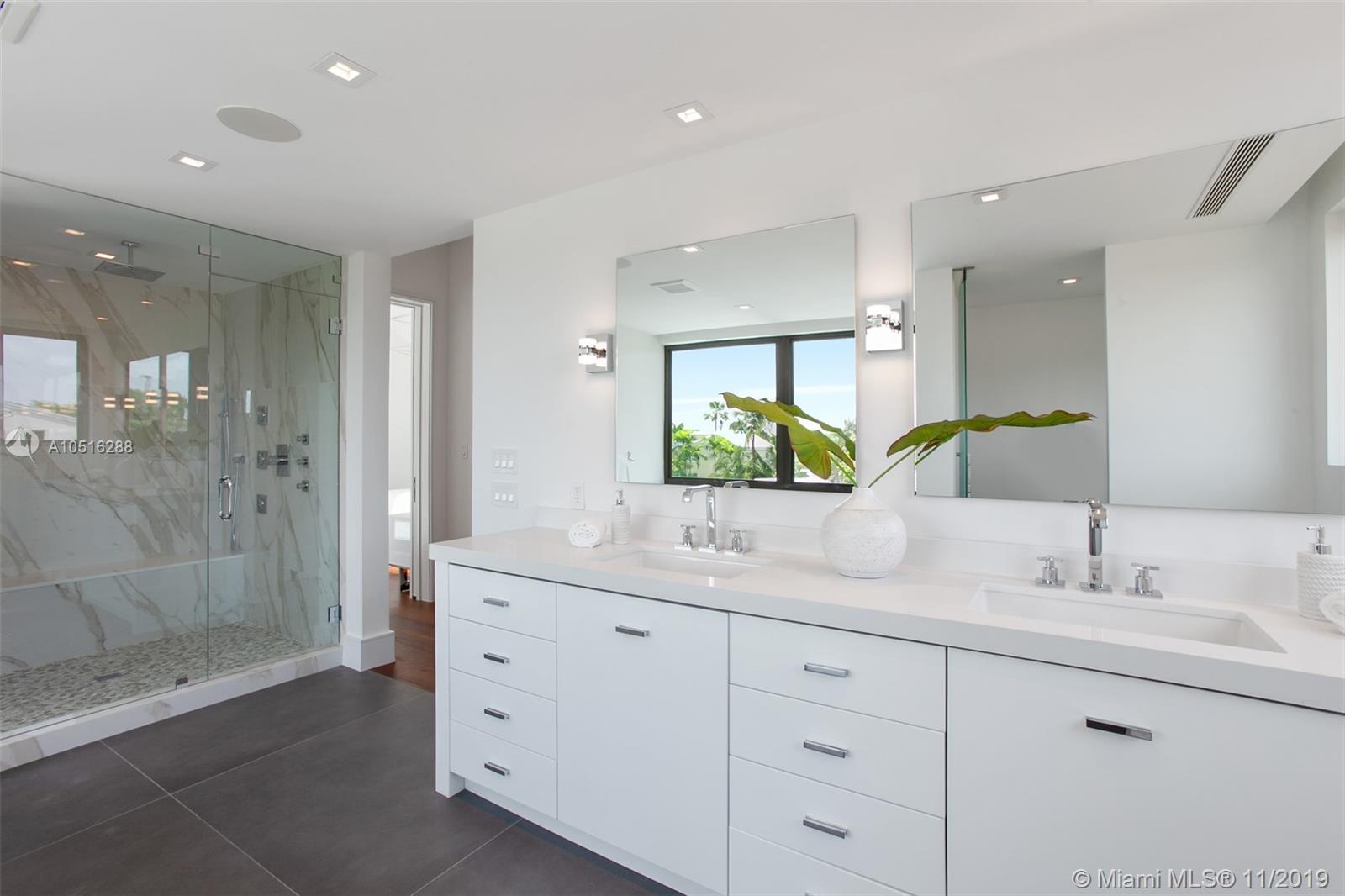 Modern Miami waterfront luxury scaled for gracious living. Thoughtfully conceived, elevated new-construction sited in an intimate, highly sought gated Gables enclave. Ingenious design maximizes every sq ft of lot space. Refreshingly understated interiors; elegant, airy floor plan masterfully flows & functions. Living & dining rooms offer water views. Gleaming Wolfe/Subzero kitchen w/wine cellar & pantry. Sublime master w/sumptuous bath, office, H&H walk-ins, sundeck & outdoor shower. All bedrooms en suite! Wow-factor exterior; kitchen/living/dining & fabulous pool/spa w/island seating & sundecks. New batter-pile fortified seawall; 70-ft dock; no bridges to bay. Rooftop deck affords city views. Built for the ages w/poured concrete, copper, limestone & oak. It’s all that and more!
