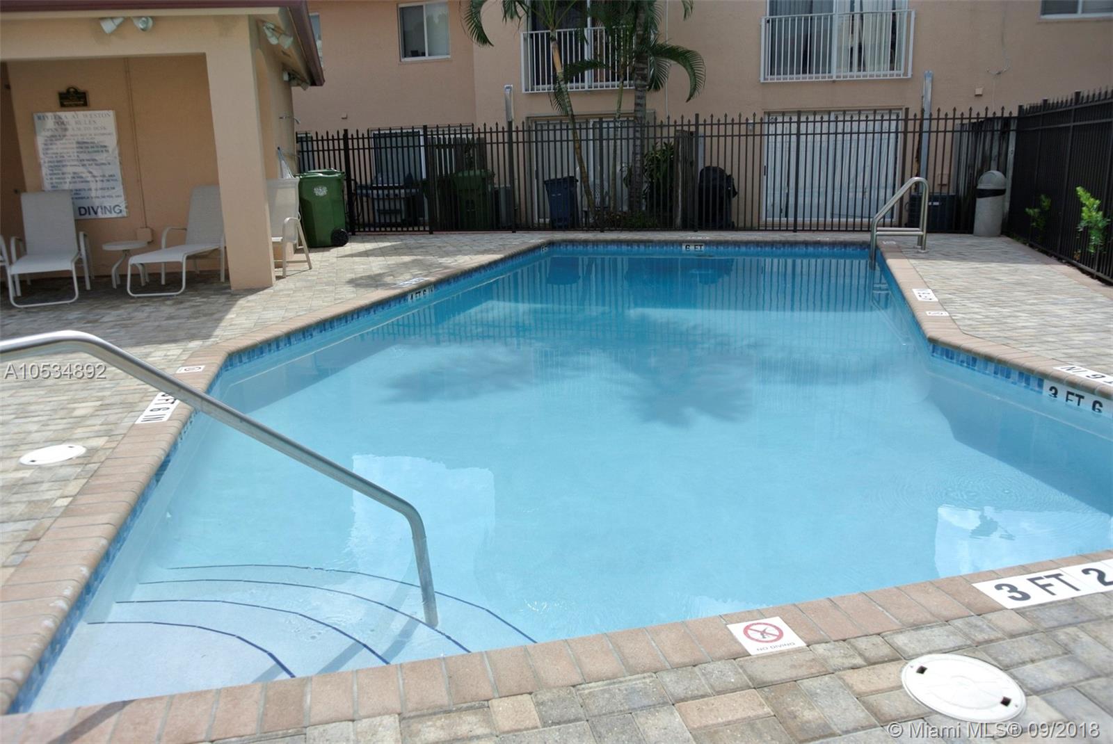 GORGEOUS 3 BEDROOM/2.5 BATH TOWNHOUSE AT "RIVIERA AT WESTON". REMODELED KITCHEN WITH GRANITE COUNTER TOP AND BEAUTIFUL WOOD CABINETRY, NEW AC UNIT! TILE ON 1ST FLOOR, MASTER AND A SECOND BEDROOM WITH CARPET AND WOOD FLOORS ON STAIRS & 3RD BEDROOM, NEW VANITIES IN BATHROOMS UPSTAIRS WITH GRANITE COUNTER TOPS, WASHER/DRYER INSIDE UNIT, OPEN PATIO, 2 PARKING SPACES RIGHT IN FRONT OF UNIT, COMMUNITY POOL. CLOSE TO SHOPPING/RESTAURANTS/MAIN ROADS/