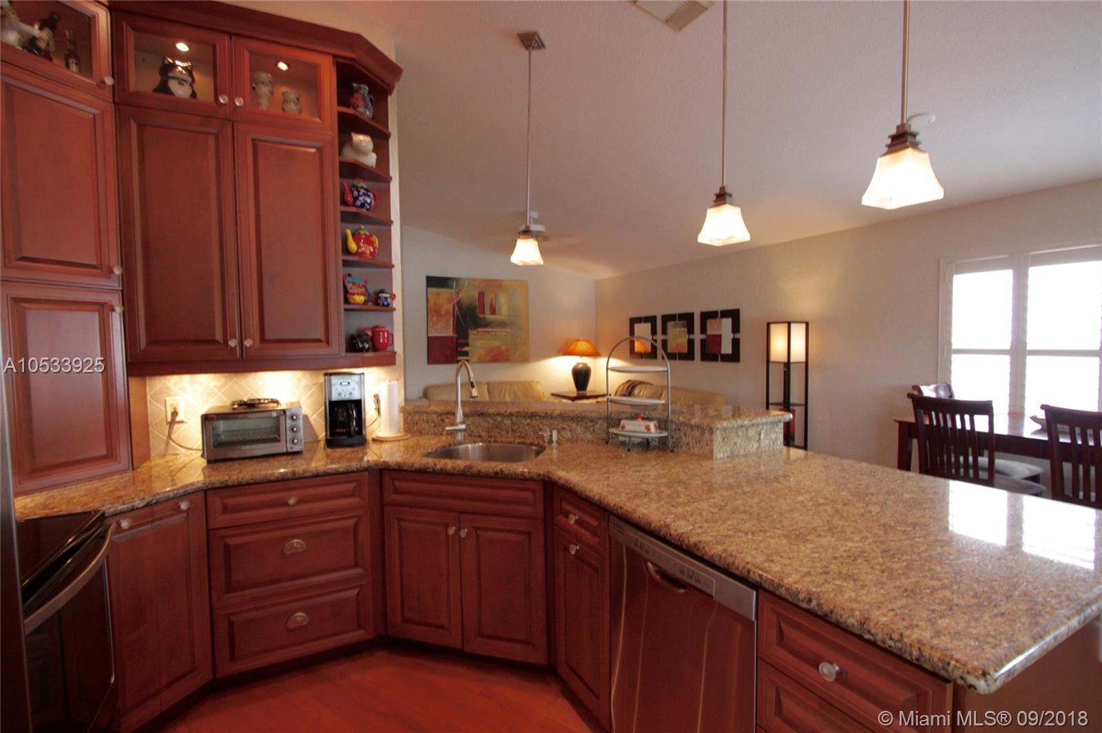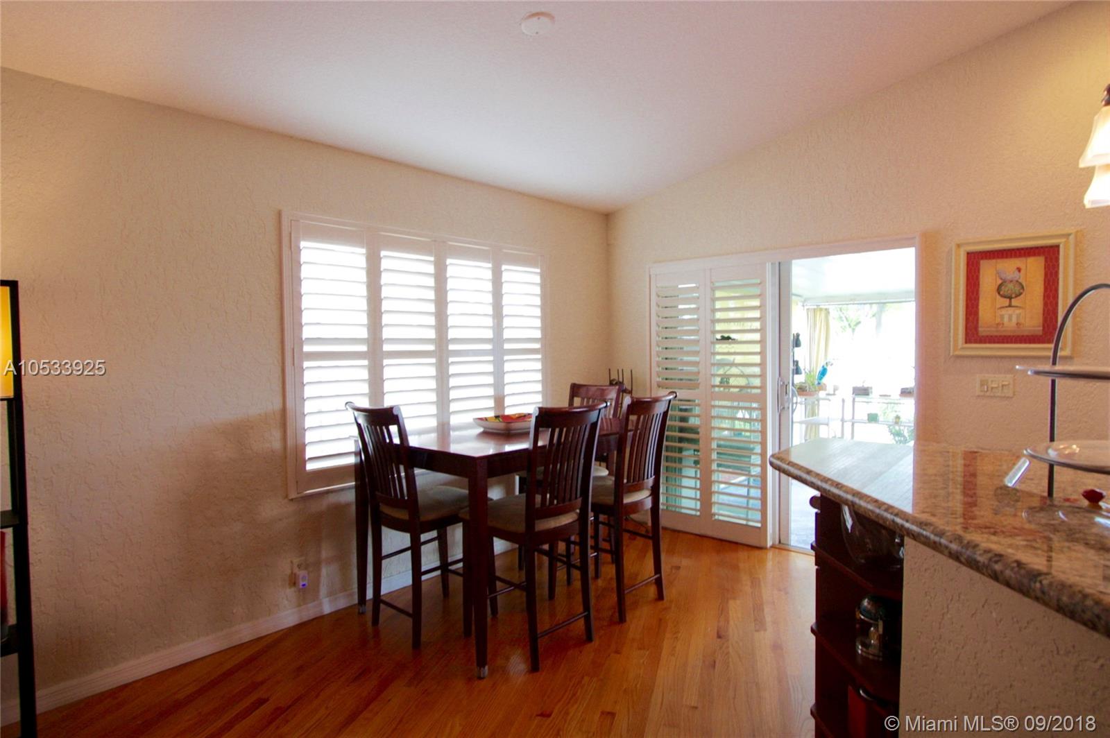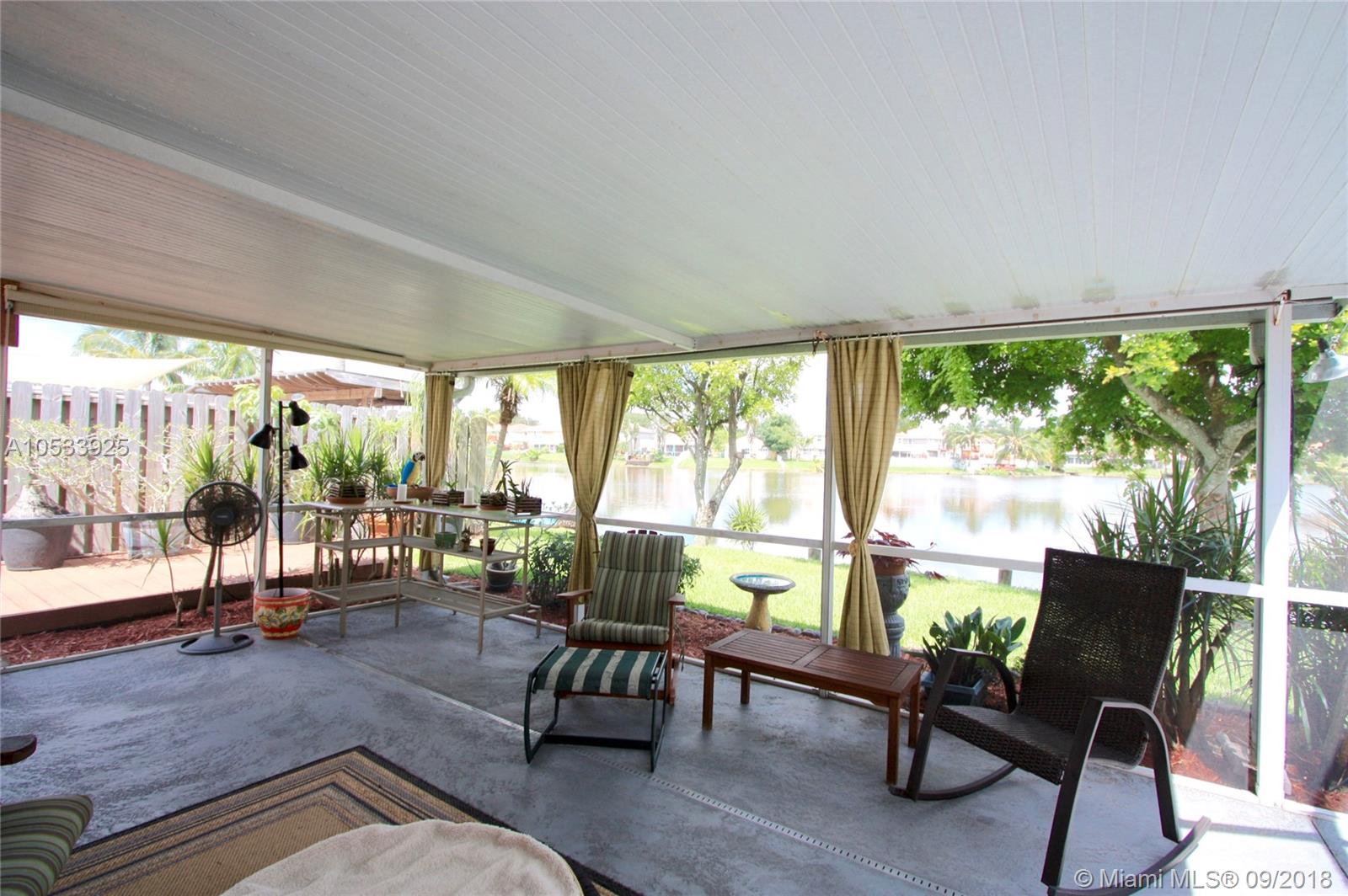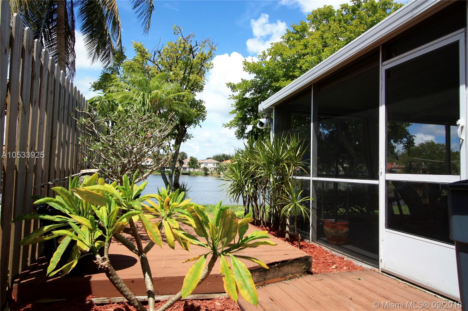 Waterfront villa in Davie - single story home with covered patio and great view of the lake! This three bedroom, two bath, one-car garage home feels very spacious with high ceilings in foyer, living/dining room, kitchen and master bedroom. Amazing custom kitchen has tall custom cabinets, granite counters, stainless steel appliances and breakfast bar. Beautiful wood floors. Great home for entertaining. Well maintained and beautifully upgraded. Ready to move in. Close to good schools and shopping. New roof in 2013. Full set of hurricane shutters . New hurricane resistant garage door.