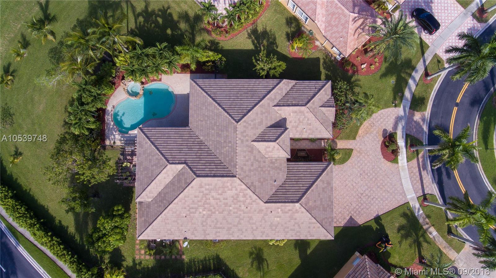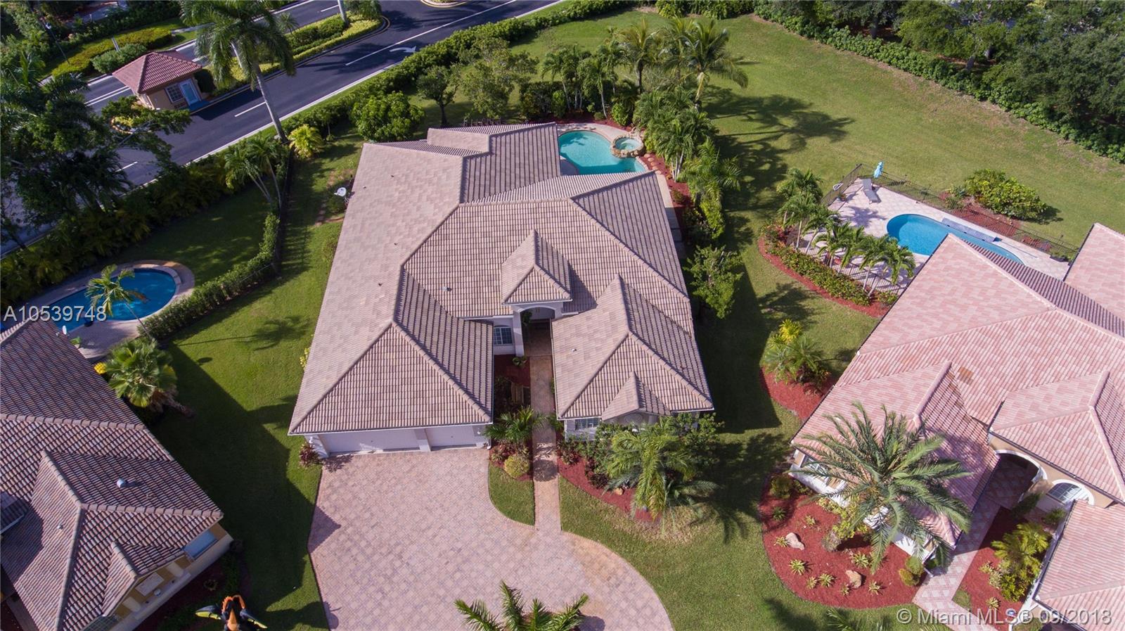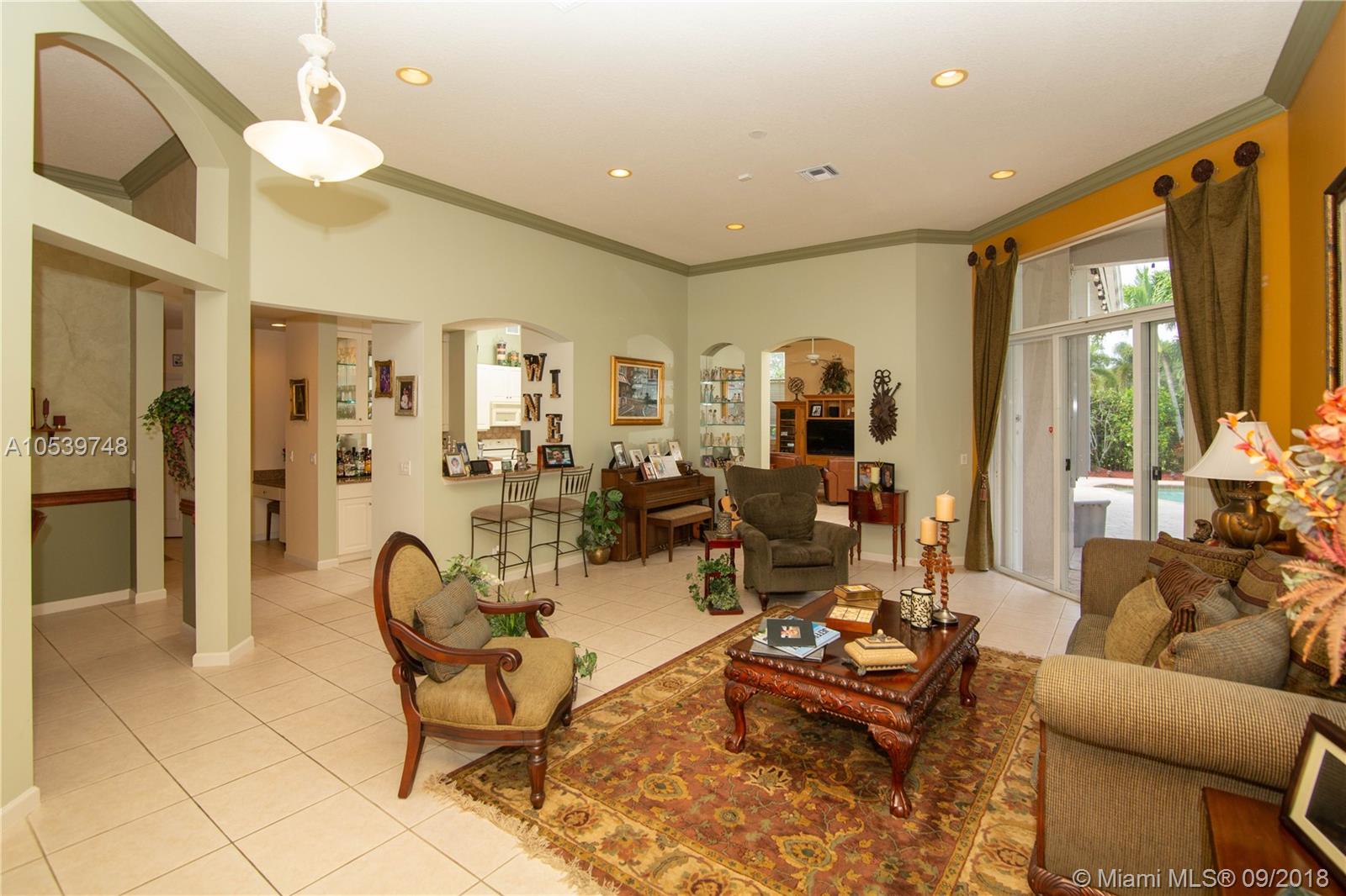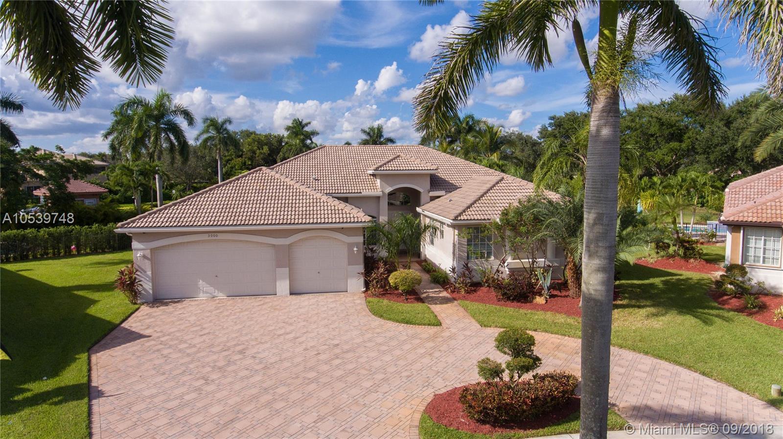 Beautiful One Story home located in the desirable gated community of Sunset Lakes/Miramar West, This elegant home features: 4 bedrooms, 3 baths, Den, with Bonus room offers an open floor plan, Kitchen with 42" cabinets, granite countertops, large Pantry, Butler Pantry with cabinets/ Wet Bar and Wine Cooler, formal living and dining room, crown moldings and high hat lights throughout, great Master Suite with a Sitting Area, walk in closet with large Master Bath, Family Room and Bonus Room with a nice view to the private and delightful landscaped, fenced heated pool/Jacuzzi, accordion shutters, Security Cameras and alarm. Circular Paved Driveway, only 40 homes at Las Brisas/Sunset Lakes. Featuring a Resort Style Clubhouse, Fitness center, 8 Tennis courts, Basketball, Pool, Kids Center.