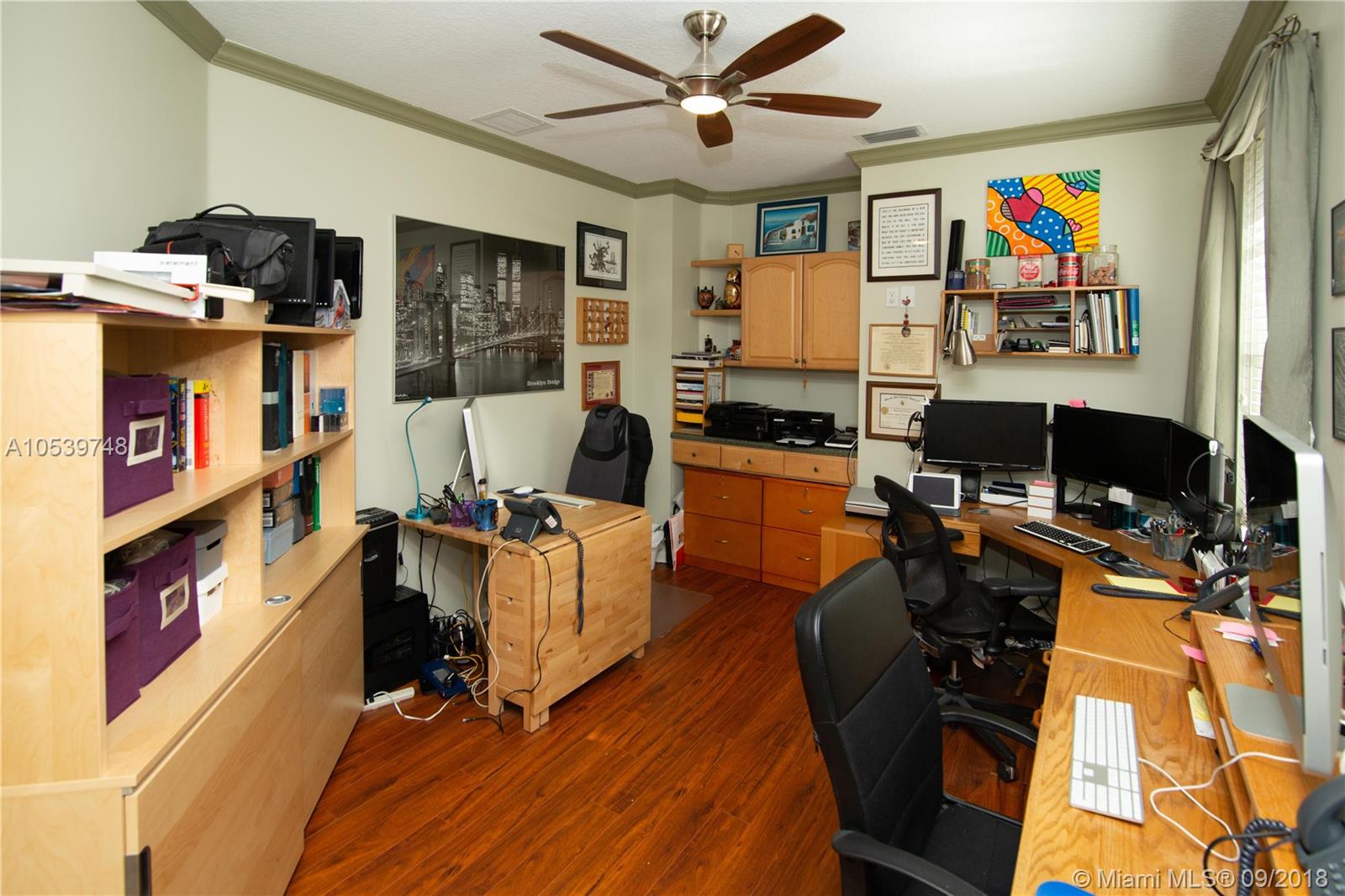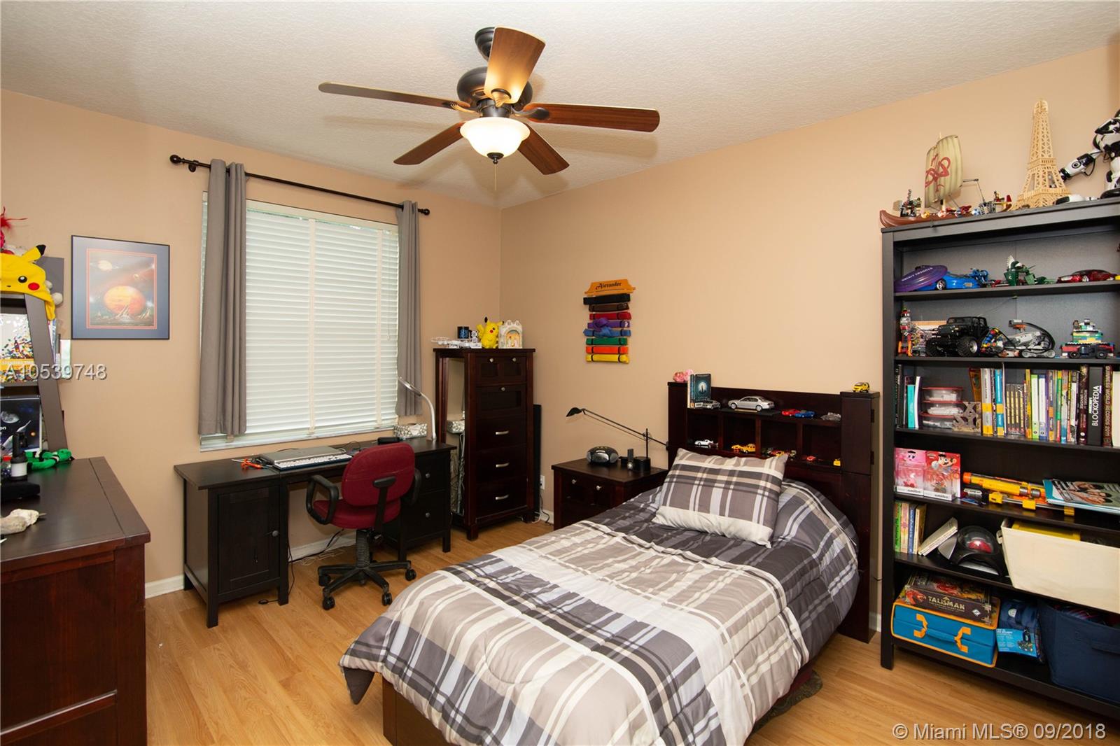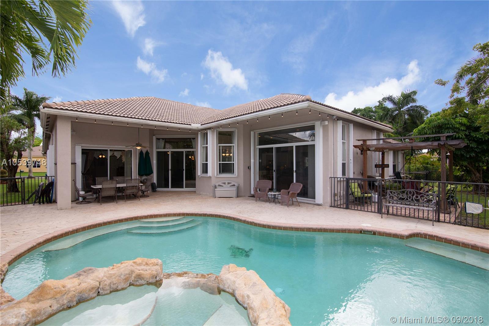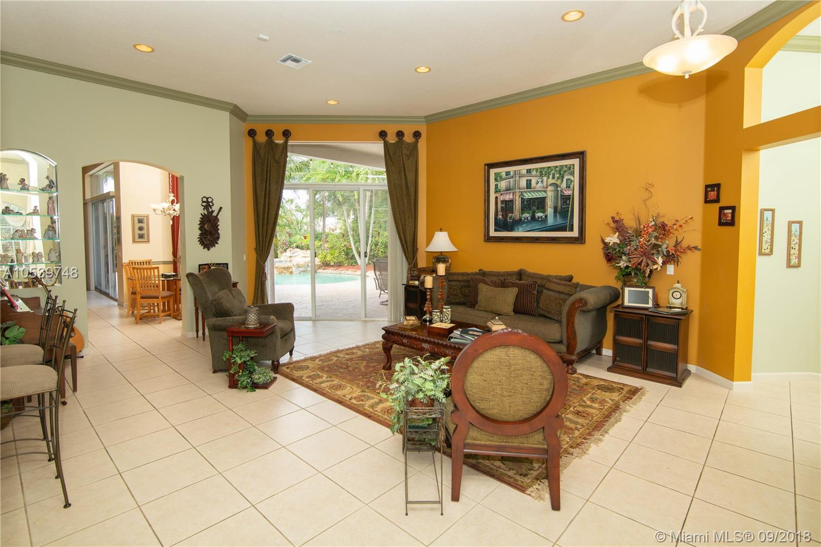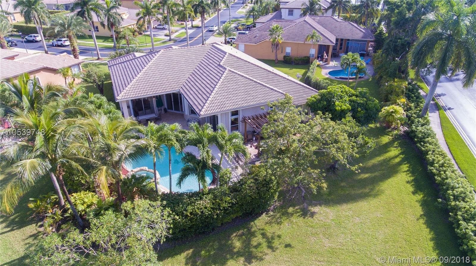Beautiful One Story home located in the desirable gated community of Sunset Lakes/Miramar West, This elegant home features: 4 bedrooms, 3 baths, Den, with Bonus room offers an open floor plan, Kitchen with 42" cabinets, granite countertops, large Pantry, Butler Pantry with cabinets/ Wet Bar and Wine Cooler, formal living and dining room, crown moldings and high hat lights throughout, great Master Suite with a Sitting Area, walk in closet with large Master Bath, Family Room and Bonus Room with a nice view to the private and delightful landscaped, fenced heated pool/Jacuzzi, accordion shutters, Security Cameras and alarm. Circular Paved Driveway, only 40 homes at Las Brisas/Sunset Lakes. Featuring a Resort Style Clubhouse, Fitness center, 8 Tennis courts, Basketball, Pool, Kids Center.