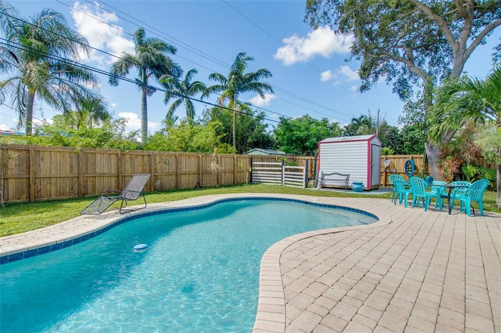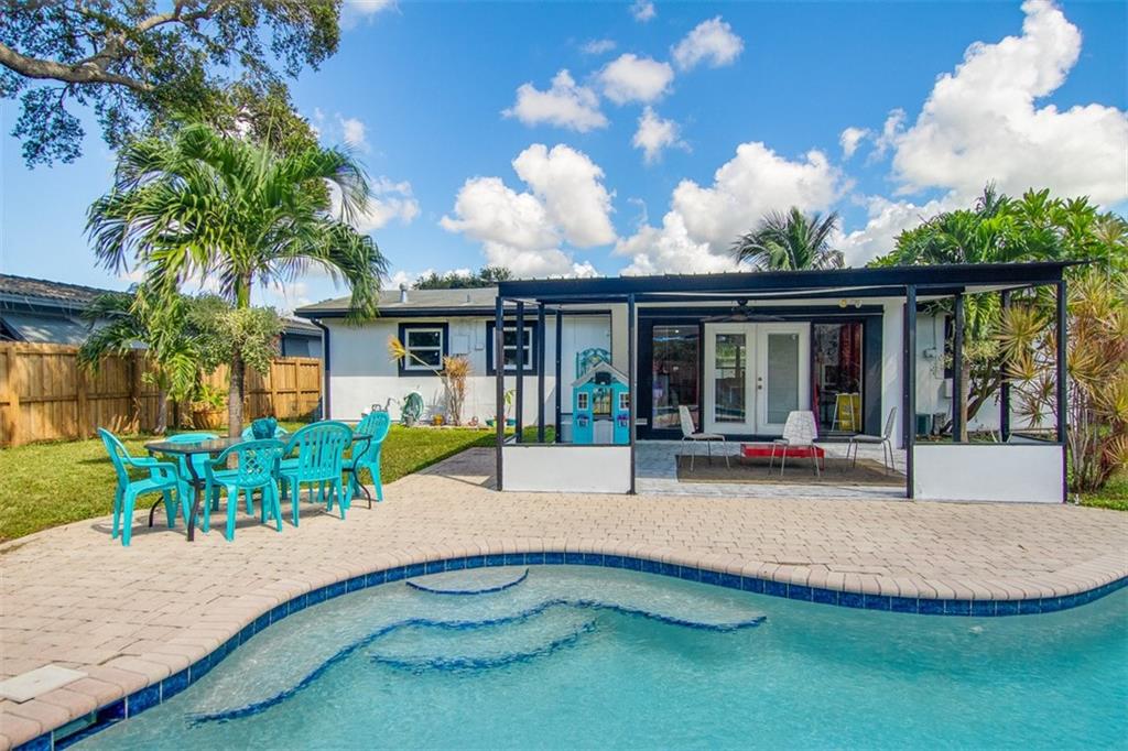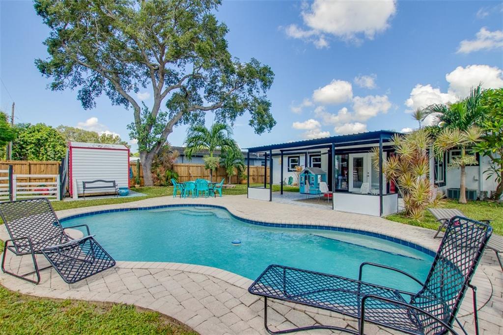 Fantastic 3/2 house with tropical backyard! Plop in your pool on a hot day, sit under your covered patio and relax... Tons of parking on your circular driveway, large kitchen with separate laundry room, roof only 5 yrs new, impact windows, split Floorplan, carport, newer wood cabinets in the kitchen. Sewer connection in 2004, pool installed in 2008, shed stays with sale, there is gas for stove/water heater but not hooked up. AC compressor 8 yrs old, Did I mention that gorgeous pool and fenced yard? ***(decor faux fireplace, 2 palm trees, extra fridge and freezer do not convey. Palms will be replaced with a similar tree)