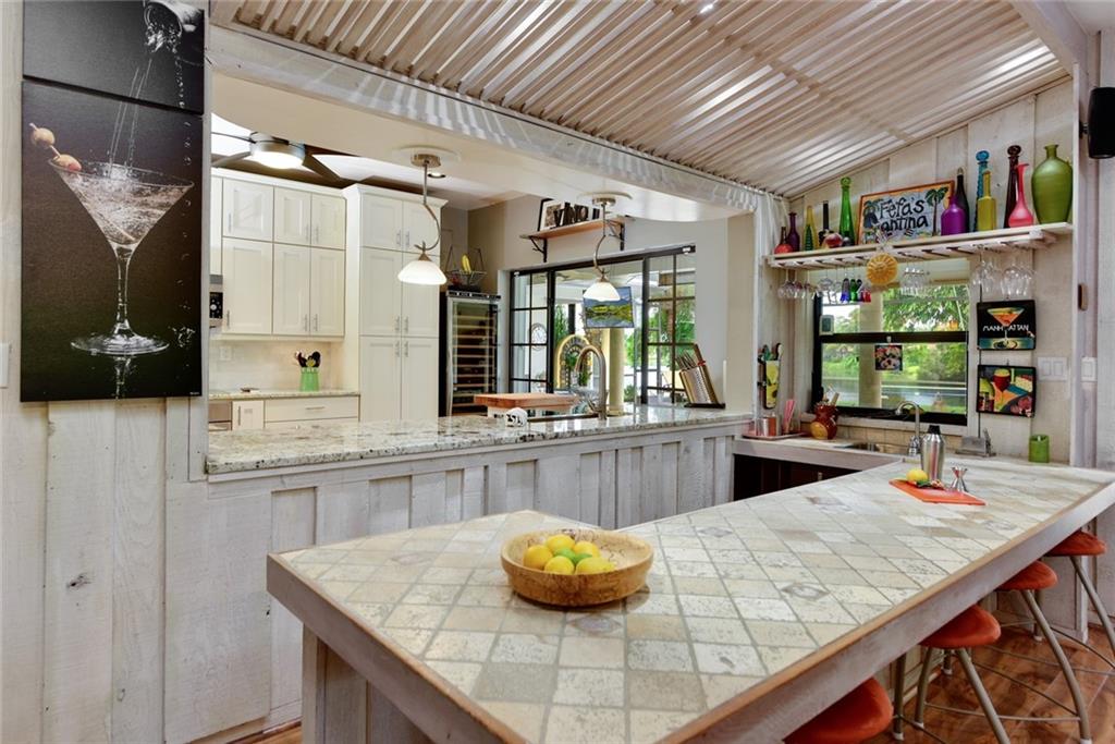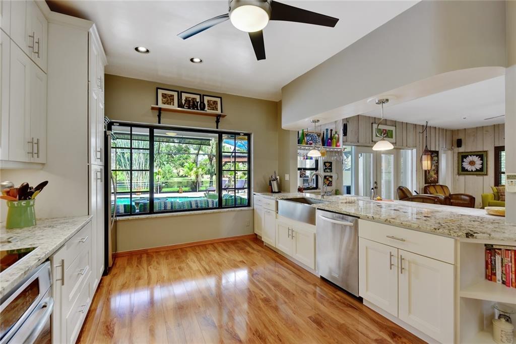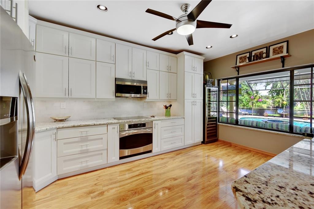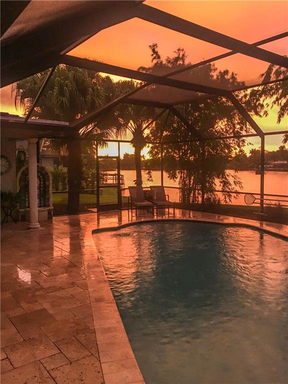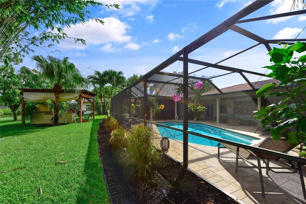 Weston stunner from top to bottom. The lush mature landscape beckons as you enter the double front door. Large entrance w/open dining, living & den space surround impressive atrium feature. Upgraded kitchen w/SS farmhouse sink, SS appliances, tall/deep cabinets & loads of counter top looking out on expansive new screen enclosed pool deck & entertainment space. Cozy family room & full cabana bath. All baths renovated. Master bath feels like a spa w/soaking tub plus multi-jet rain shower. Pool area is a must see! Tumbled marble deck w/french drains, NEW enclosure, surround sound, flat screen tvs, fruit trees, orchids PLUS imported Portuguese pizza oven under stand alone pergola on the banks of the stabilized water's edge. Sunsets are unique, private & unforgettable here. A must see!