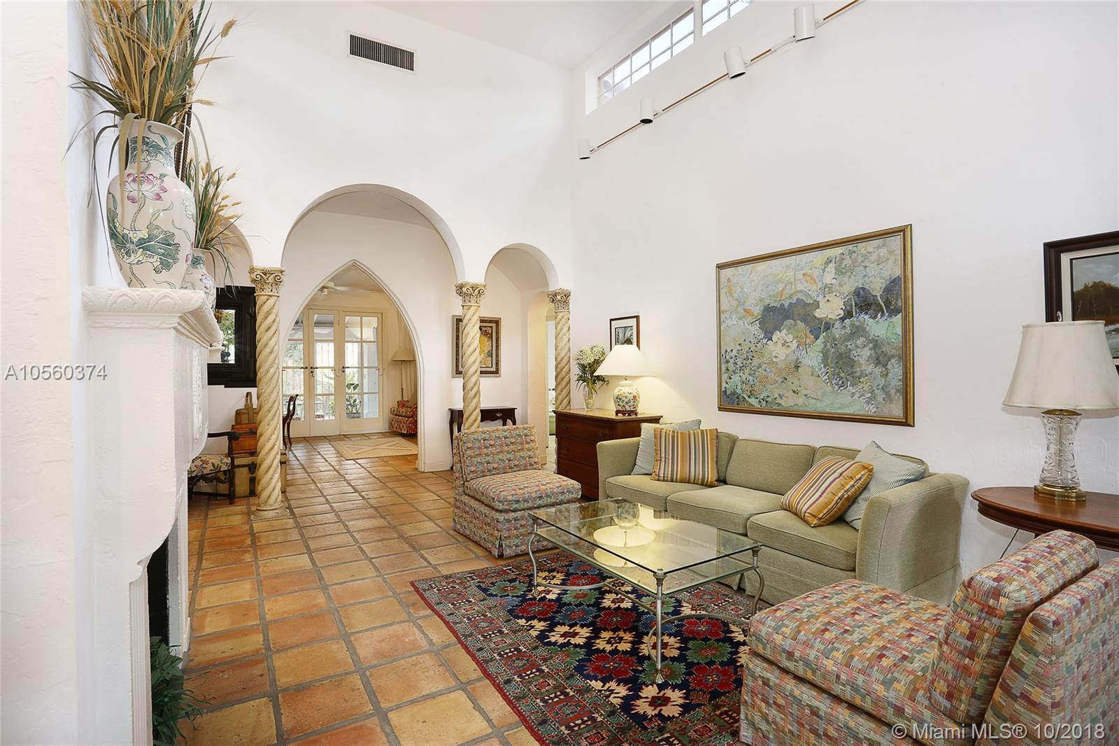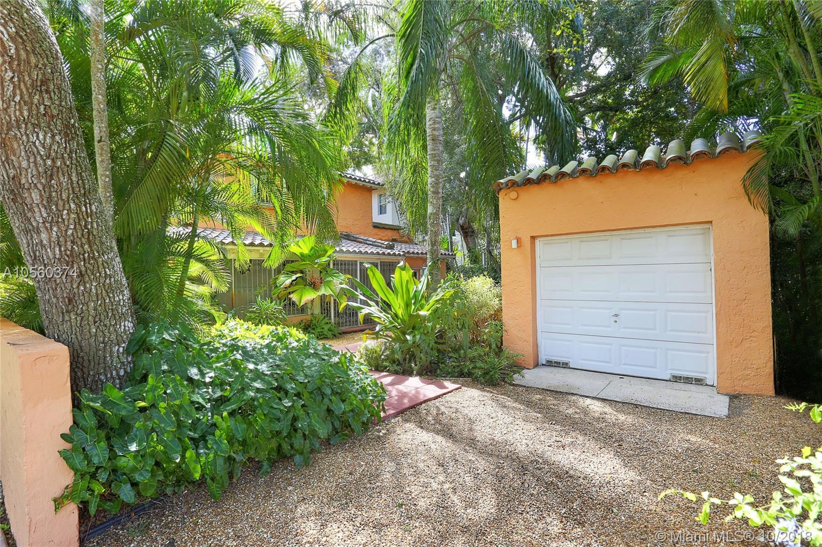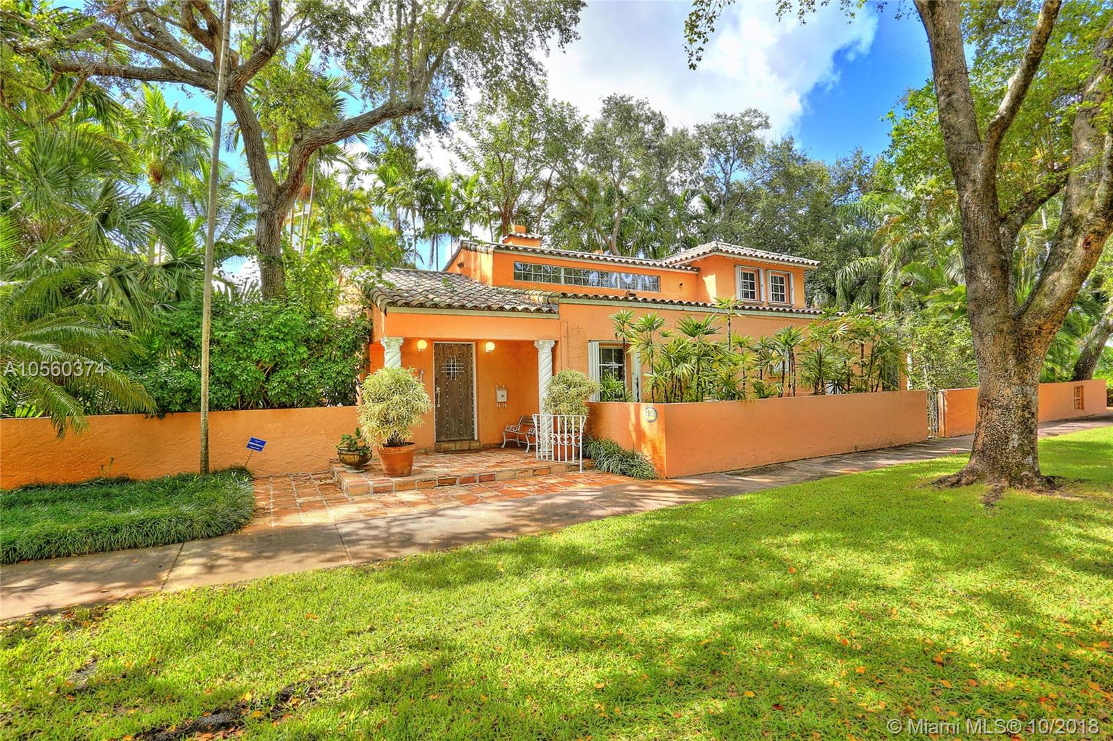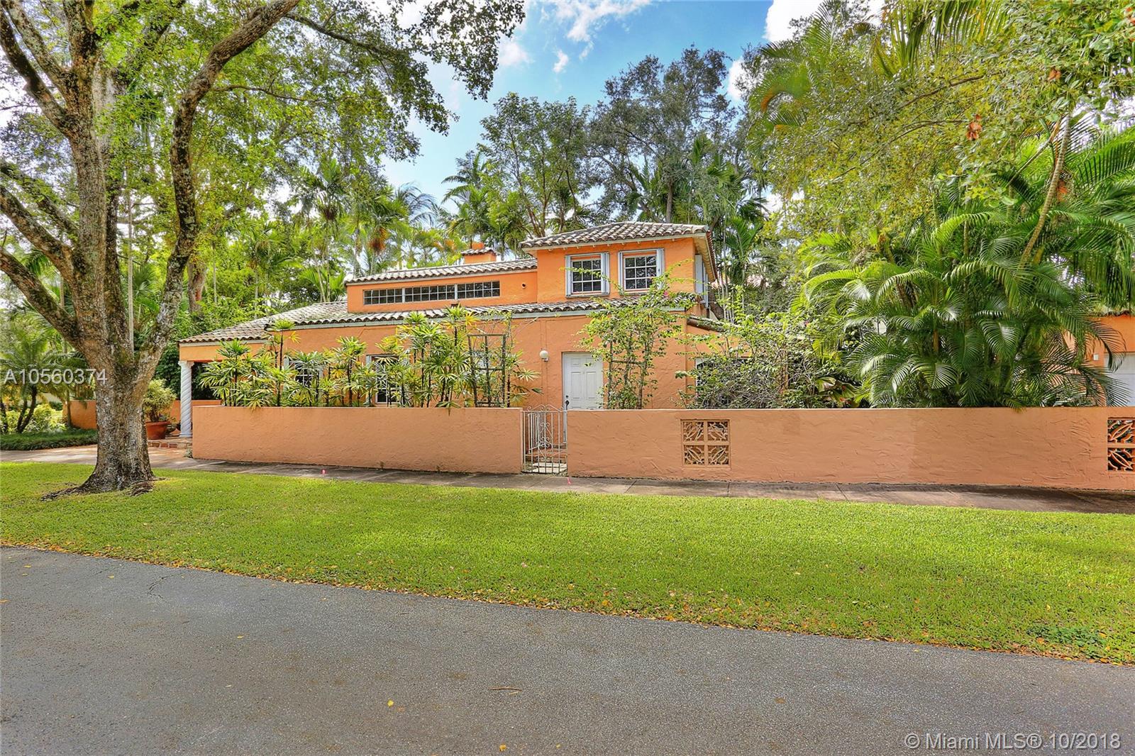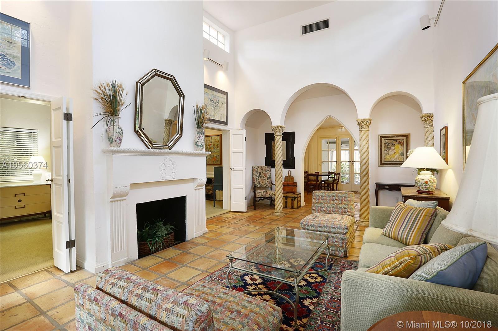 This 3br/3ba home is situated on one of the prettiest Gables streets & just steps from the Granada golf course! It is truly special with Moorish details & arches, 2 story ceiling in the living room, Pecky Cypress front door & ceiling details, working fireplace, open floor plan & split bedroom layout. The newly renovated kitchen opens to a dining area that accesses the screened patio, perfect for grilling or outside dining. The front of the house also enjoys a wonderful vantage from the beautiful patio with cut coral floors & lush landscaping. The home has been lovingly maintained & features a master suite downstairs with one more bedroom or den down, an office & private bedroom upstairs that can be accessed from a side door. Detached garage, laundry room, 2012 roof, & gorgeous details.
