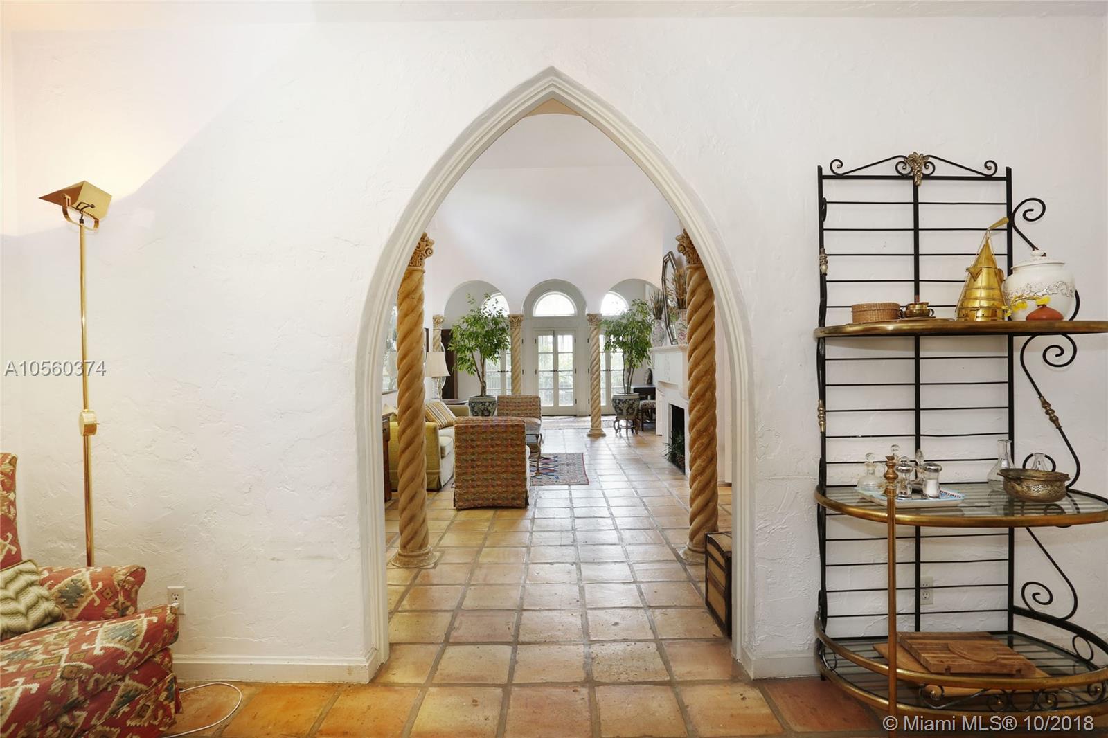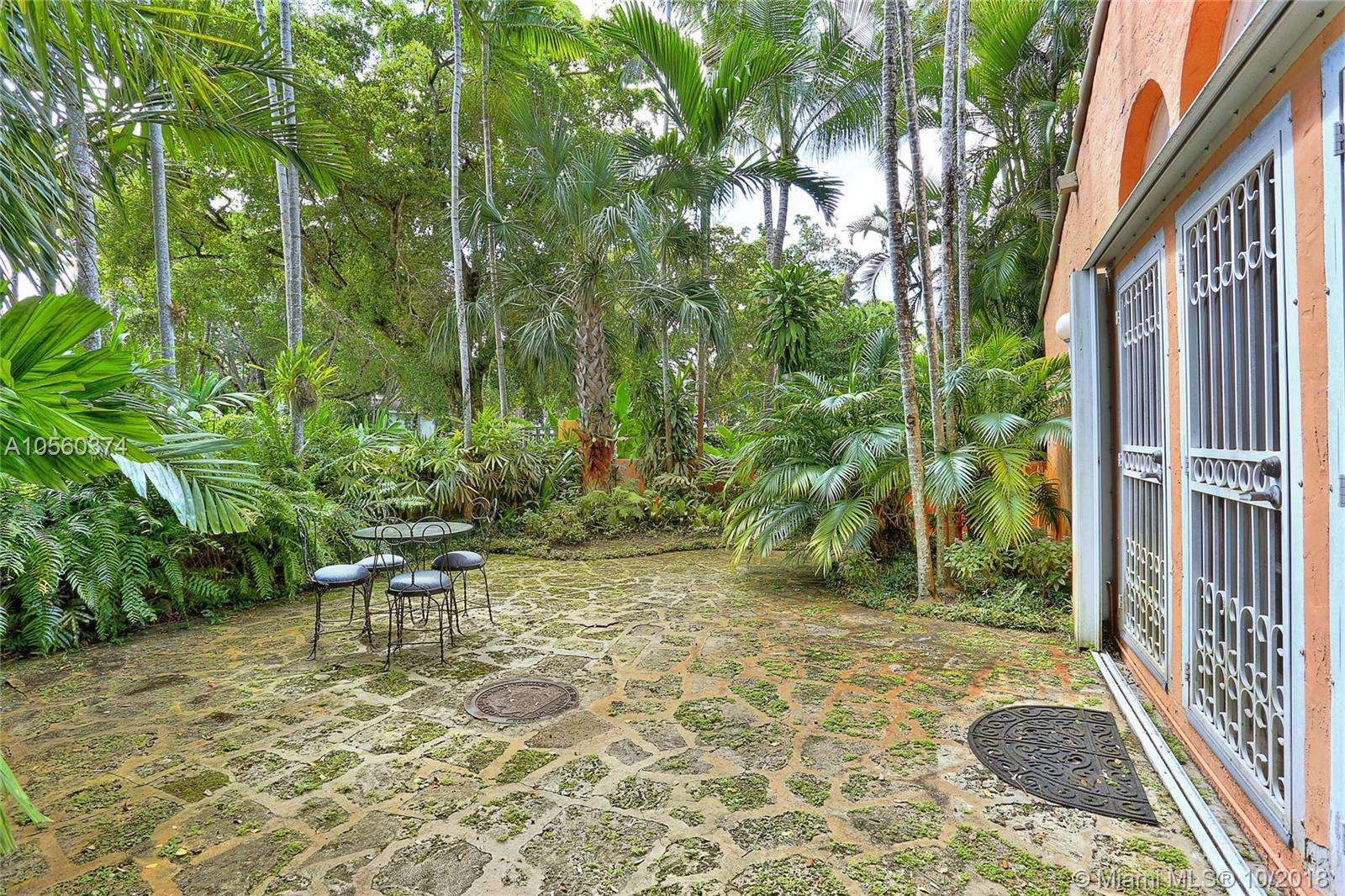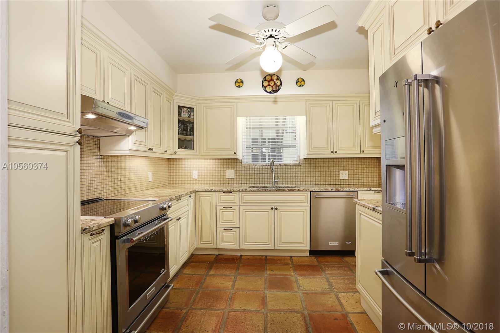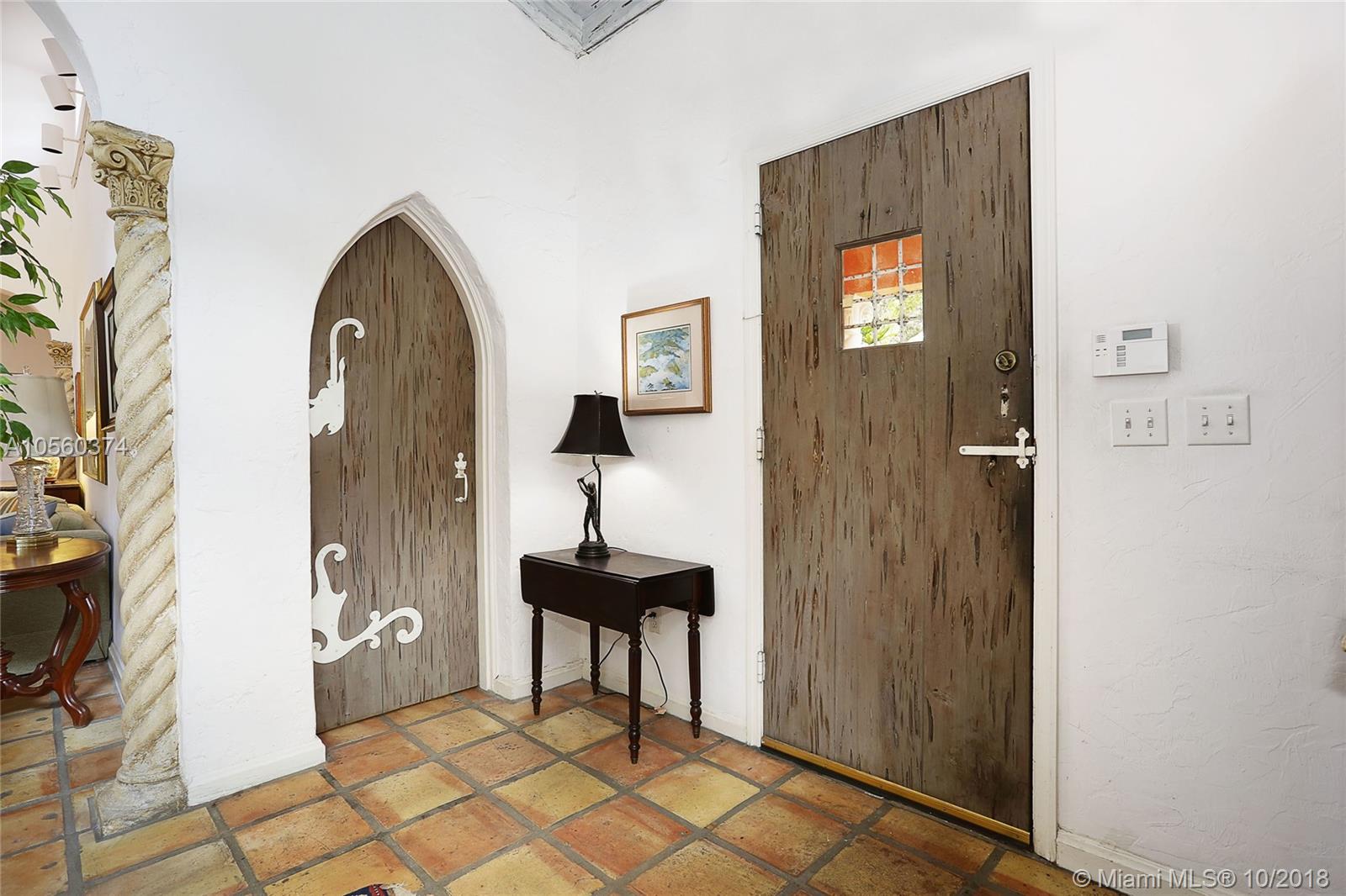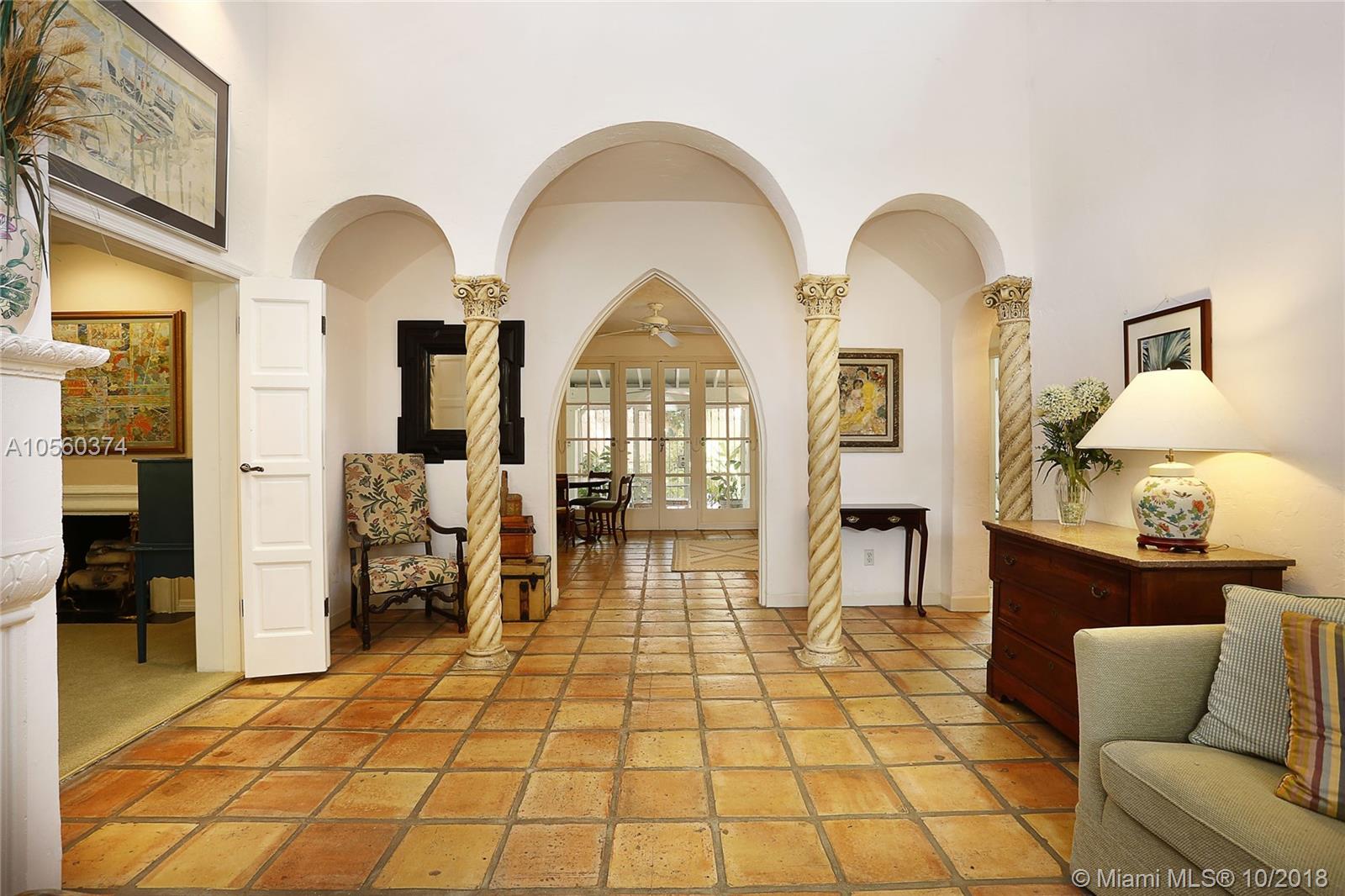 This 3br/3ba home is situated on one of the prettiest Gables streets & just steps from the Granada golf course! It is truly special with Moorish details & arches, 2 story ceiling in the living room, Pecky Cypress front door & ceiling details, working fireplace, open floor plan & split bedroom layout. The newly renovated kitchen opens to a dining area that accesses the screened patio, perfect for grilling or outside dining. The front of the house also enjoys a wonderful vantage from the beautiful patio with cut coral floors & lush landscaping. The home has been lovingly maintained & features a master suite downstairs with one more bedroom or den down, an office & private bedroom upstairs that can be accessed from a side door. Detached garage, laundry room, 2012 roof, & gorgeous details.