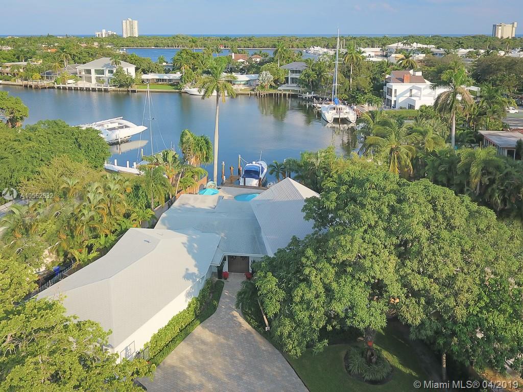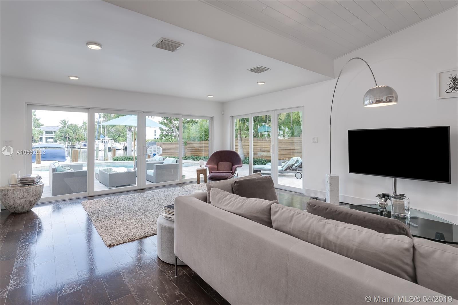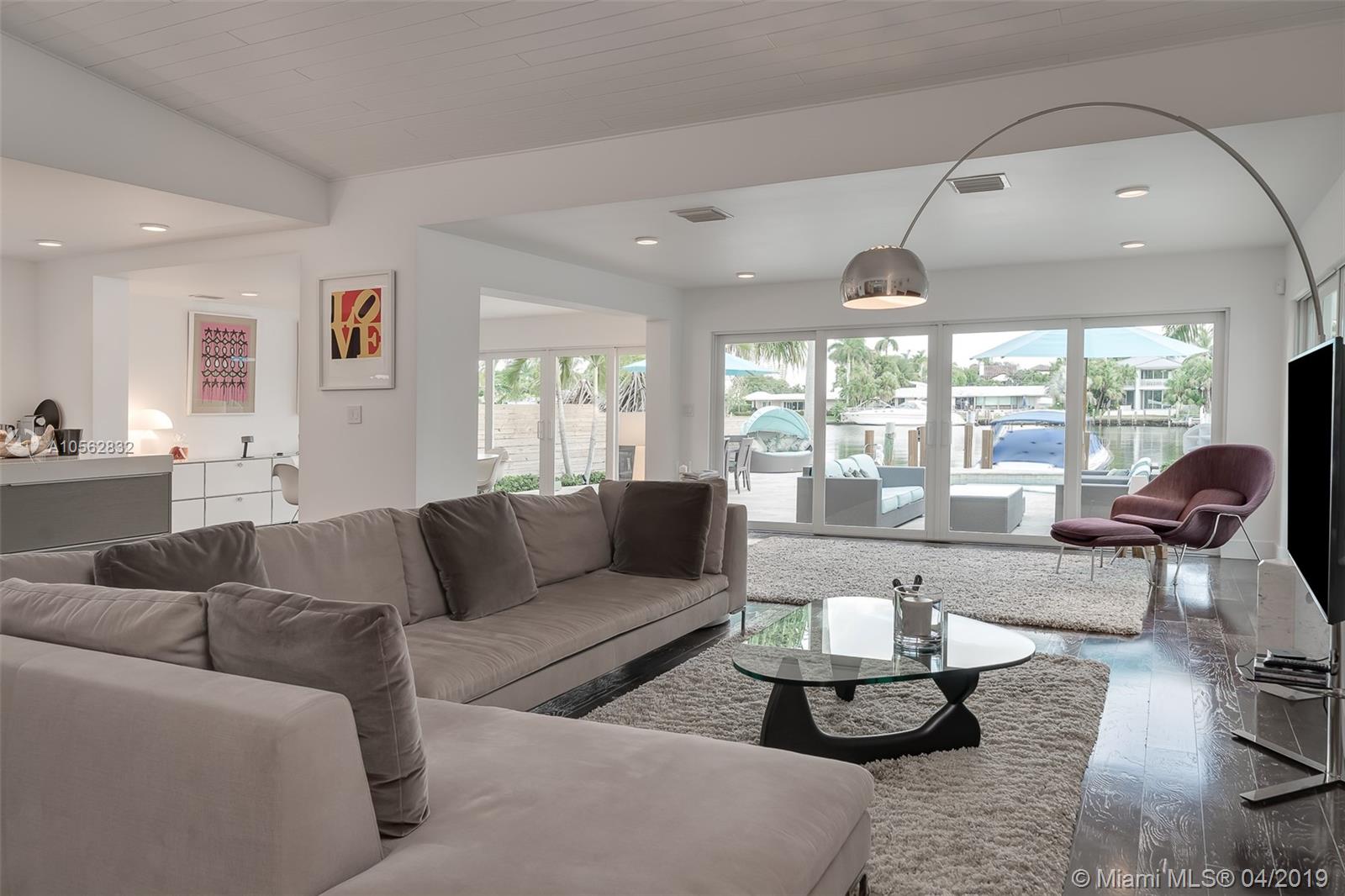 Amazing and unique "MIMO" waterfront home on prestigious Bayview Drive in Fort Lauderdale. Walk or bike to Coral Ridge Yacht Club, Galleria Mall, Dining/Shopping, or the Beach! As you enter through the artfully chosen stainless steel double front doors, the oversized windows and glass doors facing the east reveal a stunning back patio/pool area with an extra wide view of the canal 'lake' from the backyard. Private dock for up to 65' vessel; ocean access with no fixed bridges. Light and bright modern interior design: clean lines, warm natural wood floors, vaulted ceiling in living area, Duravit and Hans Grohe in all bathrooms, Bosche/Siemens kitchen appliances, original "Midcentury" wood spiral stairs to master bedroom. Hurricane impact windows, fenced yard, and seawall recently renovated.