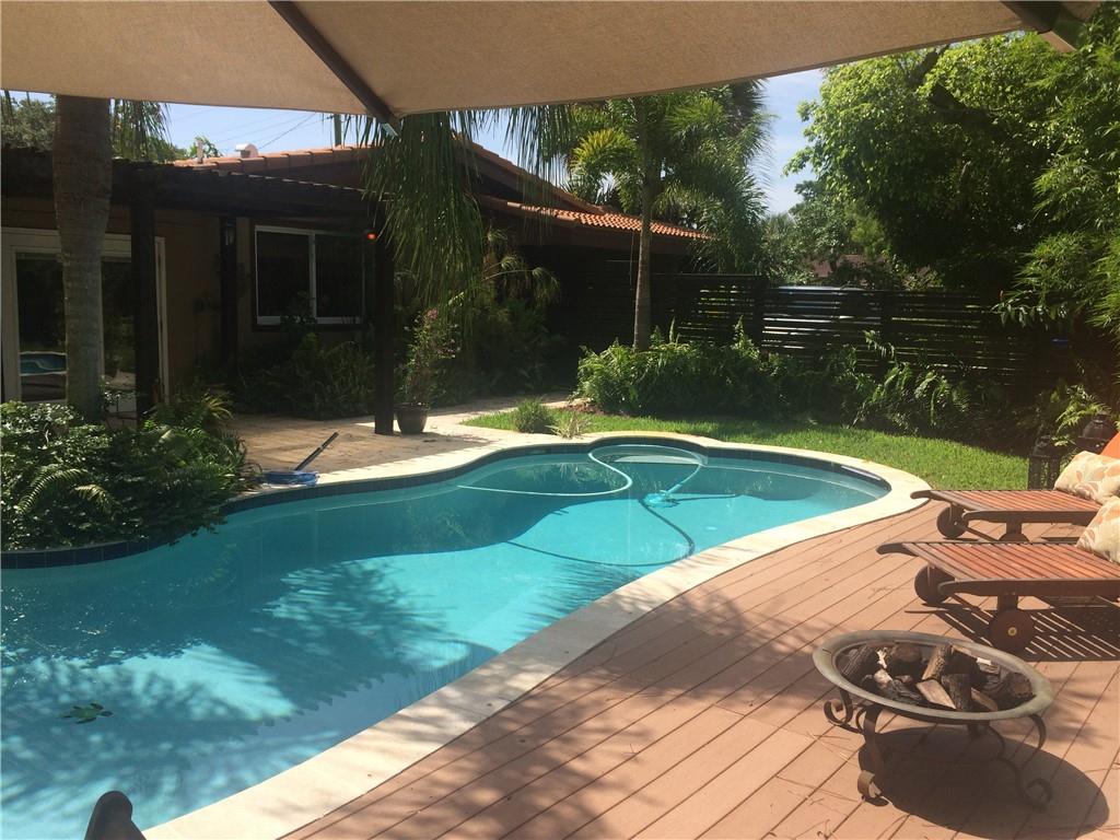 PRIVATE TROPICAL COMPOUND! PRIME EAST LOCATION IN NEIGHBORHOOD OF SHADY BANKS! WRAPAROUND CORNER LOT!, FULLY REMODELED HOUSE 2/2 WITH GUEST HOUSE 1/1! BEAUTIFULLY LANDSCAPED 30' LONG LAP POOL! MODERN OPEN FLOOR PLAN WITH GOURMET STAINLESS STEEL KITCHEN and CONCRETE COUNTER TOPS! BIG SUBZERO REFRIGERATOR, SS appliances. HURRICANE RATED WINDOWS, custom imported hurricane doors and hardware! Updated bathrooms, custom maple wood flooring! Separate 1 Bdrm 1 Bath Guest cottage. New roof. New in-ground salt water pool, waterfall, marble pavers. Near Downtown, Beaches, Airport & Marinas.