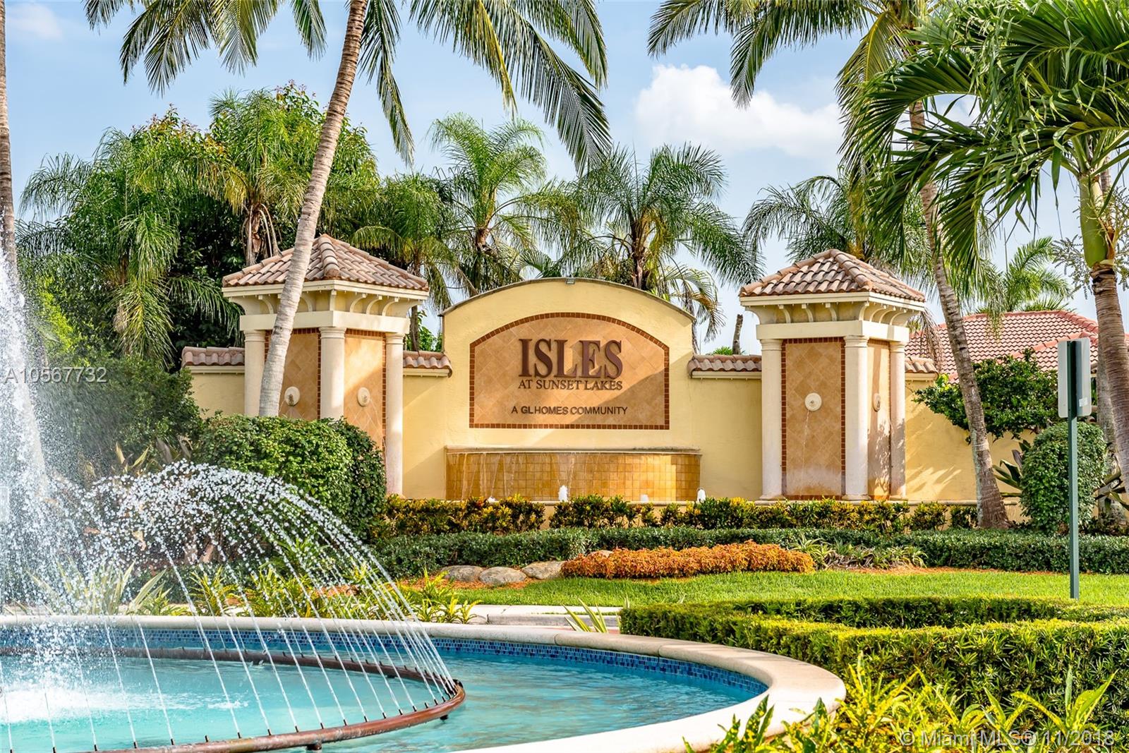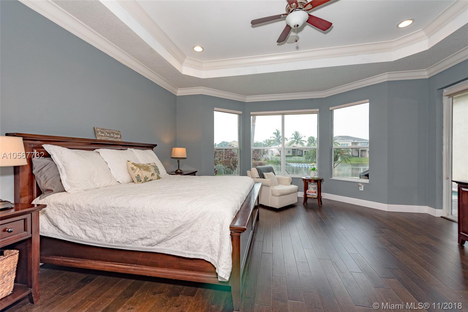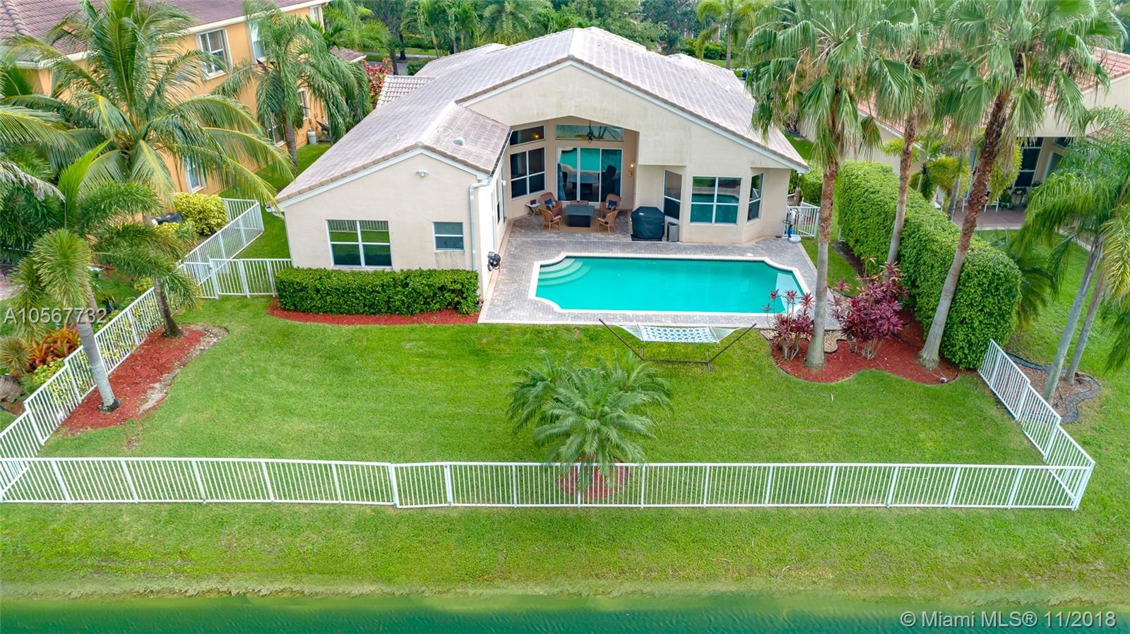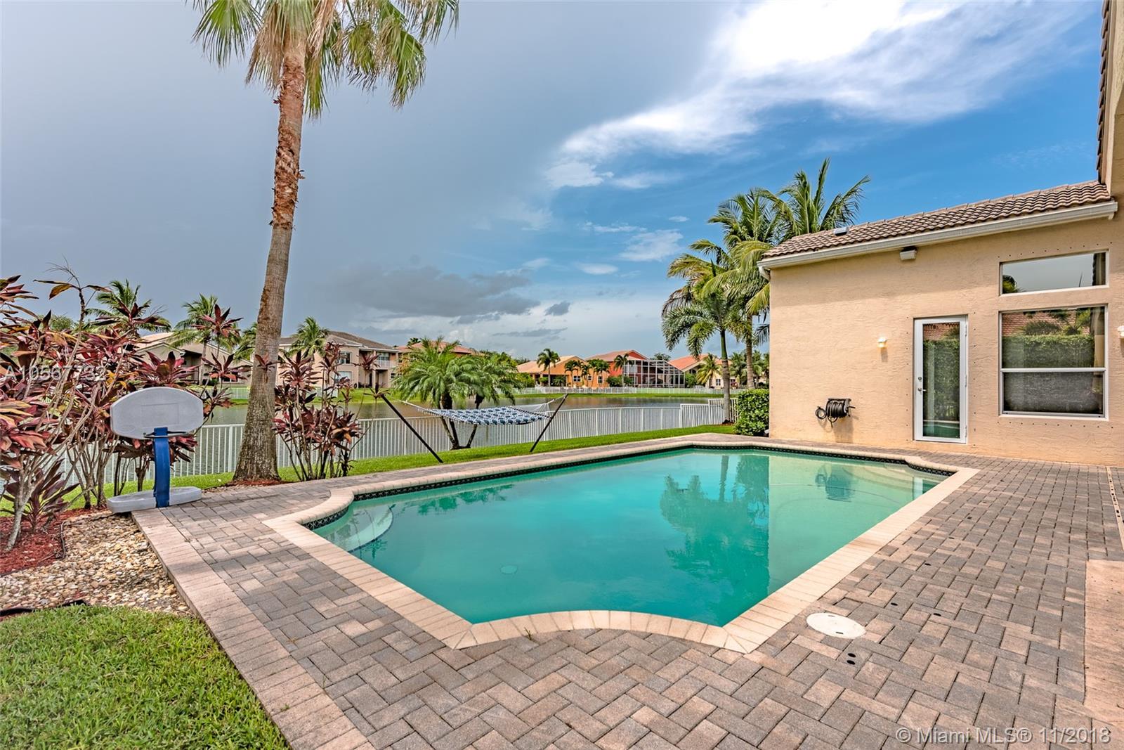 Spectacular Sofia Model home with stunning pool and great Lake view in Sunset Lakes. Home features 5 bedrooms, 3 full bathrooms, laundry room, and 2 car garage. Completely upgraded with high ceilings, tile throughout living area, wood flooring in the bedrooms, quartz countertops, and cherrywood cabinetry in the kitchen , and baths. Home is equipped with surround sound, intercom, and exterior speakers. Brand new appliances were recently installed in 2015, including 2 a/c units, double ovens, dishwasher, refrigerator, washer & dryer. Enjoy beautiful living in this lovely community at Sunset Lakes which includes, guarded gate, clubhouse, pool & spa, 8 tennis courts, exercise room, along with ADT security system, and Xfinity cable included with the HOA.