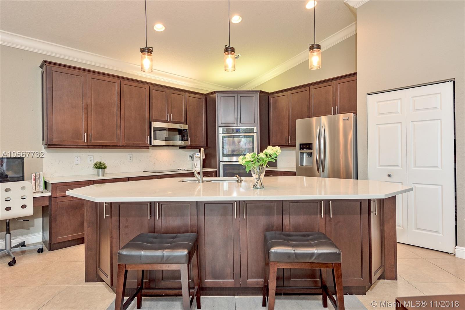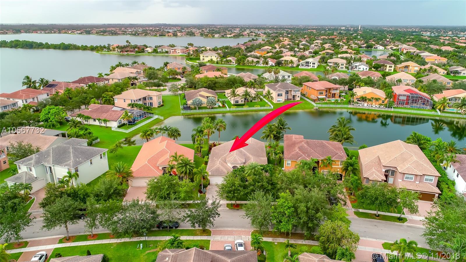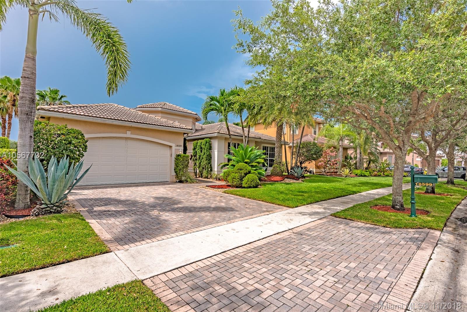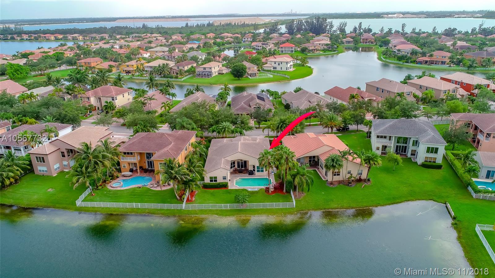 Spectacular Sofia Model home with stunning pool and great Lake view in Sunset Lakes. Home features 5 bedrooms, 3 full bathrooms, laundry room, and 2 car garage. Completely upgraded with high ceilings, tile throughout living area, wood flooring in the bedrooms, quartz countertops, and cherrywood cabinetry in the kitchen , and baths. Home is equipped with surround sound, intercom, and exterior speakers. Brand new appliances were recently installed in 2015, including 2 a/c units, double ovens, dishwasher, refrigerator, washer & dryer. Enjoy beautiful living in this lovely community at Sunset Lakes which includes, guarded gate, clubhouse, pool & spa, 8 tennis courts, exercise room, along with ADT security system, and Xfinity cable included with the HOA.
